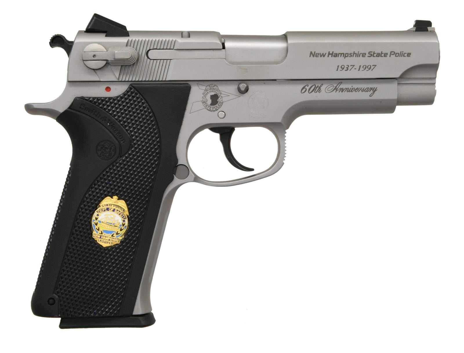 POLICE 60TH ANNIVERSARY COMMEMORATIVE PISTOL. Cal. 45ACP. S# VJP5741. Bbl.4.25". Mfg. 1997. Satin stainless frame & slide. Serrated slide w/ dovetailed 3 dot sights. Ambidextrous decocker. Black plastic wraparound checkered grips w/ NH State Police shield on both sides. Serrated front strap. Right side of slide marked; "NEW HAMPSHIRE STATE POLICE / 1937-1997". Right side of frame, forward of trigger marked "60th ANNIVERSARY" & w/ NHSP badge above trigger. Checkered trigger guard front. MAGS: 2 factory 8 rd. UNATTACHED ACCESSORIES: Hardwood display case engraved w/ NH State Police badge & "60th ANNIVERSARY 1937-1997" on top, lined w/ fitted green velvet interior. CONDITION: All aspects indicate as new. Finish is complete & consistent w/ no degradation. Display box illustrates some light scratching & corner rounding, possibly from stacking in storage or transport. Bore is bright w/ strong rifling. (23-1553/JZ). MODERN. $800-1,200.