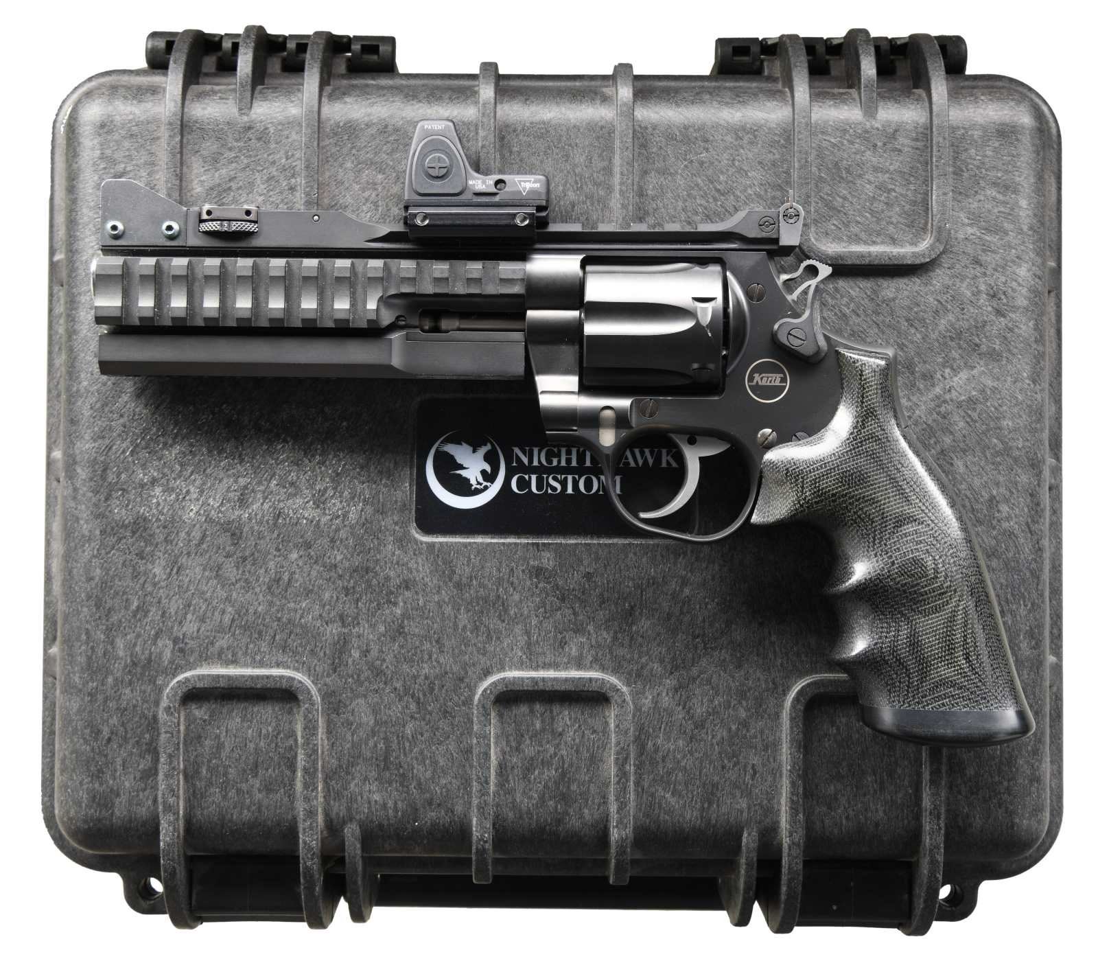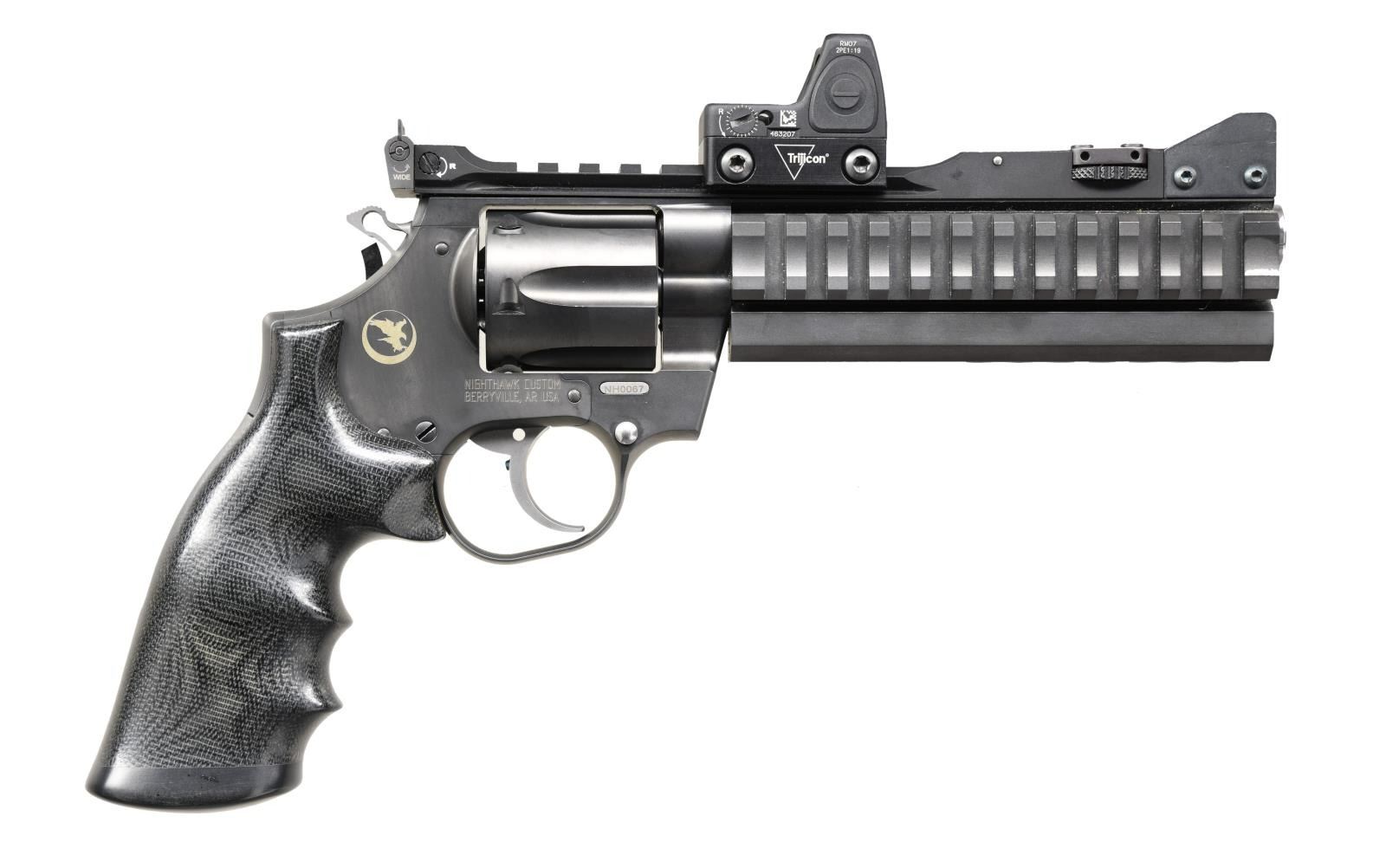 Cal. 357 Mag. S# NH0067. Bbl.6". Nighthawk Custom Super Sport STX double action competition revolver. Matte black finish. Multiple mounting options including a 4" rail on top of action as well as on left & right side of barrel. 6 shot, matching numbered, fluted cylinder. High speed hammer w/ serrated spur. Smooth trigger. Protected blade, 4 position multi distance, elevation adjustable front sight. Windage adjustable rear target sight. Barrel housing with Picatinny Rails and changeable barrel weights. Currently sporting Trijicon RM07 red dot sight. Smooth front strap & backstrap. UNATTACHED ACCESSORIES: Additional 7" weight bar w/ integral muzzle brake. Nighthawk Custom branded hard transport case. Original Trijicon RMR hard case. CONDITION: Finish coverage is complete & consistent. Very little indication of prior use. A drag line hasn't even developed on cylinder yet. Trigger is extremely smooth. Trijicon RMR sight appears to function correctly and retains clear glass. Bore is bright w/ strong rifling. (23-2399/JZ). MODERN. $3,000-5,000.