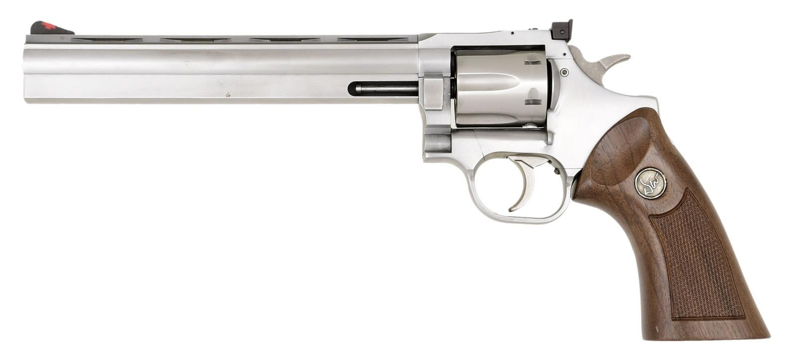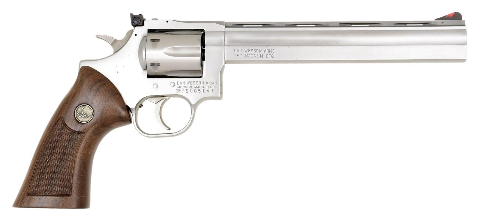 Cal. 357 Mag. S#S005163. Bbl. 8" VR. Serrated ramp blade front sight w/ red insert. Adjustable rear sight. Stainless finish. Checkered hardwood grips w/ gold Dan Wesson medallions. CONDITION: grips show scattered handling marks & some light scratches. Metal has a drag line on cyl., a few specks of light oxidation & some handling wear. Very good bright bore. (23-4921/MJC). MODERN. $800-1200.