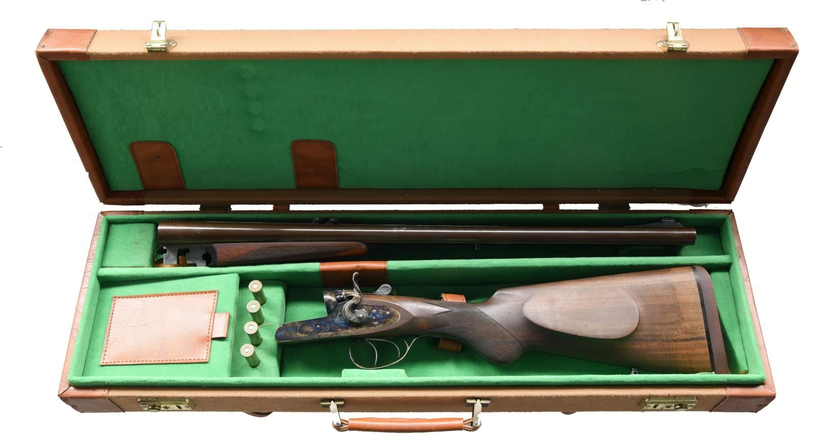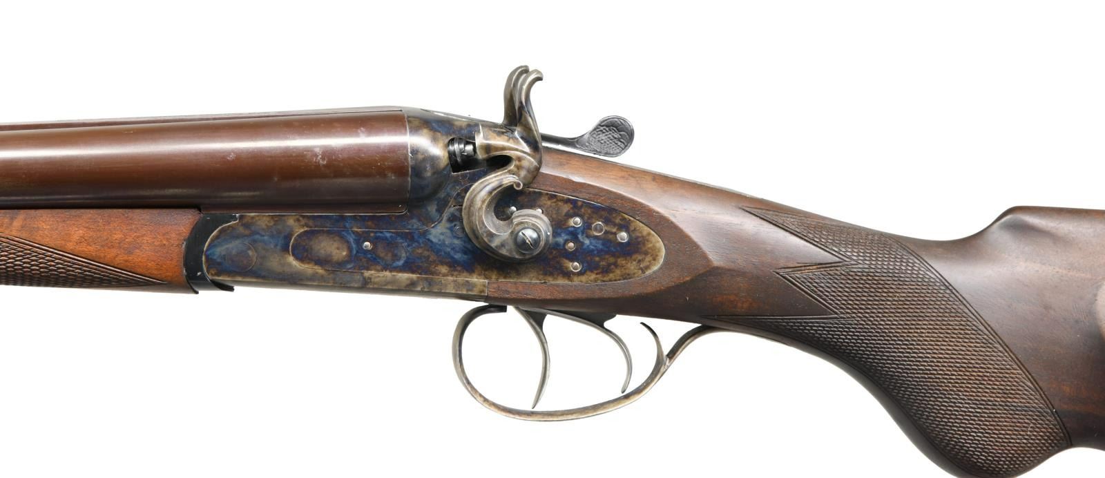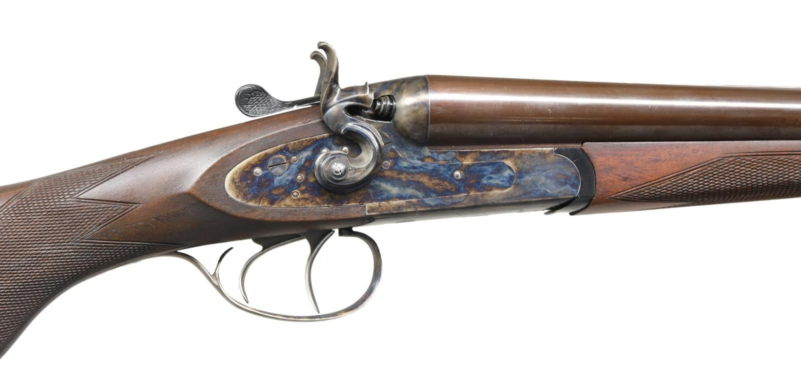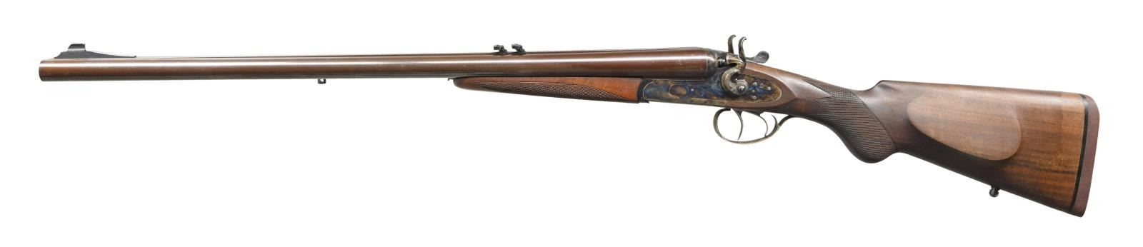 RIFLE. Cal. 45-70. S# C5494 (AU = 1989). Brown finished 24" bbls. w/ ramp mounted bead front sight & 2 flip up rear sights. Case colored sidelock hammer action w/ rebounding hammers, dbl. triggers & extractors. Checkered splinter forearm w/ Anson release. Rnd. knob pistol grip cheekpiece stock w/ sling stud. LOP: 14 1/8" to red pad. UNATTACHED ACCESSORIES: brown cloth hard case w/ leather trim & green cloth partitioned interior. Includes 4 rounds of 45-70, sling, warranty card, key & extra firing pins. CONDITION: very good brown bbl. finish having large spot of strike marks along w/ scattered light handling marks. Very good case colors w/ varnish peeling. Near excellent forearm finish. Very good buttstock finish w/ light handling marks & buttpad area having noticeably lighter tone finish. Near excellent bores. Very good case w/ interior cloth showing deterioration, fraying on leather trim, patina on locks & handle hinges. PROVENANCE: From the estate collection of Thomas J. Mulligan. (23-2223/MD). MODERN. $1,500-2,250.