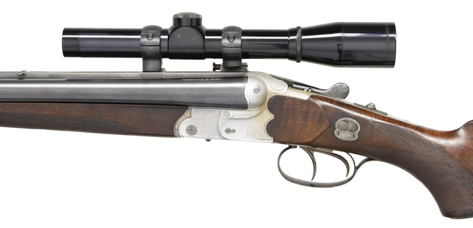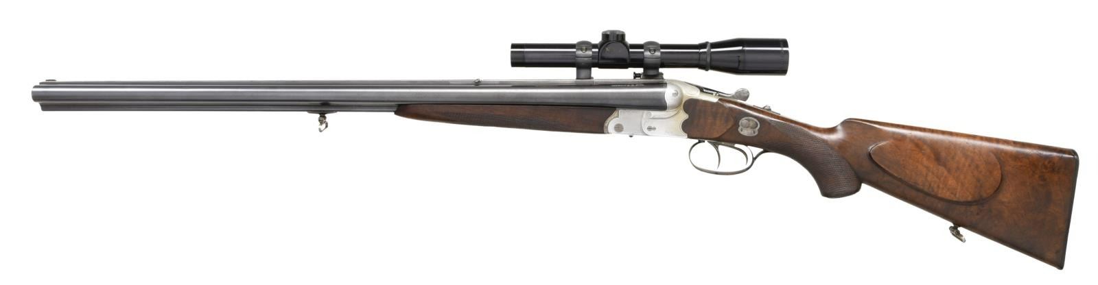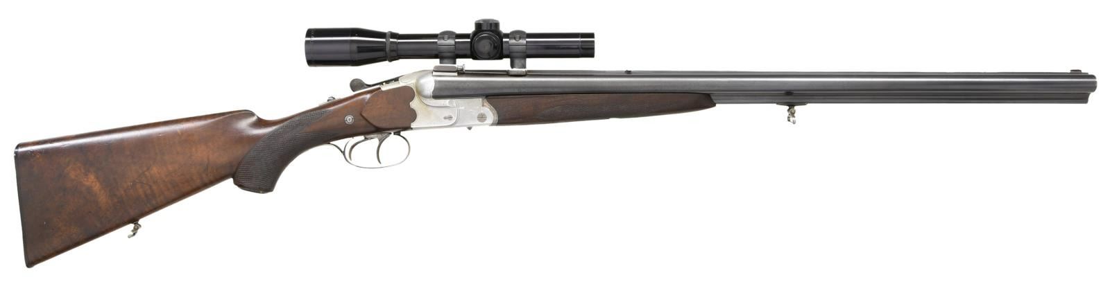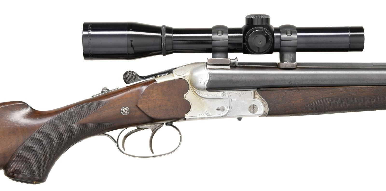 Cal. 16 Ga., 2 1/2" / 5.6x52R (22 Savage Hi-Power). S# 37311 (5 37 = May 1937). Krupp Laufstahl 25 1/8" bbls. w/ matted raised rib, blade front sight, pop up rear sight, rib extension & swivel on bottom bbl. Full chokes. Top of right tube has claw mounts holding Burris 1 1/2x 20mm scope w/ duplex reticle on Leupold style rings altered to fit claw mounts. Top of bbls. have R. Habermayr of Straubing (Bavaria, Germany) retailer proofs. Water table has pre War Suhl, Germany May 1935 & May 1937 proofs. Gray Dural Blitz style action w/ Greener style safety, side clips, cocking indicators, dbl. triggers, extractors & top tang bbl. selector. Checkered walnut forearm w/ matching numbered Deeley release. Checkered walnut pistol grip stock w/ left side cheekpiece, horn grip cap & toeline swivel. LOP: 13 3/8" to Greifelt horn buttplate. WEIGHT w/ scope: 7.14 LBS. CONDITION: bbls. have very good blue finish w/ pinprick patina, light marks & wear around muzzle. Good gray finish mixing w/ patina & having light marks. Forearm iron & triggerguard plate has faded blue to gray patina. Wood has worn appearance w/ flattened checkering, numerous impressions, scratches & marks. Buttstock has large & sm. cracks throughout. Fair buttplate w/ holes & chipped at toe. Shiny bores w/ sm. dents in shotgun bores. Scope has very good finish w/ clear, serviceable optics. PROVENANCE: From the Estate of Jon Thomas. (23-1655/MD). CURIO. $1,500-2,250.