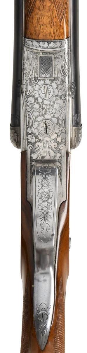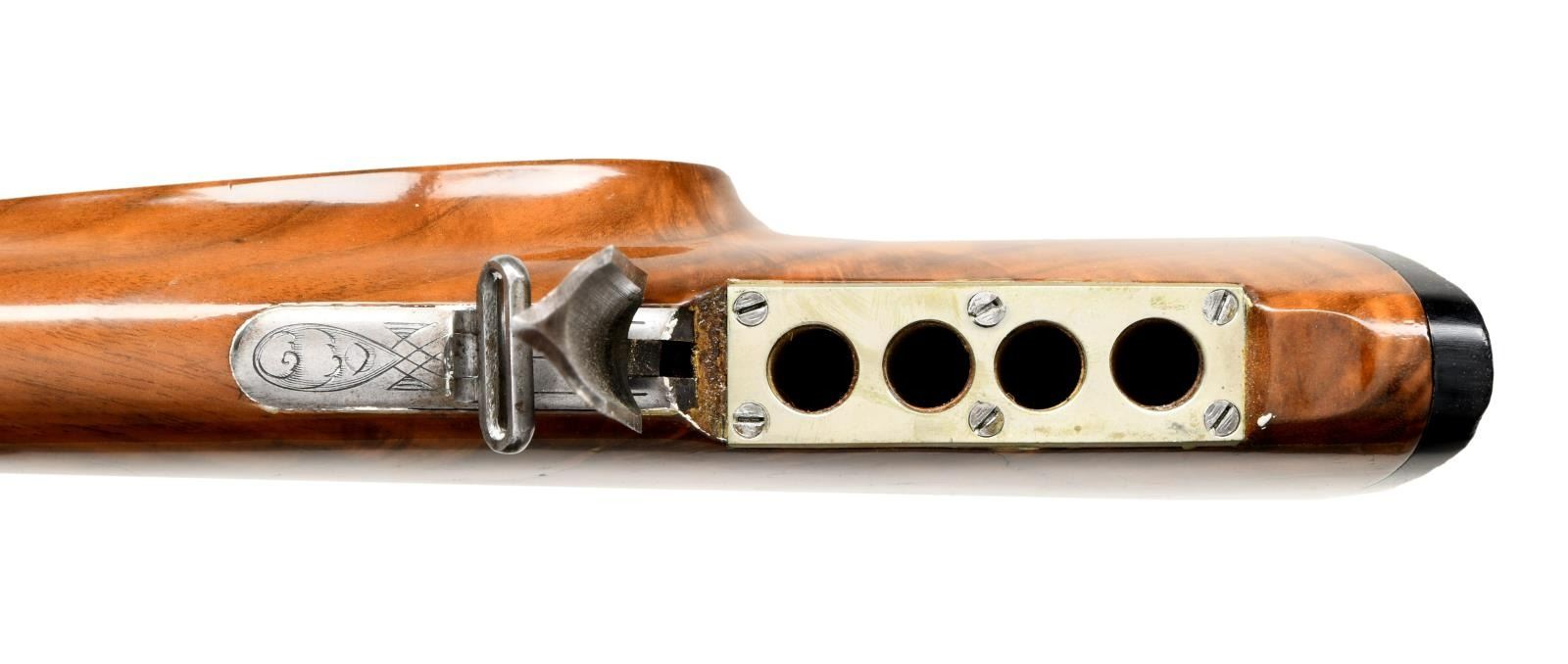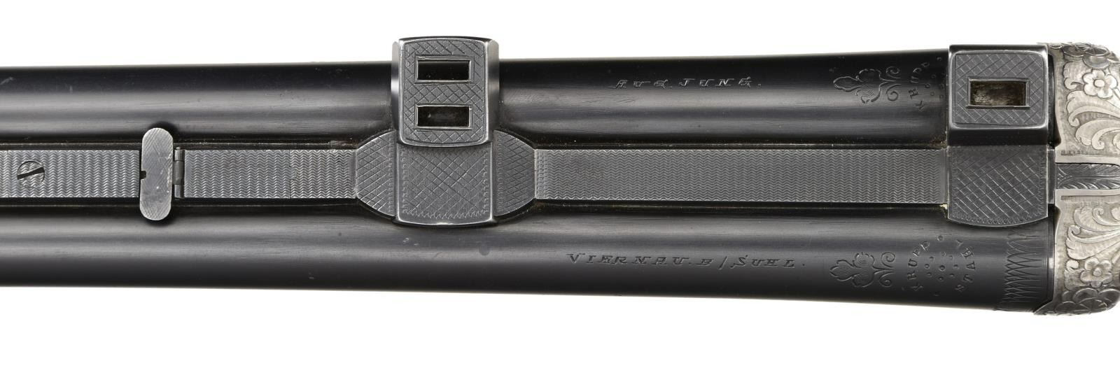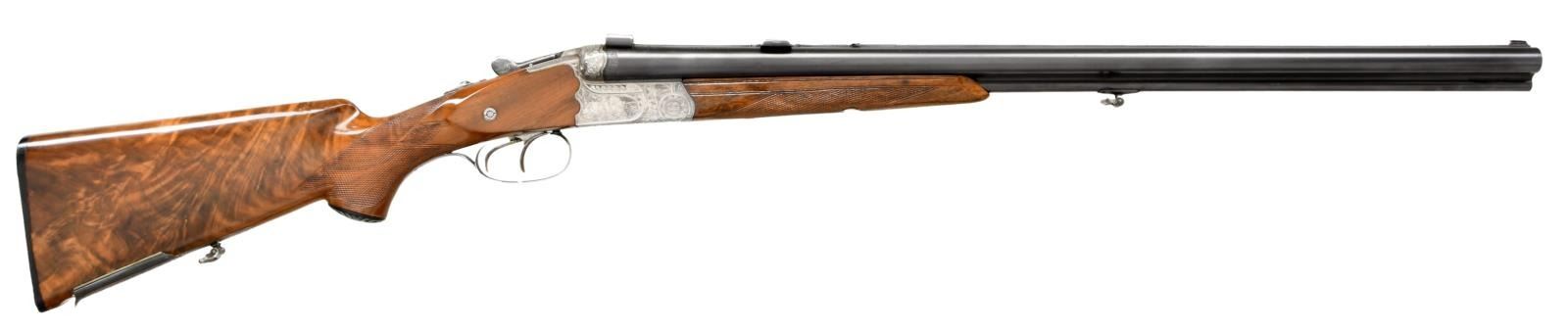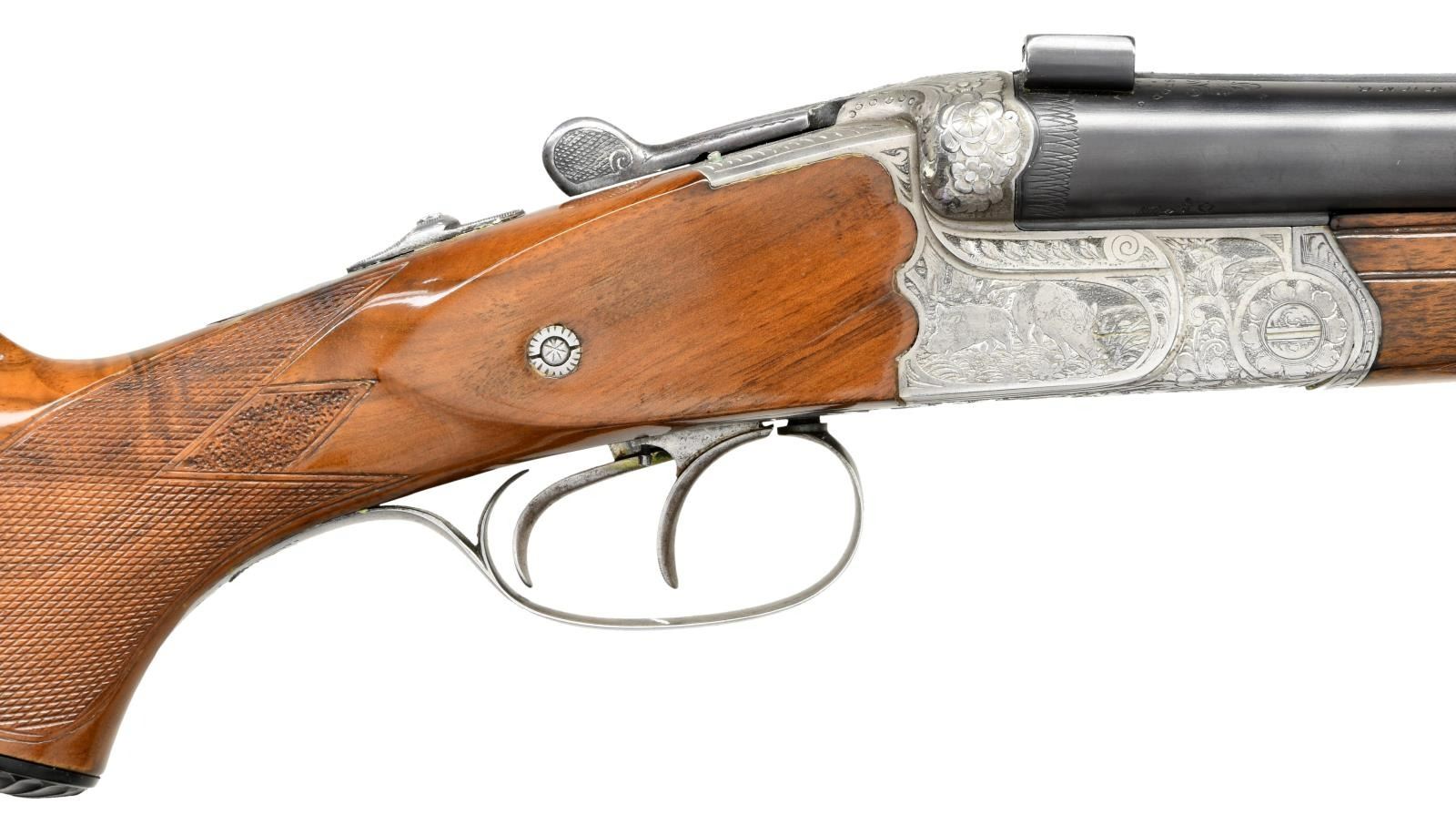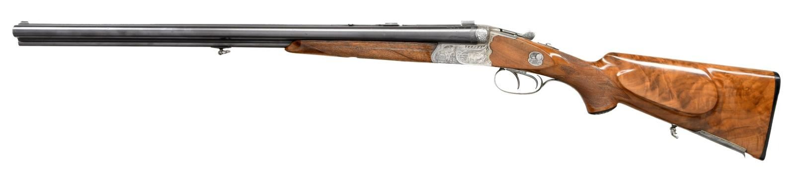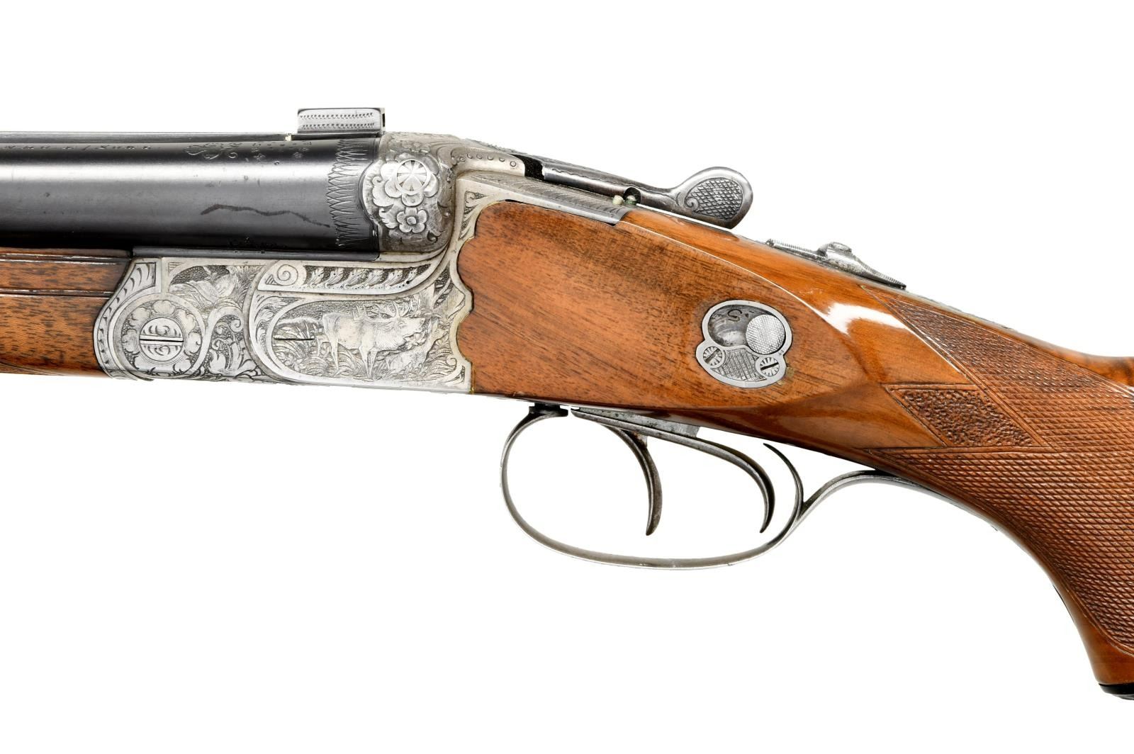 Cal. 16 Ga., 2 5/8" / 8x57JR. S# 58 (534 = May 1934). Krupp Stahl 25 5/8" bbls w/ matted raised rib having blade front sight, pop up rear sight & mounts of claw rings. Bottom bbl. has sling swivel. Water table has May 1934 & Sept. 1949 German Nitro proofs. Scalloped boxlock action w/ Greener style safety, side clips, cocking indicators, dbl. triggers, extractors & top tang bbl. selector. Receiver has semi relief engraving of wood scenes featuring Elk & doe on left side, 2 boars on right side w/ corresponding quails. Action is highlighted w/ floral & scroll engraving that extends to the bolsters & triggerguard bow. Walnut forearm w/ matching numbered Deeley release. Pistol grip walnut stock w/ striking burl figure, scalloped grip cap, swivel & cartridge trap. LOP: 13 1/4" to black composite buttplate. DAC: 1 1/2". DAH: 2 1/4". CAST: slight cast in. MEASUREMENTS: Bore Diameter: R- .656, .656. L - Choke Constriction: R - .019, L - .019. WEIGHT: 7.47 LBS. CONDITION: very good bbl. blue showing light marks & pinprick patina. Bright finish action w/ verdigris on cocking indicators, white paint spots, & epoxy filler. Wood has been sanded, gloss finished, & recheckered having a very good appearance. Cartridge trap installed w/ white paint spots & epoxy filler. Bright shiny bores w/ scattered sm. dents on shotgun bores, light fouling around choke areas, & strong rifling. (23-2155/MD). CURIO. $1,000-1,500.