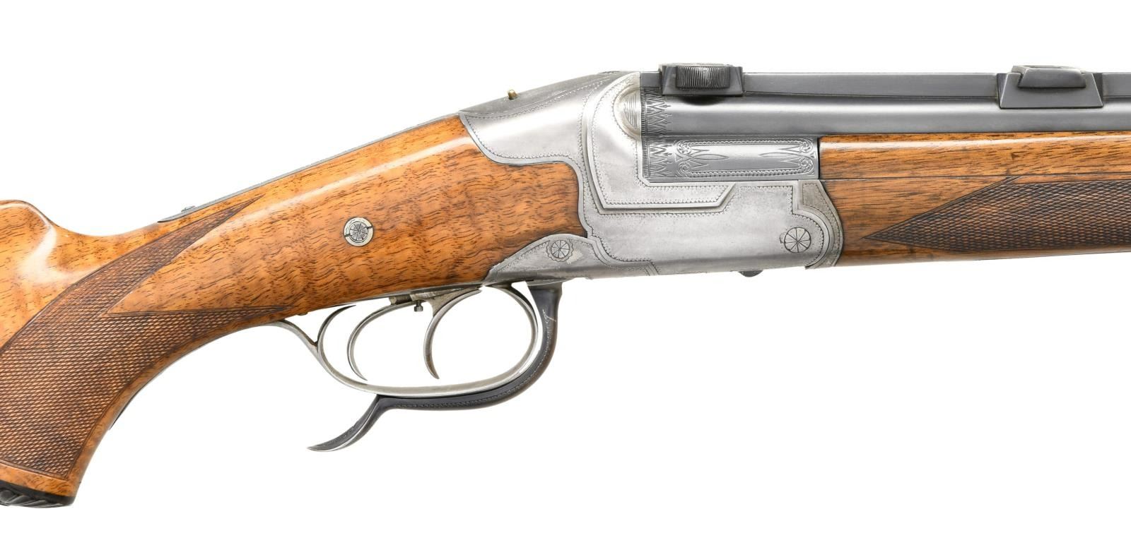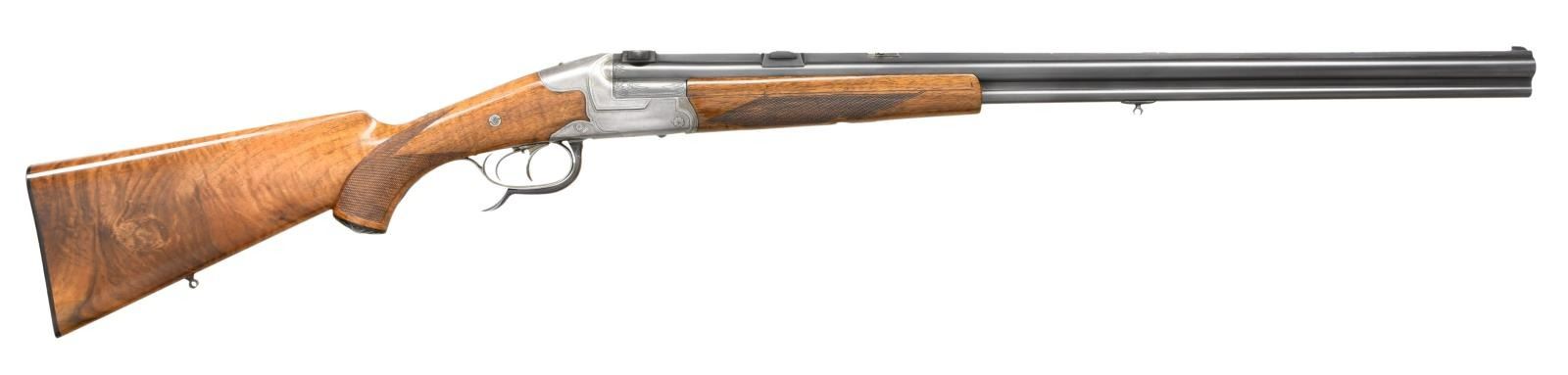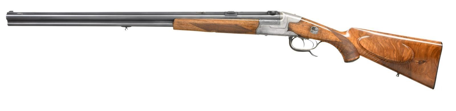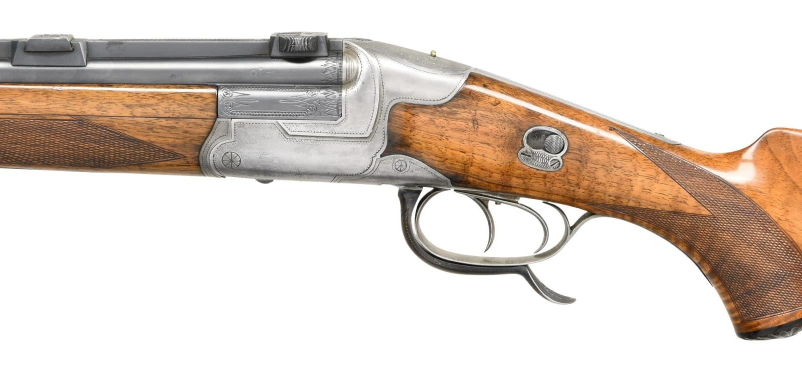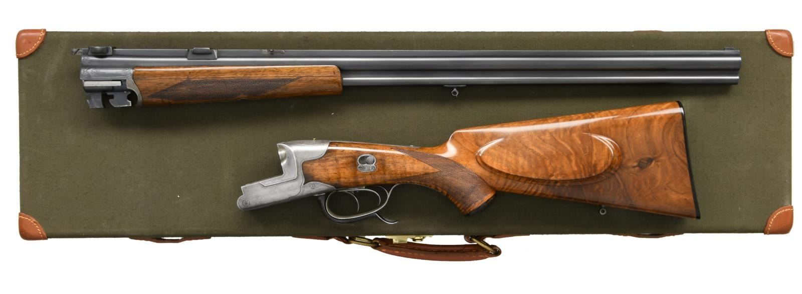 RETAILED BY JOHANN PETERLONGO. Cal. 16 Ga. (410 Subguage) over 6.3x58R. S# 5633 (4.26 = April 1926). The 26 7/8" bbls. w/ top matted rib having blade front sight, pop up rear sight & added claw mounts; front claw mount partially obliterated retailer marking "JOH PETERL". Bbl. water table has April 1926 & August 1928 German Nitro proofs. Underlever action w/ Greener style safety, dbl. set triggers, extractors, & cocking indicators. Walnut forearm & pistol grip stock w/ scalloped horn grip cap, sling eye on toeline & left side cheekpiece. Forearm has Deeley release. LOP: 13 14/" to buttplate. DAC: 1 1/2". DAH: 2 1/2. CAST: slight cast out. WEIGHT: 6.47 lbs. UNATTACHED ACCESSORIES: Briley Top bore .418 sub gauge choke tube. Unmarked green cloth luggage case w/ green felt partitioned interior. CONDITION: bbls. have very good refreshened finish w/ light marks on rib around mounts. Receiver has faded to gray w/ spots of patina. Wood has been refreshened w/ gloss finish & recut checkering. Buttplate appears horn w/ marks & one "worm" hole. Bright shiny bores w/ rifle having strong rifling & light frosting in the grooves. Case in very good condition w/ light marks. (23-2131/MD). CURIO. $1,000-1,500.