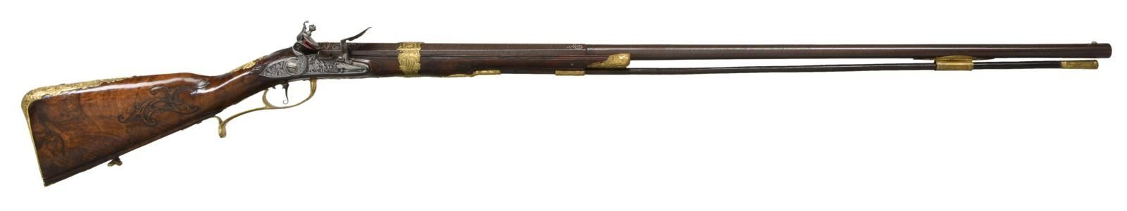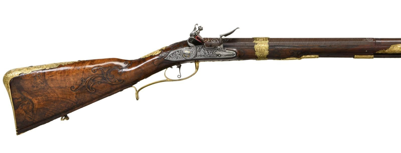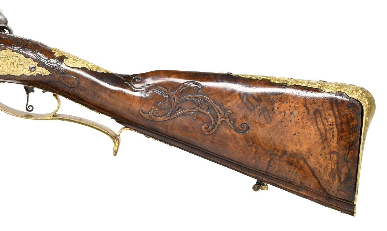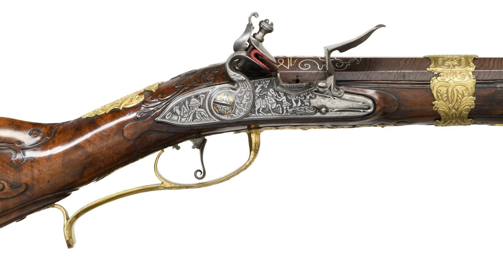 FLINTLOCK FOWLER. Cal. 60. S# NSN. The 39" twist octagon to round barrel is inlaid with flush silver wire in the form of scroll and geometric patterns. A large crowned platinum poincon at breech end is marked "ROCH" "US" "SUHL" "DUT" (?) . A second mark is of a trotting horse (maker not found). Barrel tang with scroll engraving is marked "2". Chamfered lock with serpentine cock has inset faceted pan, unbridled friction frizzen, feather spring has large scrolled finial. Lockplate and face of cock are very finely relief engraved with scenes of horse and rider, pipe playing pan, along with helmets and arms. Half stock of crotch figured European walnut attaches to barrel with slip on gilded brass collar in Viennese manner. Mouldings are around lock, sideplate, barrel channel and other gilded brass fittings. Raised carved scroll is around trigger guard tang and at juncture of grip and butt. A deep moulding runs along toeline. All fittings are of very fancy relief cast brass that has been gold plated. These decorations are in the form of human and animal figures surrounded by acanthus scroll. Hickory ramrod with brass tip mounts through single brass pipe soldered to bottom of barrel with another smaller pipe mounted in stock with matching thimble. CONDITION: fine as attractively restored. Barrel retaining over 90% brown finish with excellent definition to pattern. Lock is cleaned to silver gray. Stock has French polish refinish over many old marks and has some subsequent scratches. Brass furniture has been re-gilded and is quite bright. Bore is fairly shiny but shows some pitting. Lock is good. (01-23959/MGM). ANTIQUE. $4,500-6,500.