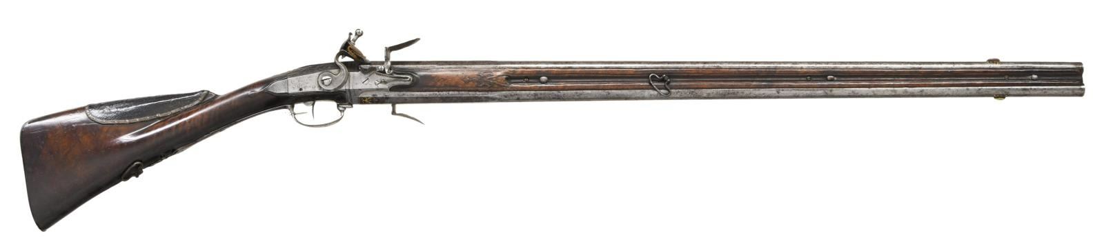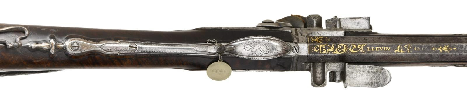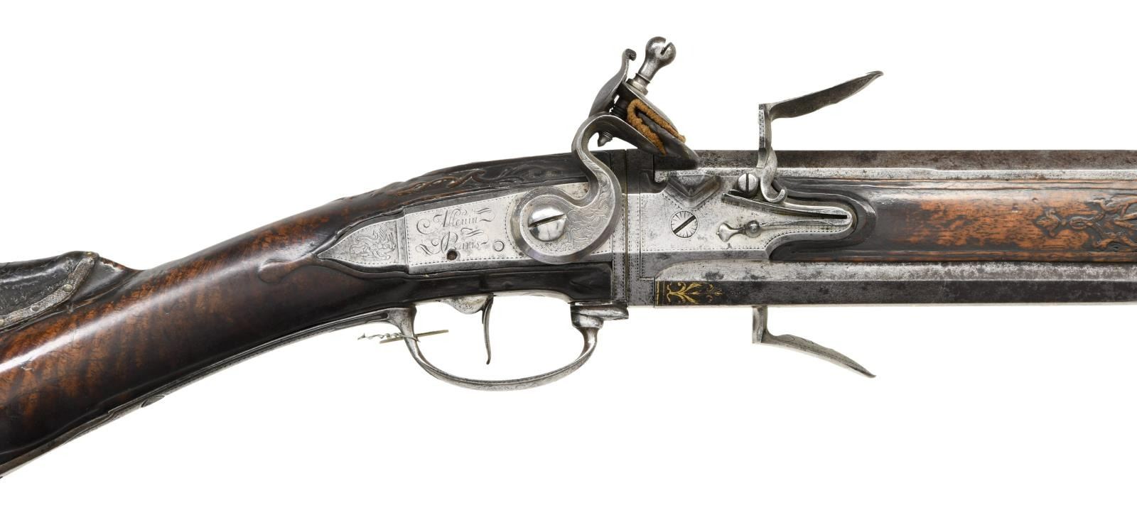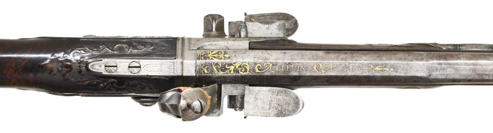 ALLEVIN OF PARIS EX. WILLIAM KEITH NEAL COLLECTION. Cal. 20 Bore. S# NSN. Most likely made by Jean Babtiste Claude Allevin who was working in Paris between 1750-96, who was presumably the son of Tristan who died in 1747. This attractive gun has 33-1/4" rotating barrel set with barrels being octagonal at breech ends and transitioning to 16 sided toward muzzles. Top flats of barrels are gold inlaid with acanthus scroll surrounding "Allevin Paris". Breech ends are also fitted with front portions of locks with integral faceted pans, unbridled friction frizzens and feather springs with bulbous finials. Serpentine cock is on rear portion of lock which has heavy faceted plate with rebated tail. Maker's name and address are on plate behind cock. Barrels rotate and are indexed in place with release mechanism actuated by squeezing front portion of trigger guard bow. Roman nose buttstock of fiddle figured European walnut is iron mounted and comb is fitted with tacked on leather pad. Relief carved finial of steel trigger guard has been cut to accommodate pad. All furniture is very nicely carved and engraved with vignettes of game animals. Barrel set has inset wooden sides which are pinned to barrels with side bolts. One side holds green heart ramrod with horn tip which mounts through two beaded steel pipes and matching thimble. CONDITION: good. Most metal parts show light cleaning to silver gray patina with many minor splotches and light pitting scattered on barrels. Stocks exhibit a very old oil finish with numerous light marks with considerable softening of raised carving and drop points. Bores appear to be good although dusty. Mechanically good. Finial of one feather spring missing. With original W. Keith Neal Collection tag attached (G100). (01-21987/MGM). ANTIQUE. $3,500-5,500.