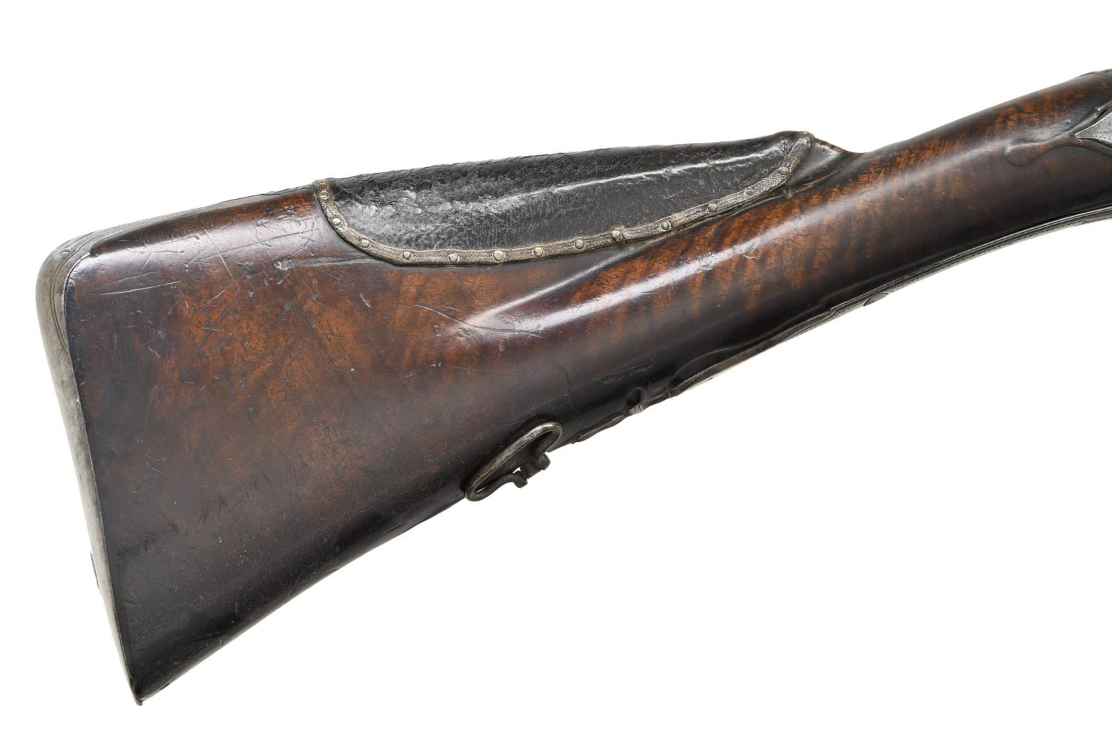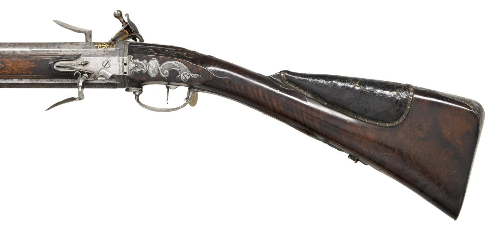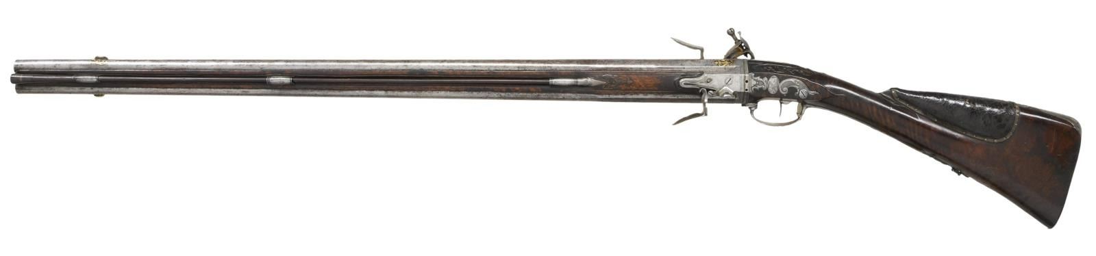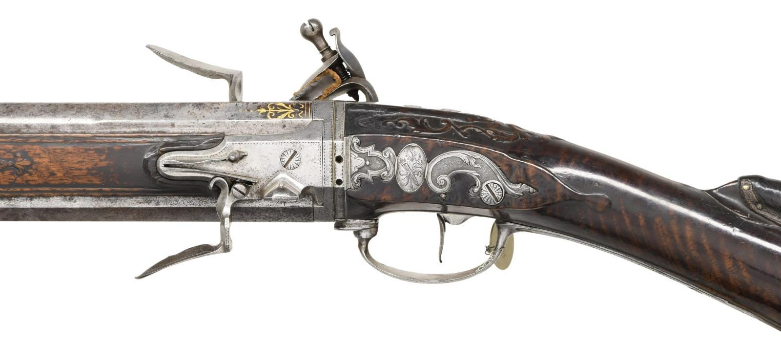 ALLEVIN OF PARIS EX. WILLIAM KEITH NEAL COLLECTION. Cal. 20 Bore. S# NSN. Most likely made by Jean Babtiste Claude Allevin who was working in Paris between 1750-96, who was presumably the son of Tristan who died in 1747. This attractive gun has 33-1/4" rotating barrel set with barrels being octagonal at breech ends and transitioning to 16 sided toward muzzles. Top flats of barrels are gold inlaid with acanthus scroll surrounding "Allevin Paris". Breech ends are also fitted with front portions of locks with integral faceted pans, unbridled friction frizzens and feather springs with bulbous finials. Serpentine cock is on rear portion of lock which has heavy faceted plate with rebated tail. Maker's name and address are on plate behind cock. Barrels rotate and are indexed in place with release mechanism actuated by squeezing front portion of trigger guard bow. Roman nose buttstock of fiddle figured European walnut is iron mounted and comb is fitted with tacked on leather pad. Relief carved finial of steel trigger guard has been cut to accommodate pad. All furniture is very nicely carved and engraved with vignettes of game animals. Barrel set has inset wooden sides which are pinned to barrels with side bolts. One side holds green heart ramrod with horn tip which mounts through two beaded steel pipes and matching thimble. CONDITION: good. Most metal parts show light cleaning to silver gray patina with many minor splotches and light pitting scattered on barrels. Stocks exhibit a very old oil finish with numerous light marks with considerable softening of raised carving and drop points. Bores appear to be good although dusty. Mechanically good. Finial of one feather spring missing. With original W. Keith Neal Collection tag attached (G100). (01-21987/MGM). ANTIQUE. $3,500-5,500.