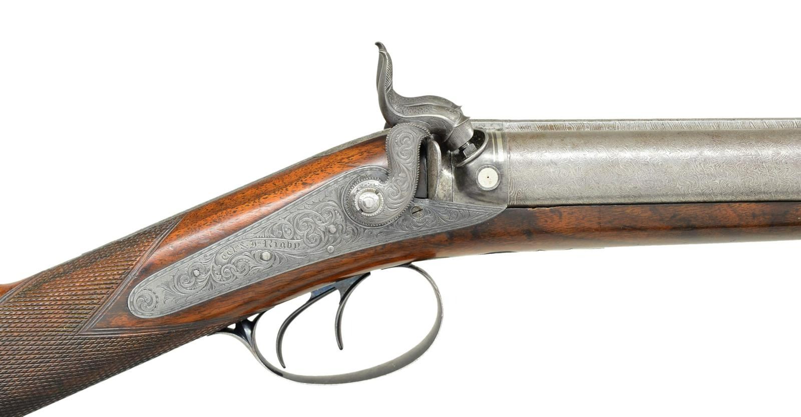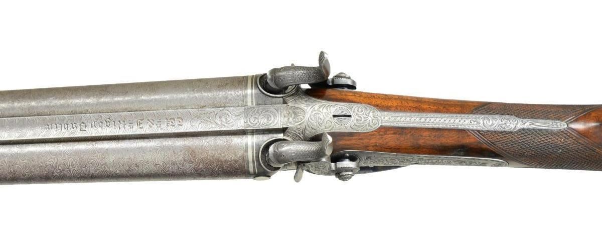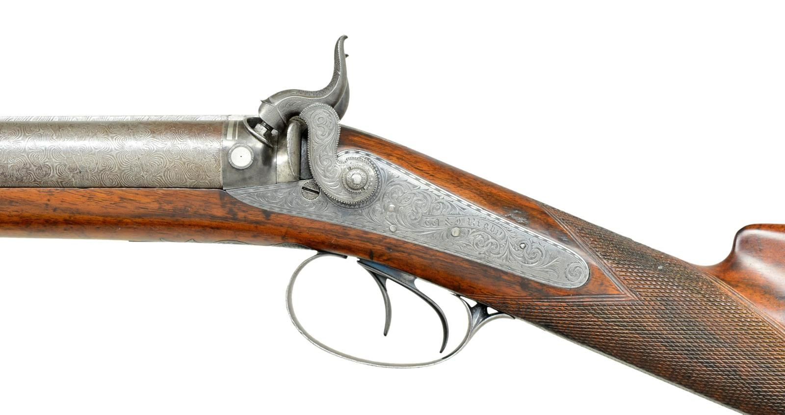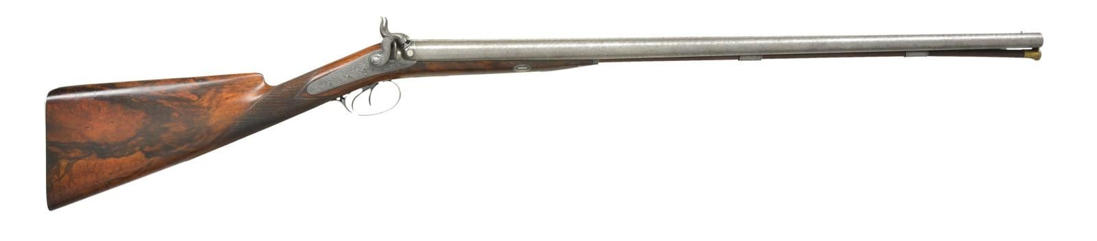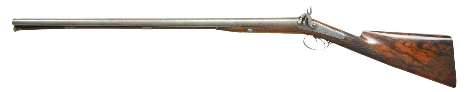 AND ACCESSORIES. Cal. 14 bore. S# 8252 (CA 1840). John Rigby was the first in Great Britian to make true Damascus barrels and their product was usually given an etched finish enhanced by bright polish. The 30" barrels on this gun exhibit that quality and are engraved "Wm & Jn Rigby Dublin" on slightly raised game rib. Patent breeches are inlaid with platinum lines and are fitted with vented platinum blow outs. Breech iron is semi-relief engraved with well done interwoven scroll. Back spring locks with round faced hammers having dolphin heads are engraved with matching scroll. Maker's name is in ribbon on each lockplate. Trigger plate has very stylized pineapple finial. Trigger guard is engraved with Spaniel flushing a partridge on bow, S# is on tang which has Celtic knot engraving. Stock of very finely marbled, stump figured European walnut measures 14 7/8" over steel buttplate with long scroll engraved top tang. Flat top point pattern checkering is at grip. Stock attaches to barrels with captive sidebolt through oval silver escutcheons. Greenheart ramrod with brass head and tail (worm under tail) mounts through two beaded pipes and thimble which matches trigger plate. MEASUREMENTS: STOCK: DAH: 2 1/8". DAC: 1 1/2". CAST: neutral. LOP: 14 7/8". WEIGHT: 7 lb. 8 oz. UNATTACHED ACCESSORIES: gun is housed in its original mahogany case with inlet brass corners. A circular "D" ring handle with central medallion is on top. Case has dual pivoting hook and key lock closure (gun S# is stamped in wood to left of lock). Case is lined in green cloth and has paper Rigby label in lid. Bottom compartment contains fluted copper bodied powder flask by Hawksley, leather shot flask by Dixon, dusting brush, powder measure, brass capper by Sykes, ebony handled turn screw, ebony handled nipple jag, large and small oil bottles by Dixon, a wad punch marked "14" and a tin for Rigby's improved copper caps containing mop, Turks head and spare lock screws. CONDITION: very good as lightly refinished. Barrels with cleaning to bright polish, traces of case hardening color remain on breech and lockplates. Trigger guard shows slight traces of blue but it and buttplate are mostly silver gray. Stock shows light oil refinish with subsequent marks, checkering cleaned up. Bores are shiny with frosting evident toward muzzles, three position locks are fine. Case exterior shows varnish refinish with some light marks. Cloth in lid replaced, label reinstalled. Bottom compartment is fine with solid partitions, accessories are fine. (01-22002/MGM). ANTIQUE. $3,500-5,500.