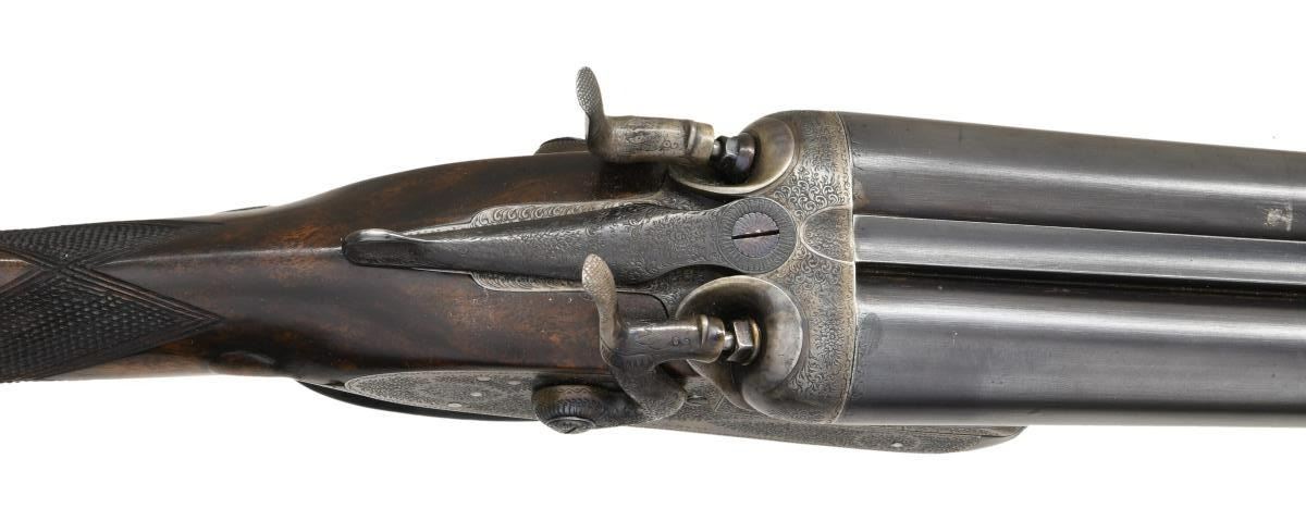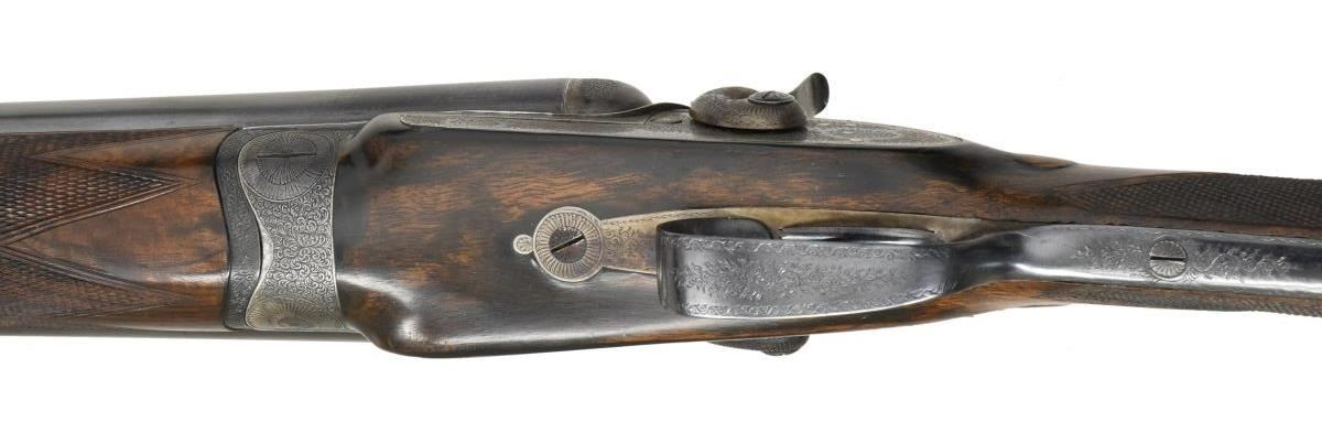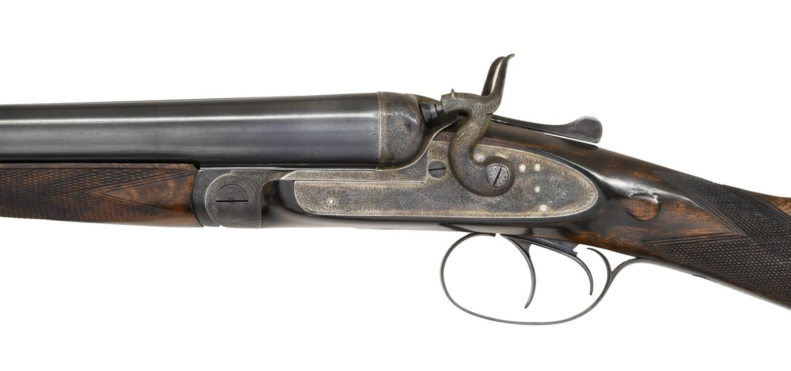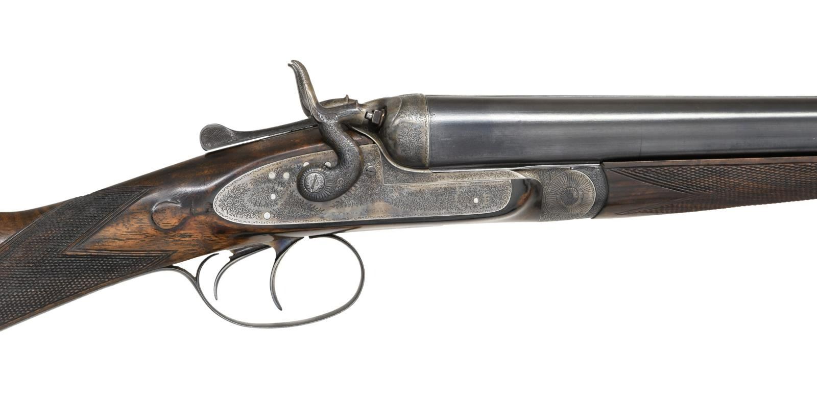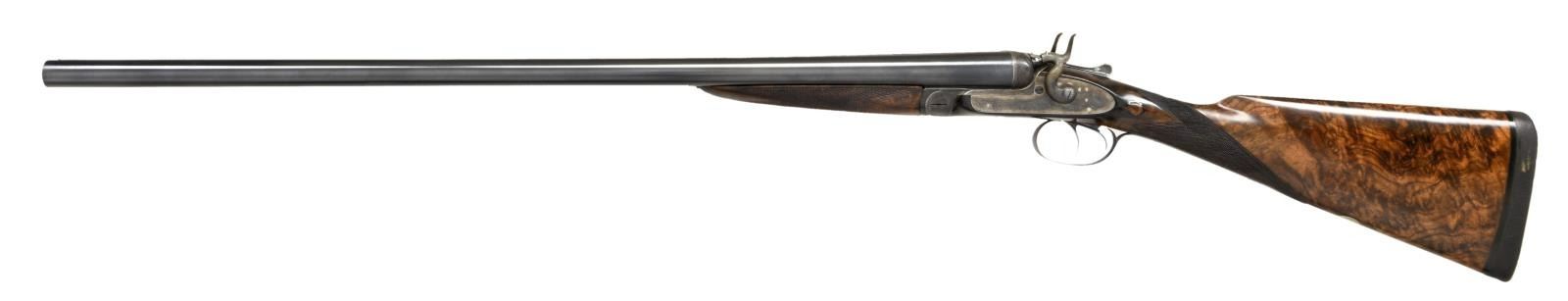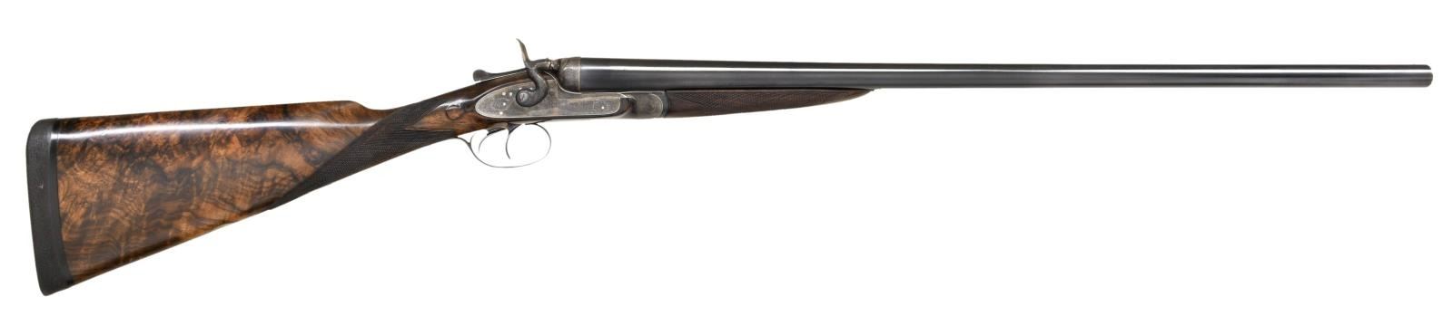 HAMMER GUN. Cal. 12 Ga. 2-3/4". S# 10330 (1879). The 28" sleeved barrels are marked "J. Purdey & Sons 314 1/2 Oxford St. London" on narrow game rib. Barrel flats are stamped with Birmingham nitro proofs and 1973 London nitro re-proofs for 2-1/2" chambers and "SLEEVED". Case hardened top lever bar in wood Purdey action is fitted with front spring locks with round bodied serpentine rebounding hammers. Action and locks are engraved with near full coverage classic Purdey style miniscule shaded scroll with rose bouquet highlights as most likely done by head engraver James Lucas. "J. Purdey & Sons" is on each lockplate and top lever is engraved "Patent". S# is on trigger guard tang. Straight grip buttstock is made from a truly exceptional piece of burl figured European walnut and measures 14-5/8" over black "Decelerator" pad. Stock also features drop points, point pattern grip checkering and a vacant silver oval. Matching splinter forend has Anson release. Iron is stamped with unknown actioner's mark, a six pointed star. MEASUREMENTS: BBLS: Bore Diameter: L .729. R .729. Restriction: L .014 (Mod). R .011 (Lt. Mod). Wall thickness: L .030. R .036. STOCK: DAH: 2-1/16". DAC: 1-7/16". CAST: neutral. LOP: 14-5/8". WEIGHT: 6 lb. 12 oz. CONDITION: good as refurbished. Sleeved barrels retain nearly all of a good quality re-black. Action and locks retain nearly all of a re-color that is a good approximation of original type. Buttstock heavily refinished with softening to sharp edges, checkering haphazardly re-cut, pad is relatively new. Renewed forend wood matches fairly well, checkering good with little wear. Bores are bright and shiny. Action is tight. Wood shows epoxy repairs at bottom front of right lock and behind hinge area which is not unusual for bar in wood guns. Locks are good. Right hammer most likely a replacement. (01-23910/MGM). ANTIQUE. $3,000-4,000.