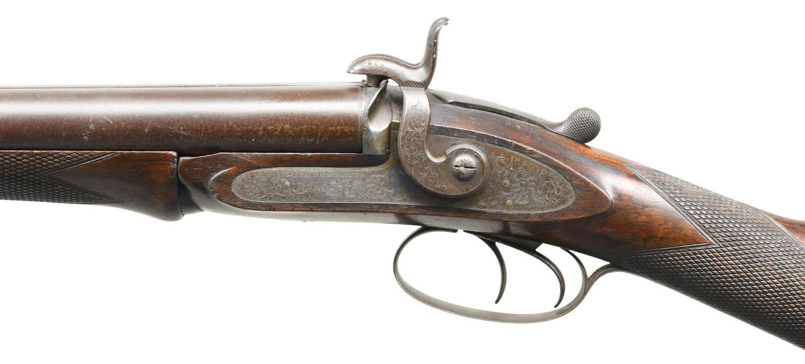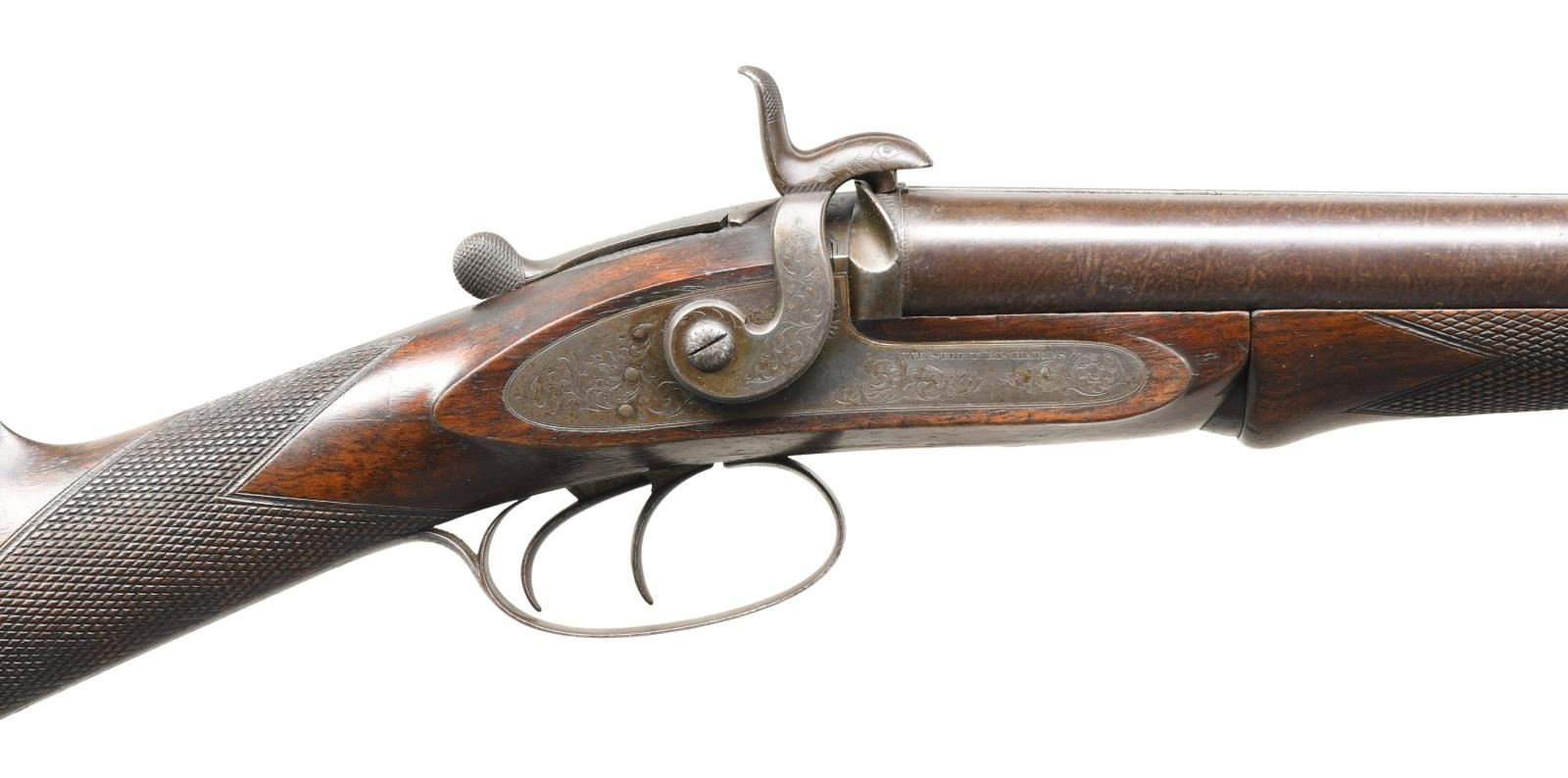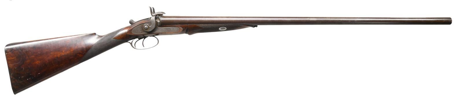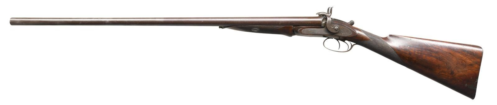 DOUBLE SHOTGUN. Cal. 12 Ga., Pinfire. S# a3743. The 30" damascus barrels are engraved with Westley Richards name and London address along with patent date for dolls head extension on concave game rib. Bottoms of barrels are stamped with Birmingham black powder proofs and S#'s. Bar in wood action fitted with Westley Richards famous sliding top fastener has island type front spring locks with non rebounding flat bodied serpentine hammers having dolphin heads. Top lever is engraved "WESTLEY RICHARDS" "PATENT" and maker's name is on each lockplate. Action and locks are engraved with 60% coverage exceptionally well cut shaded scroll. Blued trigger guard with scroll on bow has S# on tang. Well marbled and stump figured European walnut straight grip buttstock measures 14 1/8" over blued steel buttplate with scroll engraving on short top tang. Flat top point pattern checkering is at grip and a vacant silver rectangle is on toeline. Matching crab knuckle joint forend with shaped horn tip attaches to barrel with captive side bolt through oval silver escutcheons. MEASUREMENTS: STOCK: DAH: 2 7/8". DAC: 1 11/16". CAST: neutral. LOP: 14 1/8". WEIGHT: 7 lb. 5 oz. CONDITION: very fine, but gun is very dirty and would profit from a careful cleaning. It appears that metal retains 70% original finish with considerable darkening due to grime, darkened oil and light rusting. Stocks retain nearly all their original finish; there is a small chip of wood missing from left side action area of crab joint. A good amount of original blue remains on buttplate and trigger guard. Bores are bright and shiny but with some very light pitting at breech end of right barrel. Mechanically fine. (01-24207/MGM). ANTIQUE. $1,500-2,000.