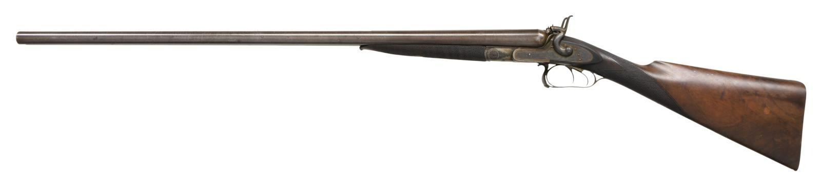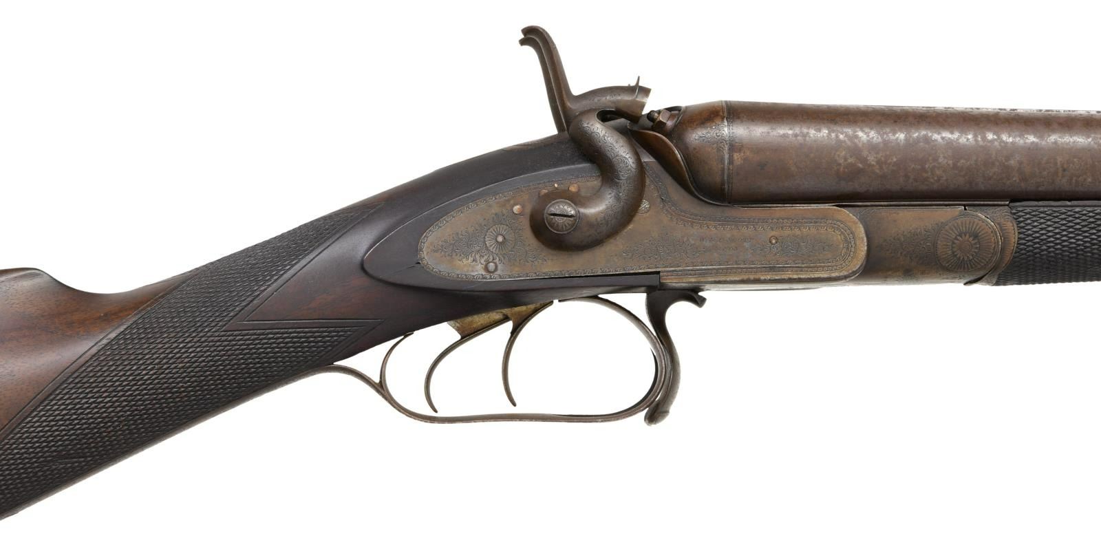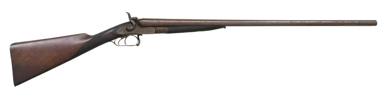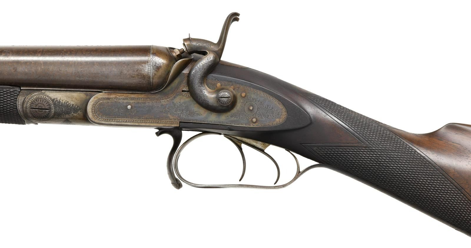 THUMB HOLE UNDERLEVER. Cal. 12 Ga. S# 4852. Bbls. 29 1/2" Damascus steel. Bead front sight. Shotgun has James Purdey's First pattern underlever to open action. Action & bottom metal have floral engraving. Double triggers. Extractors. Checkered walnut stock & forend. LOP: 13 3/4". Bottom of butt has small silver plate. CONDITION: stock has a small chip at toe, a couple small cracks, a couple other chips, scattered dings & handling wear. Metal is a dull gray patina w/ scattered traces of case colors & oxidation. Good bright bores w/ a few spots of pitting. (01-24202/MJC). ANTIQUE. $500-900.