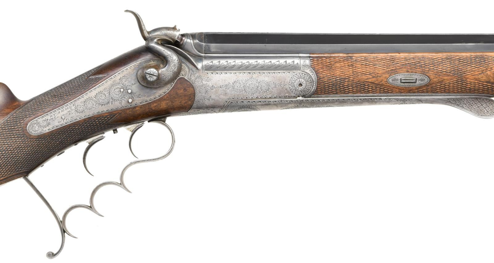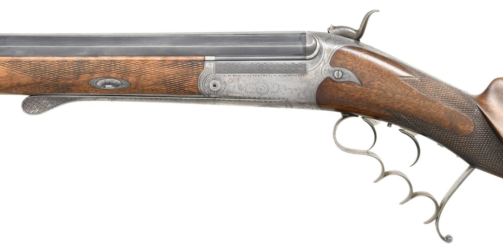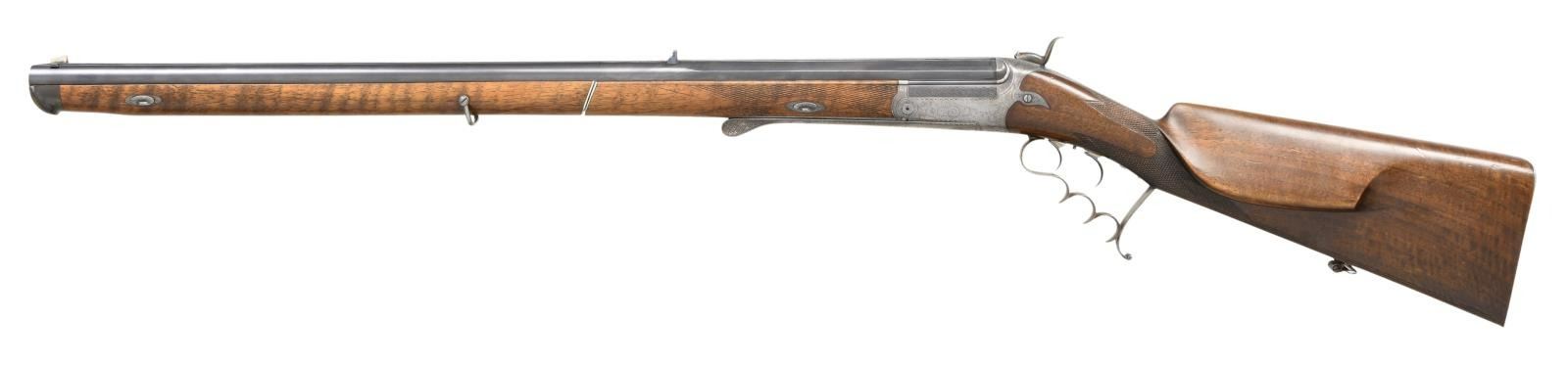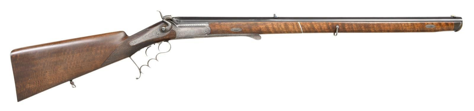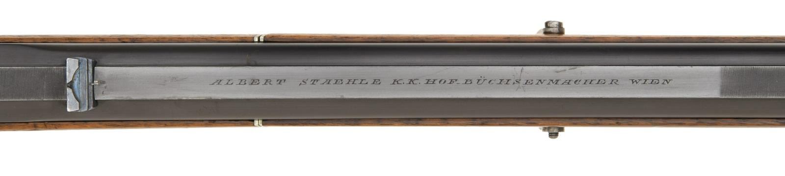 STALKING RIFLE BY ALBERT STAEHLE OF VIENNA. Cal. 8.15 x 46R (?). S# 1502. The 26-1/4" octagon to round barrel is engraved with maker's name, title and address on integral wide matted full length rib. "V" notch single leaf rear and German silver barley corn front sights are dovetailed through. Round bodied action with forward pivoting opening lever is fitted with back spring peninsula lock having non-rebounding serpentine hammer, double set triggers and large trigger guard with three finger spurs. Action and lock are engraved with sprays of scroll within small scroll borders. "Staehle" and "WIEN" (Albert Staehle is known to have been working in Vienna in the late 1860's) are at rear of lockplate. Buttstock of somewhat fiddle figured European walnut measures 13" over steel buttplate engraved with scroll and S#. Stock features right hand swept cheekpiece, point pattern checkering and sling loop on flattened toeline. Two piece forend extends to muzzle with schnabled horn tip. Rear portion of forend is attached to action so barrel lifts out in early German style. Front and rear forend pieces are separated buy German silver plates and attach to barrel with captive sidebolts through oval steel escutcheons. CONDITION: fine. Barrel retaining nearly all of a good quality rust re-blue most likely done after sleeving to this small caliber. Muzzle is engraved to hide joint. Joint is nearly invisible on breech end but can be seen in extractor cut. Action retains traces of case color where protected, perhaps as much as 15%. Stocks retain most of what appears to be their original oil finish with some added oil over a good number of bumps and knocks. Checkering has been cleaned. Action is tight. Lock is good. Triggers work. Bore is bright and shiny. A great little hunting rifle. Although primarily a target cartridge, in some loadings the 8.15 x 46R is equal to the 30-30 Winchester. (01-24211/MGM). ANTIQUE. $3,500-6,500.