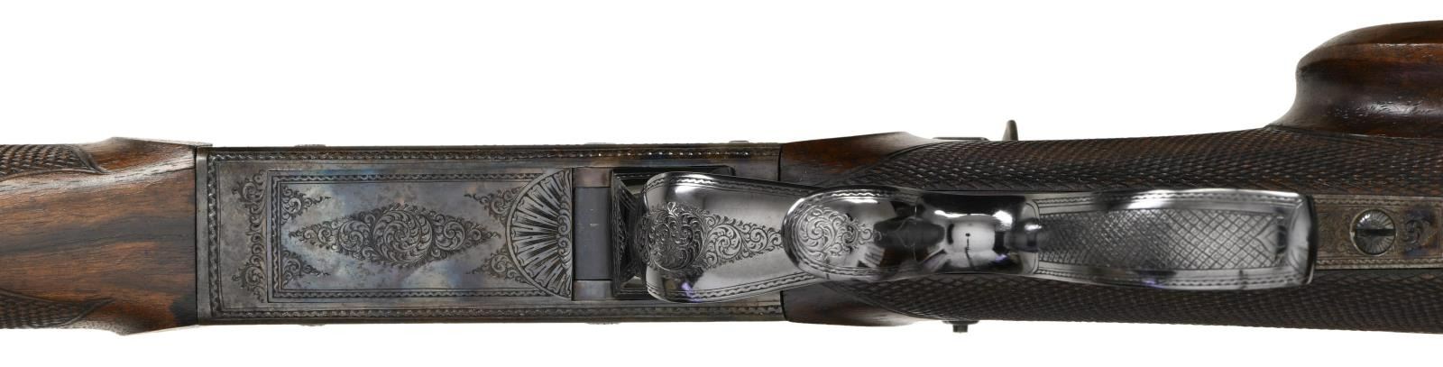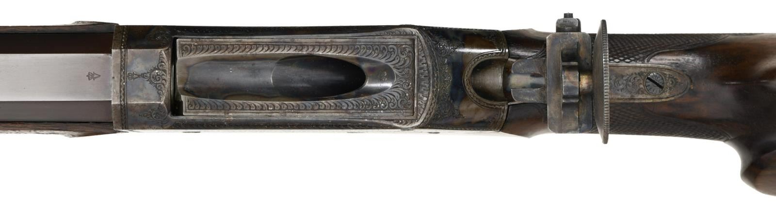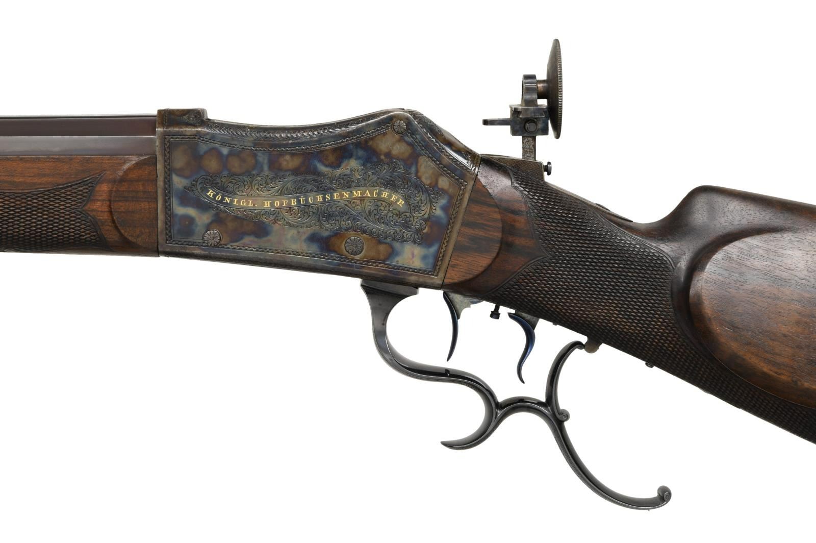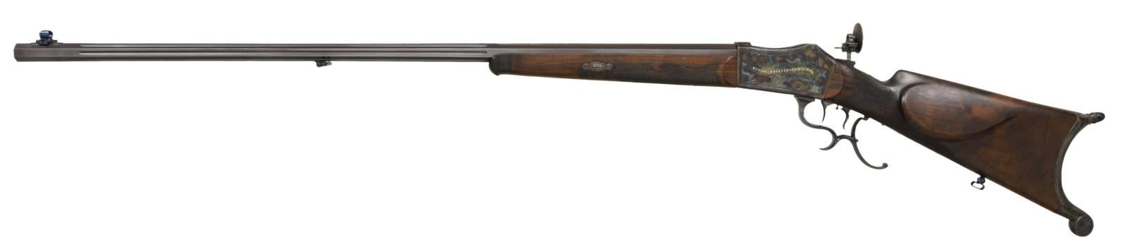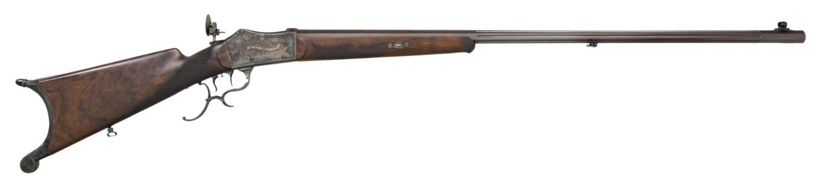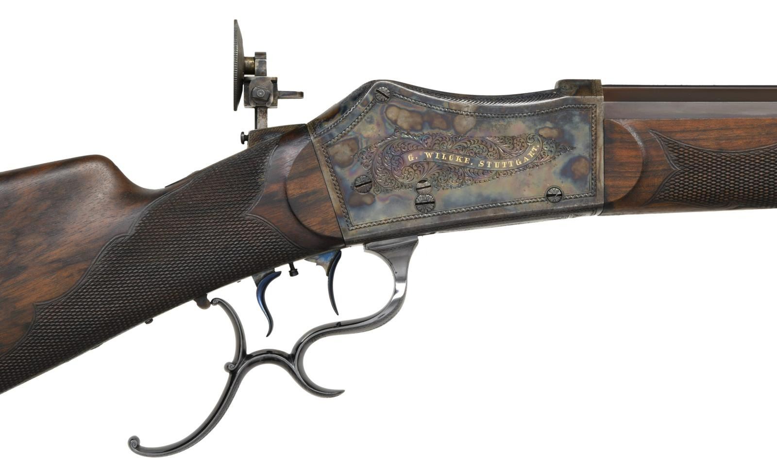 SHOT OFF HAND TARGET RIFLE BY G. WILCKE OF STUTTGART. Cal. 41 Long Colt. NSN. The browned 35 1/2" octagon barrel is fitted with wide rear top flat to accommodate open rear sights. In front of this area, all flats are fluted to within 4" of muzzle. A fine bead front sight set in protective ears is adjustable for windage and is dovetailed through a slightly raised integral base. A sling loop is attached and top flat is stamped with a crowned "V" proof at rear indicating that this rifle was "in stock" in 1891 with the institution of Germany's first proof law. A matching "V" is also on the case hardened Martini type action fitted with fancy opening lever having finger spur. Action is also fitted with double set triggers and aperture rear sight which is adjustable for windage but not for elevation, except roughly with positioning of mounting post. Action is of Swiss type with cleaning hole through rear and breech block. Action engraved with about 50% coverage exceptionally well cut shaded scroll within geometric borders. Scroll engraved areas are superimposed with long banners gold inlaid "G. WILCKE. STUTTGART." and "KONIGL. HOFBUCHSENMACHER" (Gunmaker to the King). Scroll engraving extends to bottom tang. Straight grip buttstock of finely veined and lightly figured European walnut measures 14 5/8" over heavy case hardened steel hook buttplate with acorn top finial. Stock features backward swept right hand cheekpiece and semi fancy pattern checkering. Matching forend with schnabeled horn tip attaches to barrels witih side bolt through shaped and engraved case hardened steel escutcheons. CONDITION: exceptionally fine as professionally augmented by a master gunsmith . The action appears to retain nearly all of its original case hardening color which has been relaquered over some darkening on bottom and cleaned light pitted on receiver ring. The stocks also appear to be original, not refinished and have a few handling marks. Case hardening on buttplate also appears to be original. Barrel has been rebrowned and retains nearly all of that brown. Operating lever has had its charcoal blue restored. Bright temper blue on minor screws, trigger blades, sling loops and front sight has most likely been refreshed. Chamber appears to have been bushed and consignor states caliber is 41 Long Colt. Groove diameter of barrel is .366 which corresponds to 9.3mm. Nominal bullet diameter for the 41 Colt is .386, so rifle should shoot very well. Bore is bright and shiny throughout. Rear sight appears to have been sourced from another rifle and although prongs for micrometer adjustment are present there is no provision for same on action. A very attractive long barreled target rifle. (01-24228/MGM). ANTIQUE. $7,000-12,000.