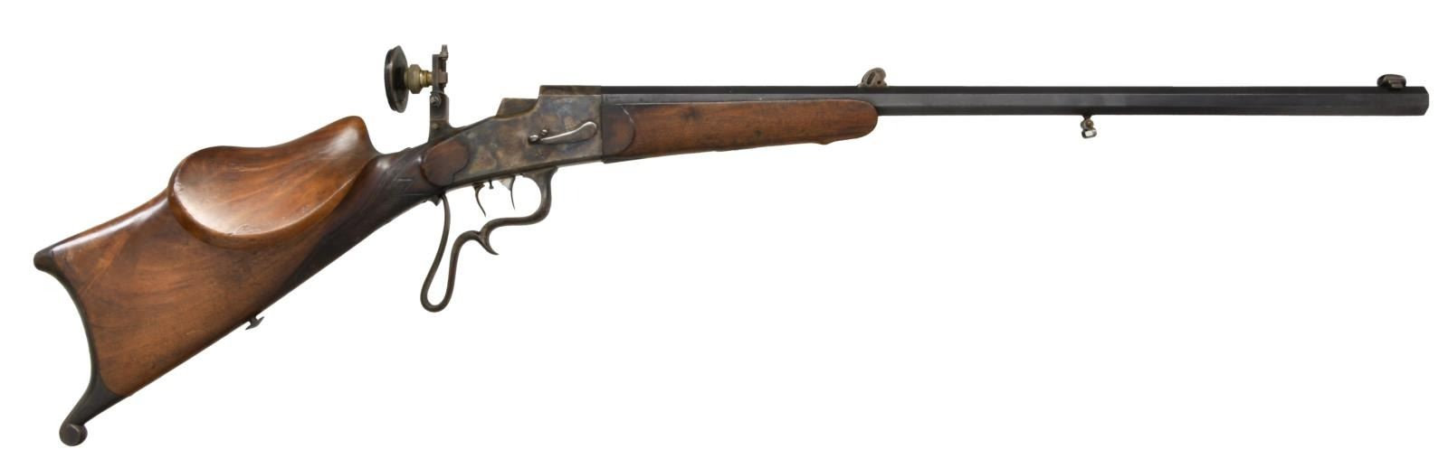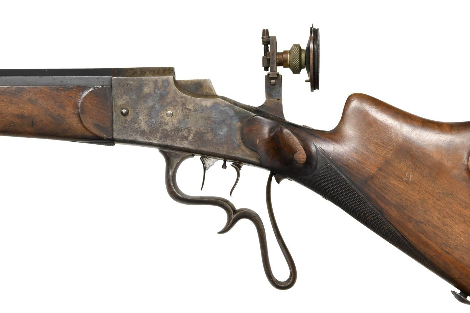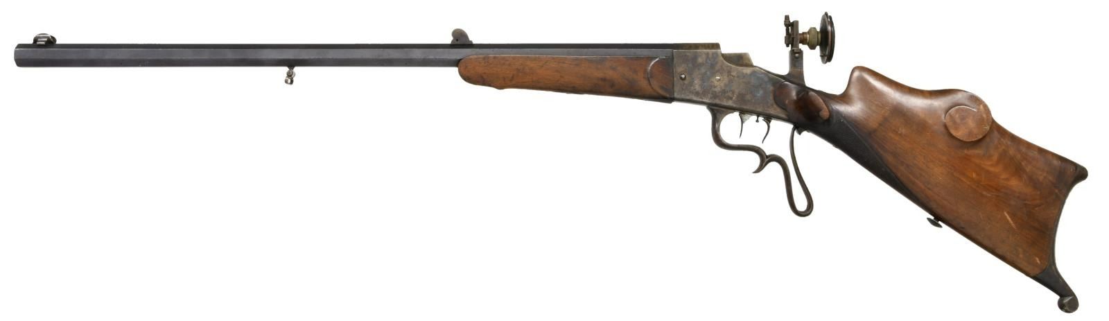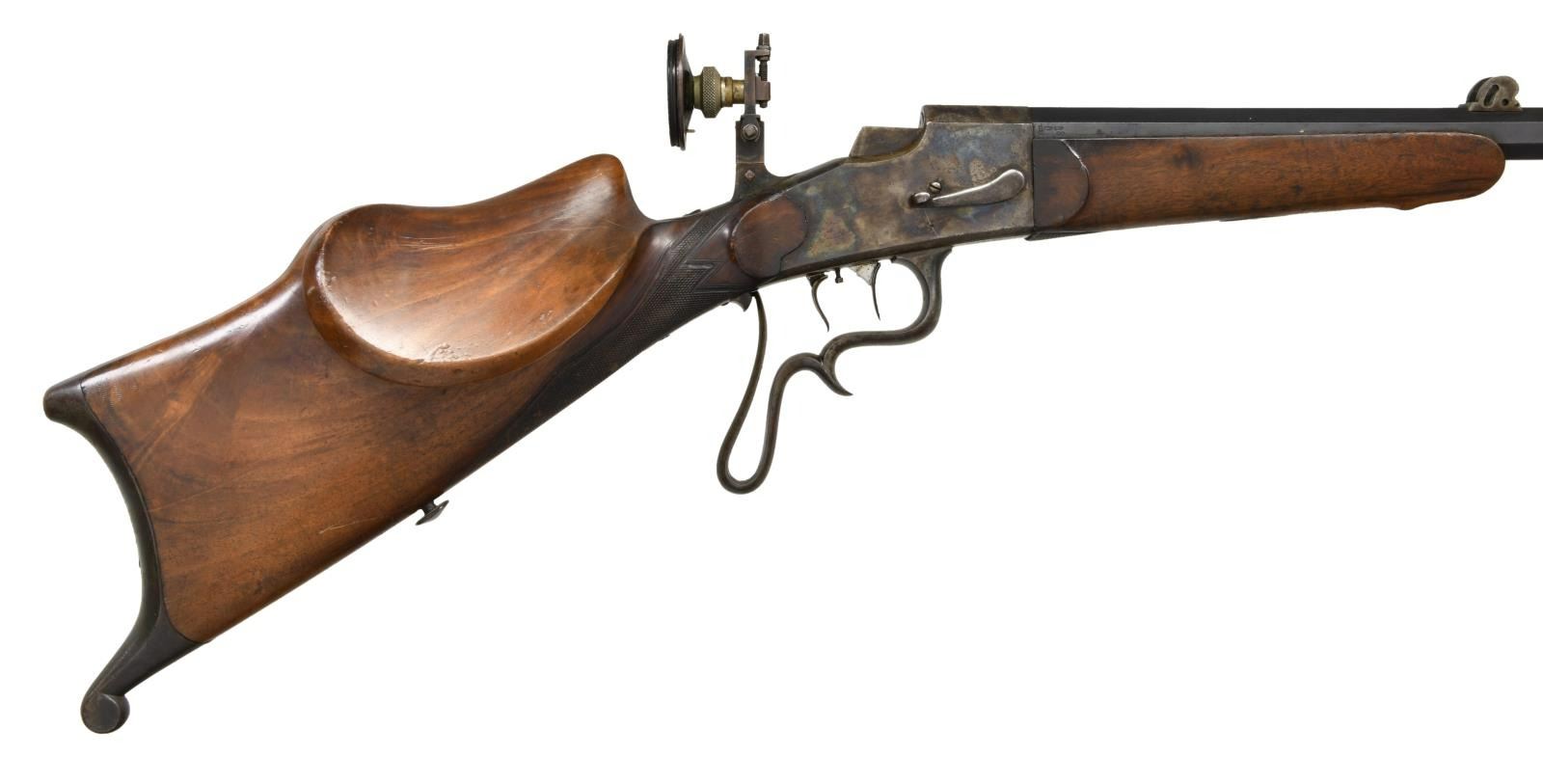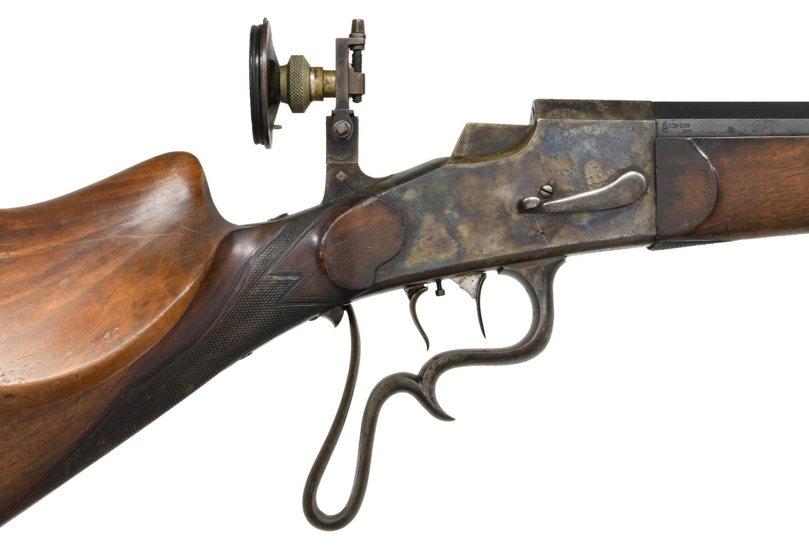 WITH LEFT HAND STOCK AND ORIGINAL SIGHTS. Cal. 4mm RF. S# 5970. The 27-1/2" octagon barrel is stamped "N10" at muzzle which is also stamped with four 7s and is otherwise unmarked except for S# on bottom under forend and BUG proofs on right rear. Case hardened action is of vertical block style as described and illustrated on page 43 of "Alte Scheibenwaffen Volume 3" as compiled by Tom Rowe. The only markings are S# on left side. Firing mechanism takedown lever is on right. Action is fitted with double set triggers and has spurred and looped trigger guard. Sights appear to be original with Diopter rear having large eye piece with interchangeable apertures and post front sight in looped shroud. Remnants of rear sight are dovetailed through barrel. Schutzen style stocks are fully formed with high left hand cheek piece with corresponding volute on left side of stock, hooked butt, thumb rest, grip checkering and sling button. CONDITION: fine to very fine, needing cleaning. Barrel with over 70% blue. Action with about 80% case hardening color with brown flecking. Stocks retain most of their oil finish. Bore appears to be fine, but needs cleaning. Mechanically good, trigger will not set, probably needs adjustment. (23-4728/MGM). C&R. $800-1,500.