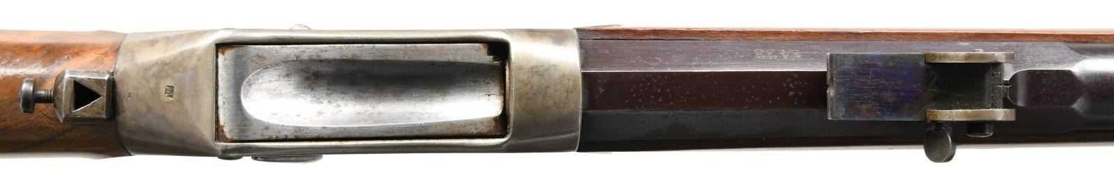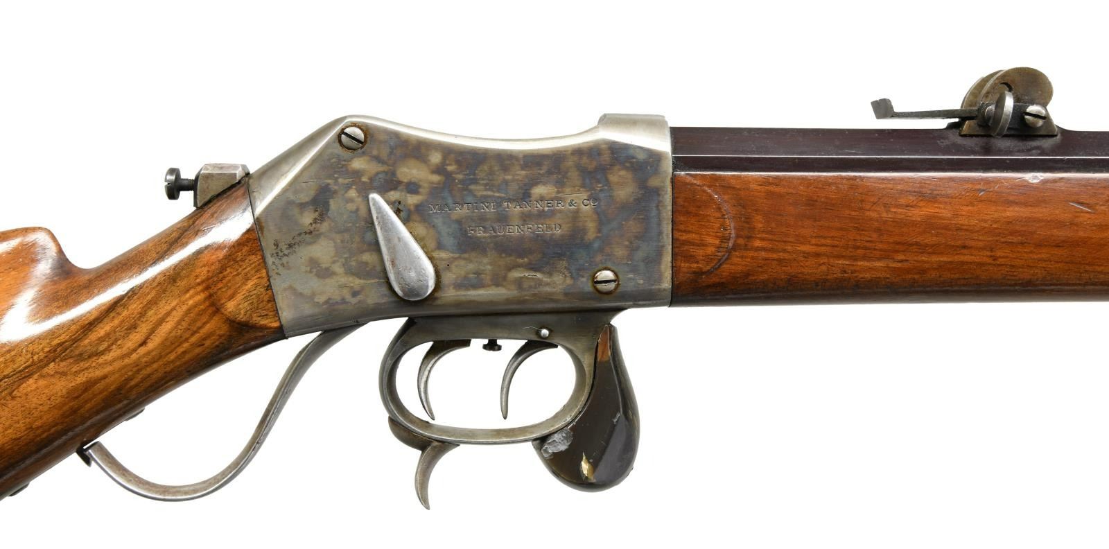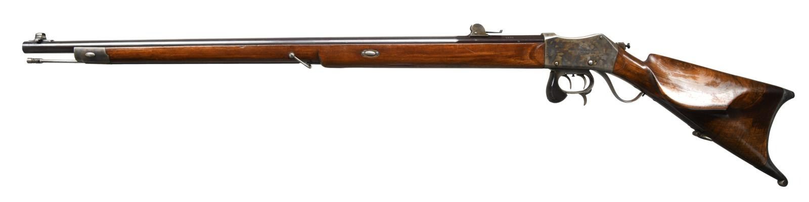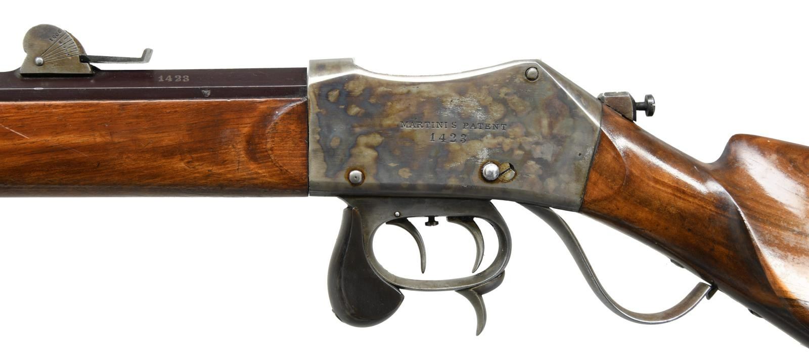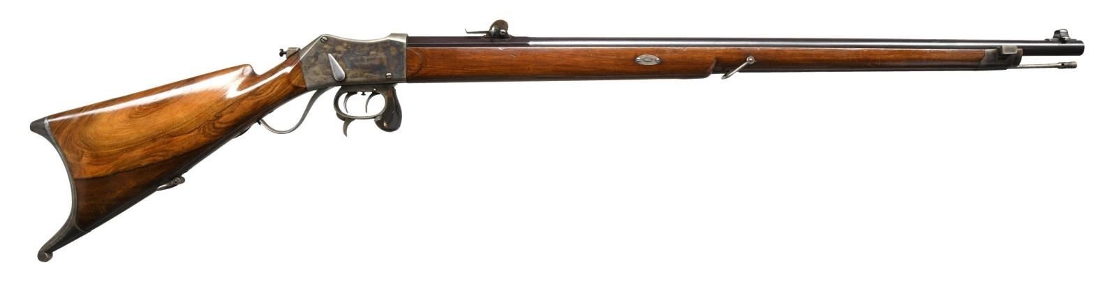 RIFLE. Cal. 10.4mm (41 Swiss RF). S# 1423. Bbl. 31 3/4" w/ protected post front sight & Vetterli style rear sight. Case colored Martini action w/ dbl. set triggers & stabilizing block on front of trigger guard bow. Long wedge fastened walnut forearm w/ swivel, case colored front bbl. band w/ bayonet lug, & protective tube for slotted tipped cleaning rod. Straight grip walnut stock w/ swivel on toeline, base for aperture sight at wrist, large extended left side cheekpiece & case colored Schuetzen buttplate. CONDITION: very good bbl. blue mixed w/ peppery oxidation throughout. Very good case colors on action & buttplate w/ areas of peppery oxidation. Very good forearm wood finish w/ impressions & wear around ears. Very good buttstock finish w/ scattered large area of worn varnish. Buttstock shows light play to action. Very good bore w/ strong rifling. (23-2302/MD). CURIO. $1,000-1,500.