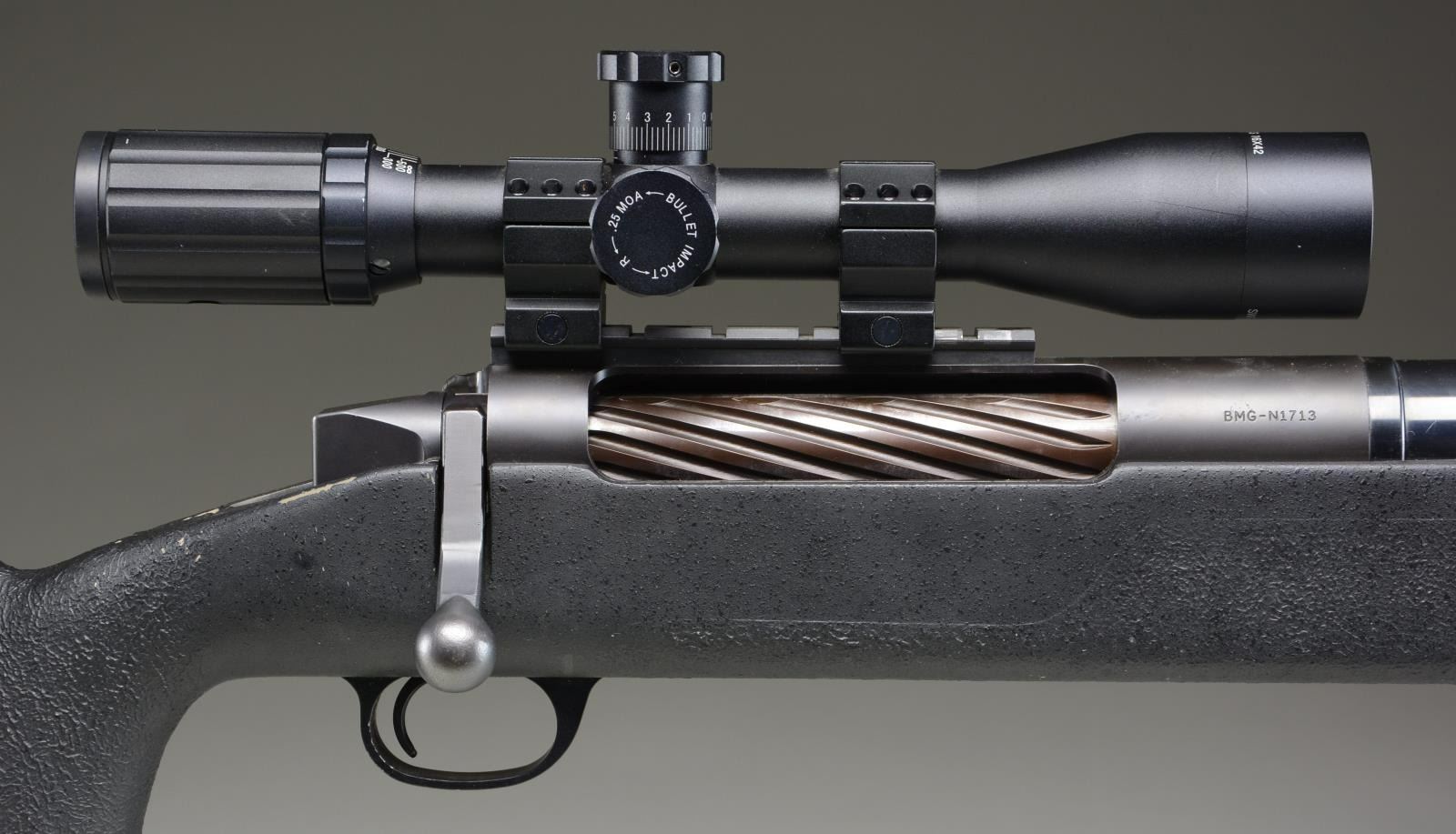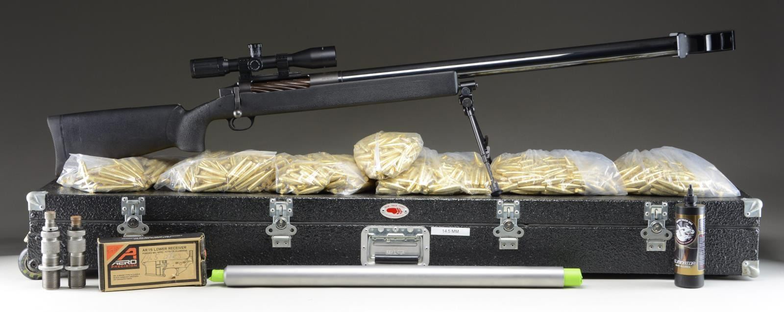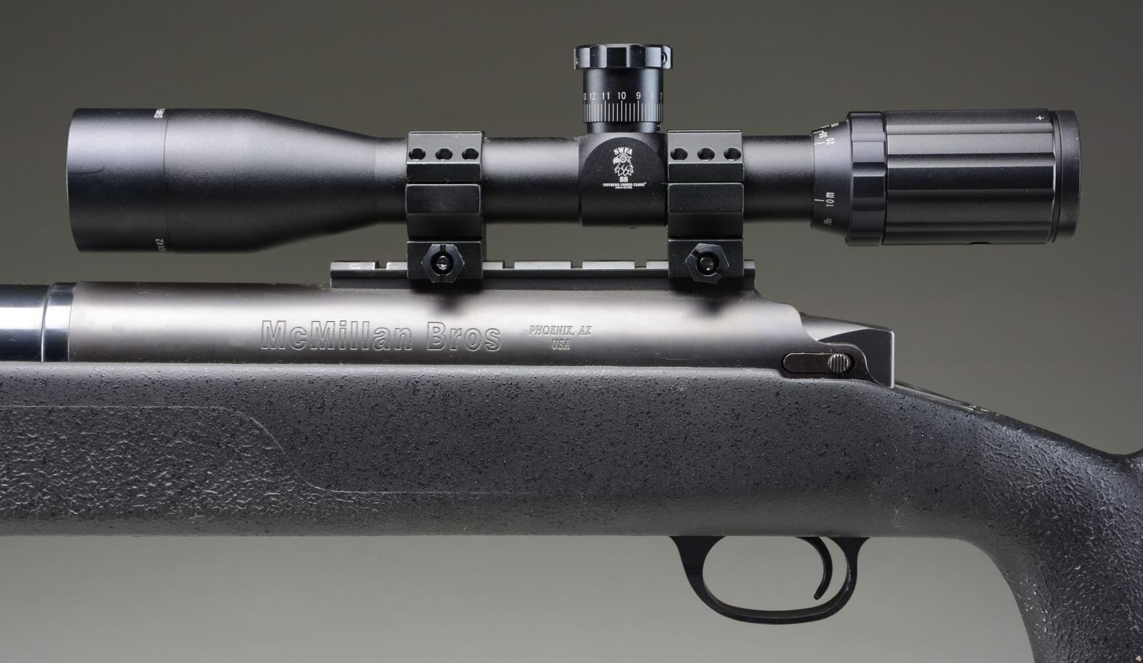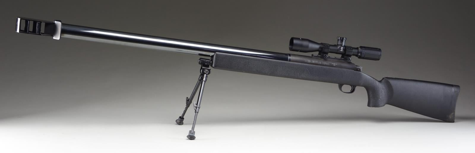 RIFLE. Cal. 14.5 JDJ. S# BMGN1713. Bbl. 38" Over Brake. A rare rifle, as impressive in performance as it is to look at. The McMillan Brothers SSK Single Shot rifle was built by J.D. Jones, the well known wildcat cartridge designer, & chambered in his own 14.5 JDJ load. It launches a 1173 grain solid brass projectile upwards of 2700 feet per second, creating a whopping 19 Thousand foot pounds of energy. Deep bright blued finish on barrel, w/ matte finish black receiver. Barrel terminated w/ 5" long artillery style, 3 chambered muzzle brake. Heavy composite stock w/ thick rubber Decelerator butt pad. Integral bipod mounting point for included quick detach VersaPod. Massive, spiral fluted 2-lug bolt. 6" Weaver base above action currently sporting matte black SWFA SS 16x42 scope w/ Mil-Dot duplex reticle. No provision for open sights. Rifle weight unloaded, 42#. UNATTACHED ACCESSORIES: Spare barrel chambered in 50 BMG, 1 set 14.5 JDJ reloading dies, 1000+ bronze bullets made by Fricke at Lehigh Defense, 65"x14" Nielsen Sessions lockable transport case, cleaning solvent & paperwork. CONDITION: Original finish complete & consistent w/ full coverage. Barrel retains a beautiful deep blue finish. Receiver is matte finish w/ no visible signs of use. Finish on bolt has some thinning in areas of mechanical intervention which happens almost immediately. Stock has some small dings & scratches, primarily on top in the cheek area, probably from unintended contact w/ the massive bolt on occasion. Bipod moves fluidly and locks on correctly. Scope glass is clear w/ sharp reticle. Bore is bright w/ strong rifling. Transfers as any Title I firearm. According to manufacturer is was never considered a Destructive Device as it was built for sporting applications only. (23-4967/JZ). MODERN. $12,000-15,000.
