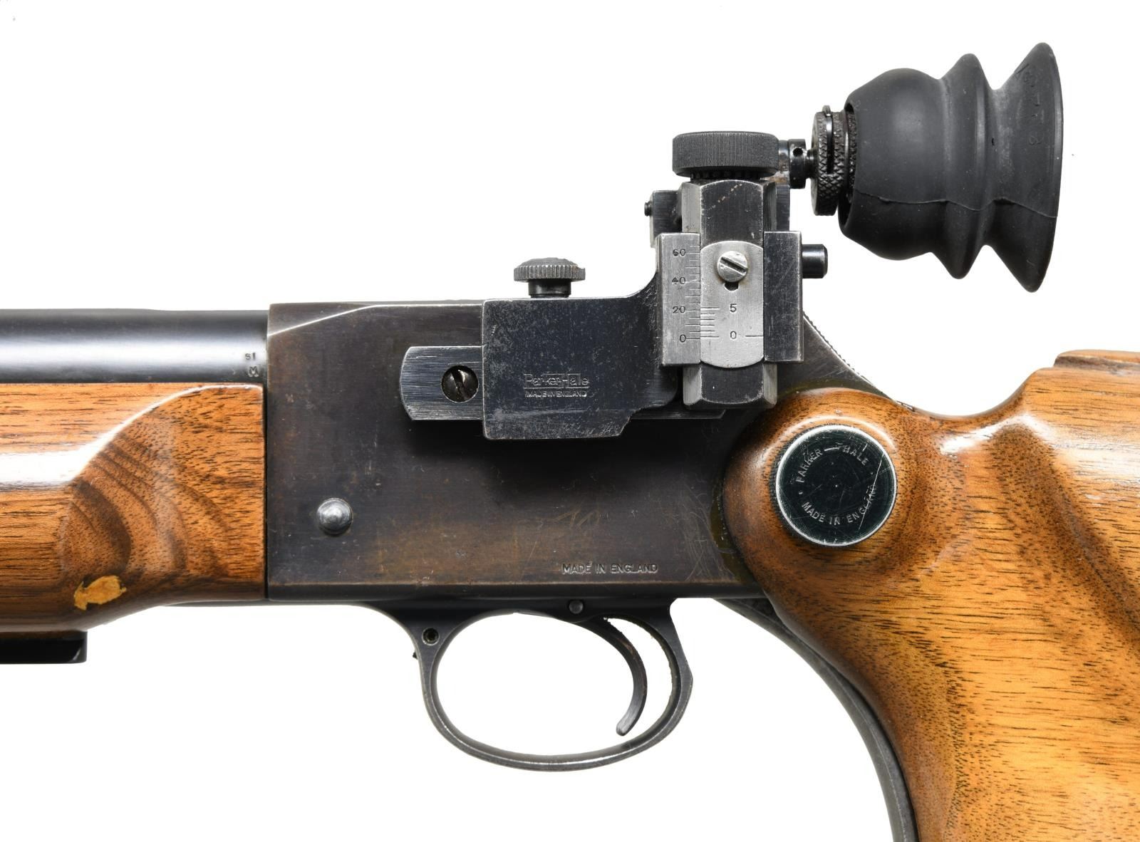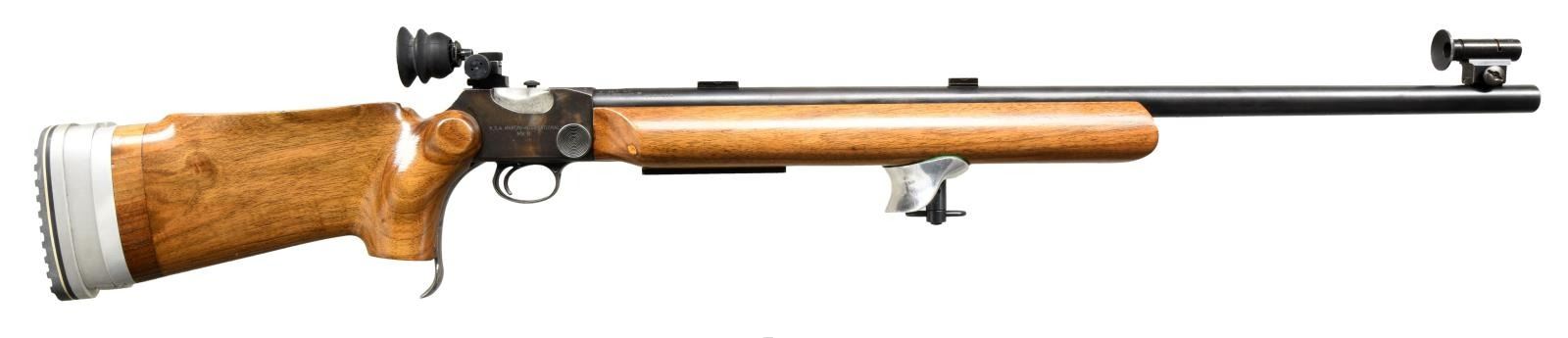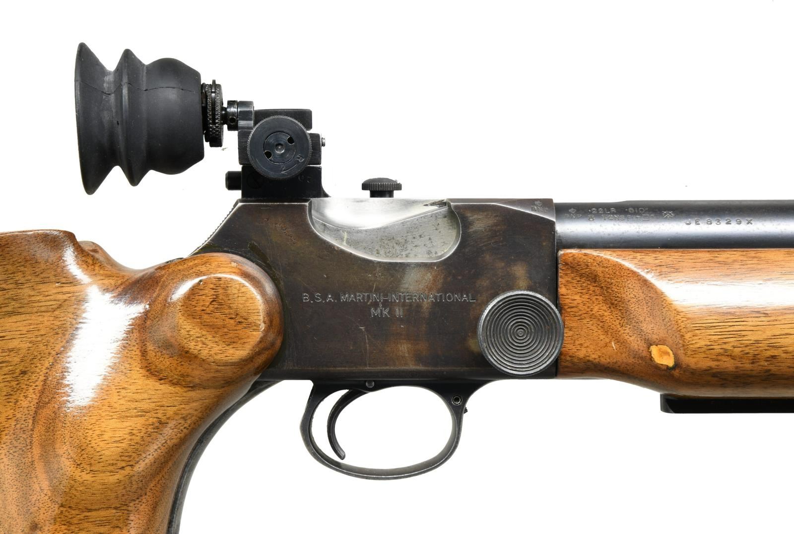 Cal. 22 LR. S# UE8329X. Bbl 29". Martini International Mk II single shot target rifle manufactured by Birmingham Small Arms. The barrel is stamped "THE BIRMINGHAM SMALL ARMS Co. LTD. - ENGLAND" followed by the caliber designation and a BSA logo over the top, with various British proofs stamped on the right. Right side of receiver is marked "B.S.A. MARTINI-INTERNATIONAL/ MK II", with "MADE IN ENGLAND" on the left. Metal components are blued, with the lever being in the white. Solid smooth wood buttstock with adjustable buttplate, and smooth wood forend. Parker Hale aperture rear sight with globe front sight. CONDITION: metal components retain the majority of their original factory blue finish, exhibiting some areas of mild wear and thinning, with mild surface oxidation overall. Mirror bore, exhibiting well defined rifling throughout. Wood furniture shows some scattered marks and minor impressions from storage and handling, but otherwise is very good overall. (23-2585/MLW). CURIO. $800-1,200.