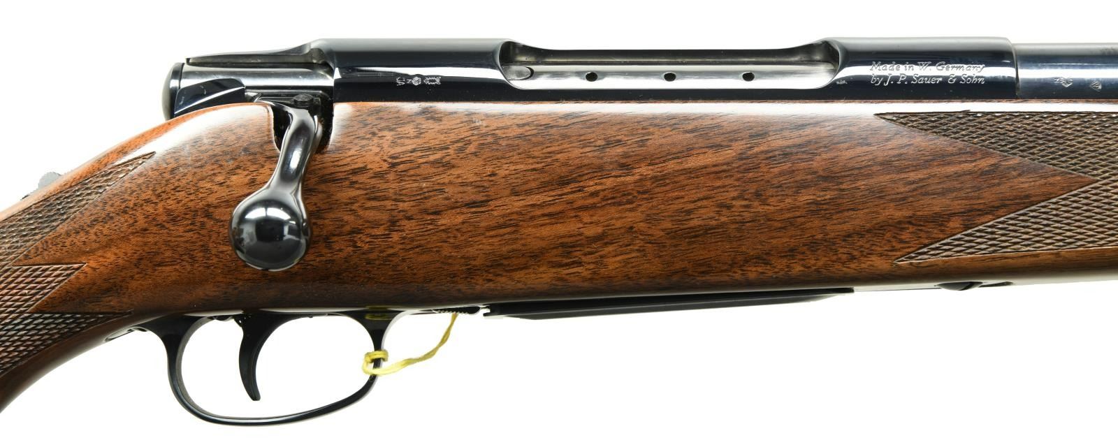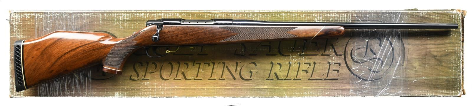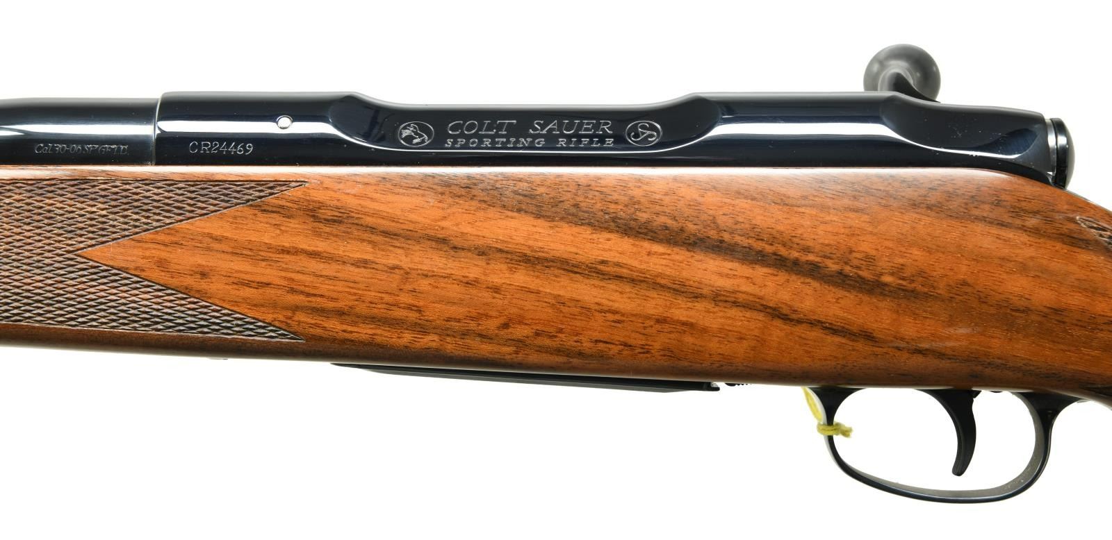 BOX. Cal. 30-06. S# CR24469. Bbl 24". Manufactured by J.P. Sauer & Sohn of West Germany in 1980 and subsequently imported by Colt. The top of the barrel is marked with Colt's single line address, with the caliber designation stamped on the left at the breech. The left side of the receiver is marked with the serial number followed by an encircled Rampant Colt logo, "COLT SAUER/ SPORTING RIFLE", as well as the J.P. Sauer & Sohn logo. Right side of receiver bears a Kiel Proof House stamp above an Eagle/N commercial nitro proof and "JA" date code, indicating manufacture in 1980. Metal components exhibit a lustrous blue finish. 1 piece checkered wood Monte Carlo pattern buttstock with a Colt Sauer rubber recoil pad. MAGS: 1 3 rnd. UNATTACHED ACCESSORIES: original factory box containing its factory styrofoam insert, bolt, and manual. CONDITION: extremely fine, with metal components retaining bountiful amounts of their original lustrous factory blue finish, exhibiting few minute superficial marks from handling and storage. Brilliant mirror bore, exhibiting sharp and well defined rifling throughout. Stock shows few very light superficial marks from storage and handling. Box exhibits exterior wear and some losses to the edges, but otherwise good overall. An extremely fine Colt Sauer rifle that one would find to be a difficult example to upgrade from. (23-2140/MLW). MODERN. $2,000-3,000.