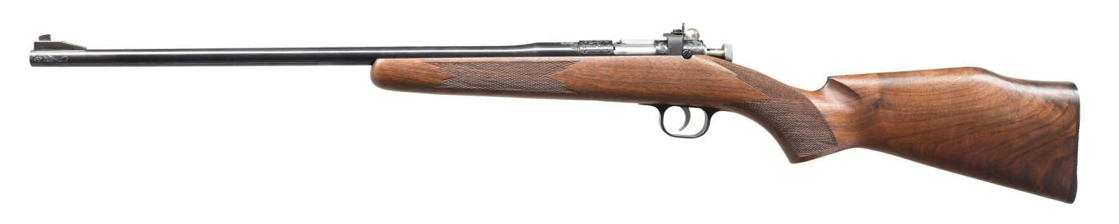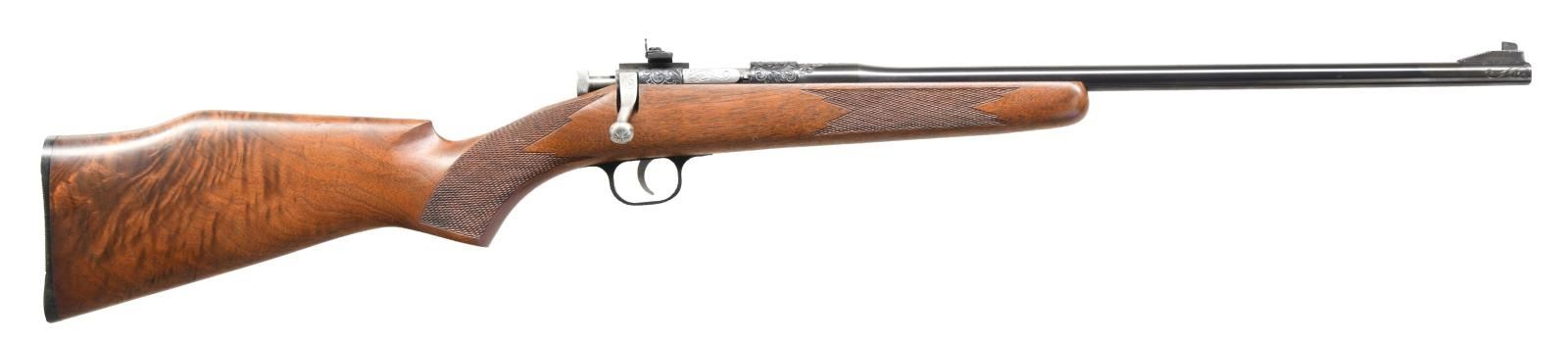 ENGRAVED CHIPMUNK BOLT ACTION RIFLES with DISPLAY CASE & DOCUMENTION. 1) S# E-2. 2) S# E-3. BOTH: Cal. 22 S, L & LR. Bbls. 16" w/ ramped Patridge sights; factory receiver sights & w/out bbl. rear sight provisions. Only 3 Chipmunks ever factory engraved; serial #E-1 retained by president of Chipmunk leaving only this consecutive set. Originally, 25 were commissioned to be engraved, but Chipmunk went out of business w/ only 3 completed. Engraved by Clinton Finley of Redding, CA who did all engraving for Chipmunk. Mfg. Dec. 14, 1987 having blued finishes plus hand checkered high grade northern California walnut stocks. Tasteful scroll engraving at each end of bbls., portions of bolts, receivers plus trigger guards. Originally sold to Trader Fred's of Thetford, VT. An exceptional pair that will show well in any firearms setting. UNATTACHED ACCESSORIES: original boxes for each rifle w/ packaging. Coffee table style display case of superb craftsmanship made outside of factory by Fred Berecz (Trader Fred); suitable for other display purposes as well. Aug. 10, 1988 Chipmunk letter supporting stated features signed by Controller Robert. T. Wagner w/ canceled postage envelope addressed to Trader Fred's. CONDITION: all aspects of offering are near excellent w/ rifles appearing new & unfired. (23-4723, 23-4724 & 02-20889//NW). BOTH MODERN. $2,000-3,000.