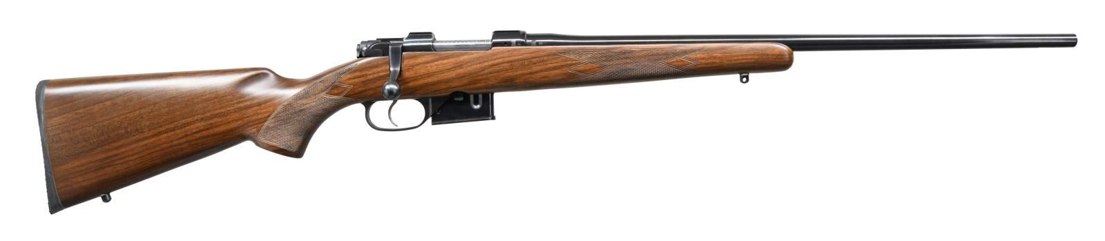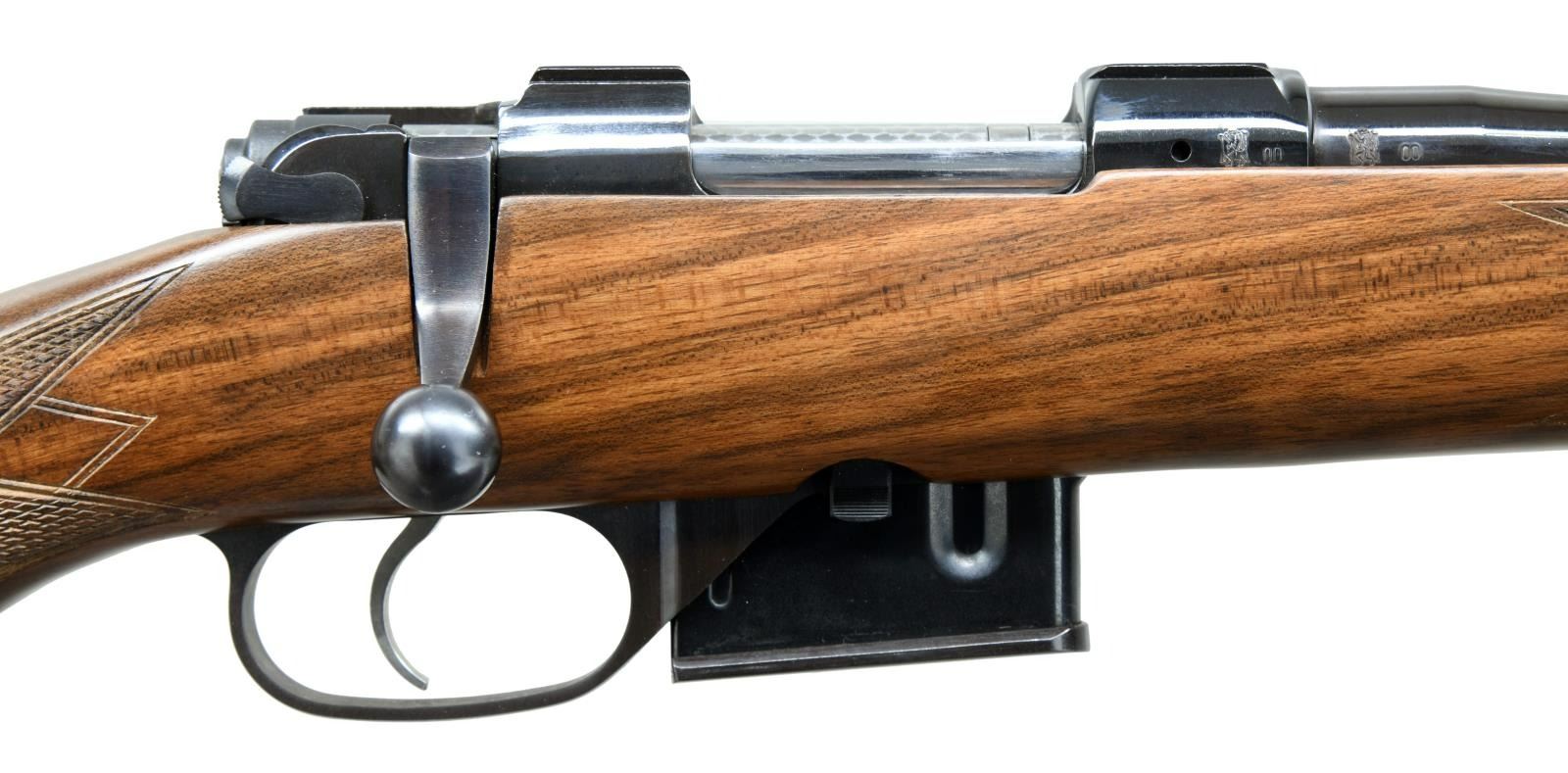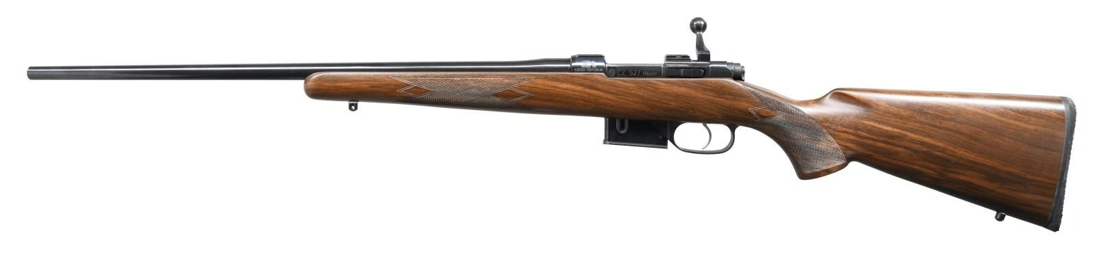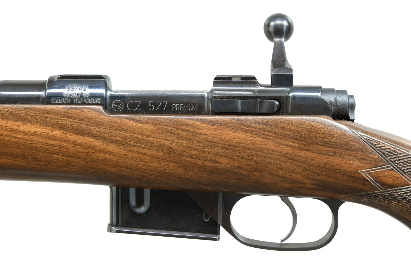Cal. .223 Rem. S# 83742. Bbl 22". CZ 527 Premium manufactured by CZ in 2000 and imported by CZ U.S.A. The left side of the receiver is stamped with the serial number above "MADE IN/ CZECH REPUBLIC" at the chamber, with the CZ logo followed by "CZ 527 PREMIUM" on the receiver wall. CZ U.S.A. importer stamp is present on top of the receiver wall. Right side of receiver and barrel bear a Czech rampant lion proof followed by "00" indicating manufacture in 2000. Metal components exhibit a lustrous blue finish, with the receiver being housed within a solid 1 piece checkered wood stock featuring a Pachmayr black rubber recoil pad. MAGS: 2 5 rnds. UNATTACHED ACCESSORIES: CZ scope rings. CONDITION: excellent, with metal components retaining bountiful amounts of their original factory blue finish, exhibiting some extremely light wear on the bolt handle from operation of the action. Brilliant mirror bore, exhibiting well defined rifling throughout. Bolt face is excellent and appears to be unfired from the factory. Stock is excellent overall. An extremely nice example of a CZ 527 Premium rifle. (23-1443/MLW). MODERN. $600-900.