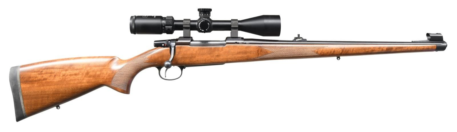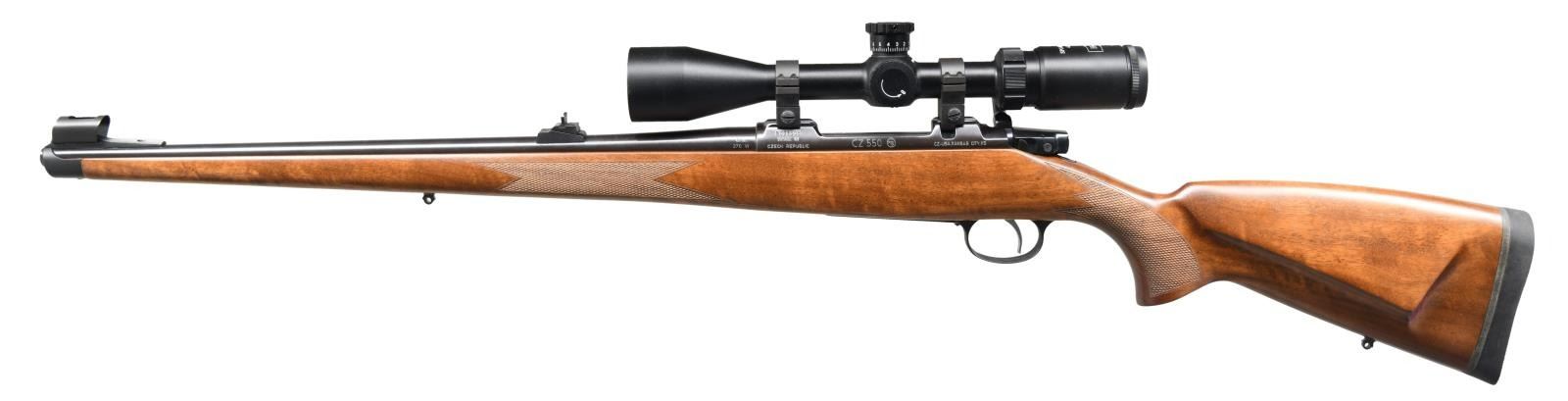 Cal. 270 Win. S# B023605. Bbl. 20 1/2" marked on right side "CAL 270 W". Receiver is marked on left side "CZ 550 MADE IN CZECH REPUBLIC" & "CZ USA KANSAS CITY". Open sporting rear sight. Ramp front sight w/ white bead & protective hood. Receiver grooved for scope bases. Rifle is equipped w/ Hi-Lux 4 X 16 X 44 scope w/ AO & finger adj. turrets plus duplex range finding reticle. Rifle equipped w/ controlled feed non rotating extractor. Single set trigger & hinged floorplate. European walnut stock w/ raise cheek piece. Mannlicher forend. Cut checkering plus black recoil pad & QD sling swivels. UNATTACHED ACCESSORIES: see through scope caps. CONDITION: rifle in very good to near excellent condition including scope, optics & bore. (23-4929/RW). MODERN. $1,000-1,500.