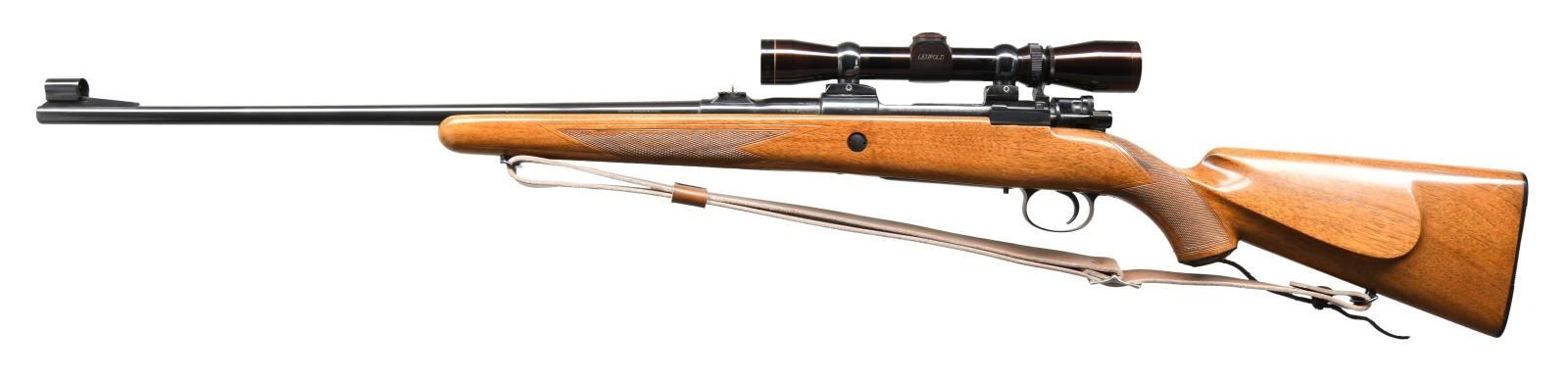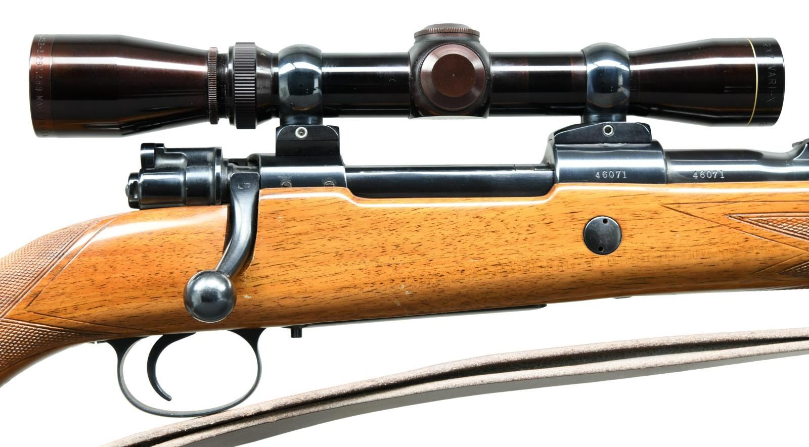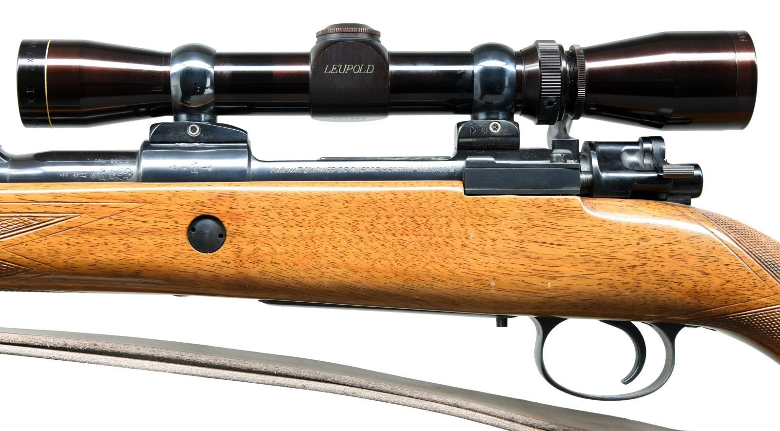 Cal. 220 Swift. S# 46071. Bbl. 24" w/ Armstrong hooded ramped bead front plus 3 leaf express rear sights; marked "MADE IN BELGIUM" & "CHROME VANADIUM STEEL". Mfg. July 5, 1963 (7.5:63 behind recoil lug) w/ European walnut stock having sling swivels, sporting sling, FN buttplate, grip cap, recoil reinforcement cross bolt & 3 panels of checkering; 2 on grip & wraparound on forend. Matching numbers on receiver, bbl., stock (internal) & all blued bolt having Dayton Traister style safety. Fitted w/ Timney adjustable trigger having blue alloy frame.Push button floorplate release. Receiver drilled & tapped for receiver sight plus scope bases; Conetrol projectionless scope mount set & gloss finished Leupold VARI-X II scope of 2-7 power w/ CPC (center pointed crosshair) reticle. CONDITION: some faint stock handling marks & plum hue to scope; all other aspects including bore & optics are near excellent. (23-4651/NW). CURIO. $800-1,200.