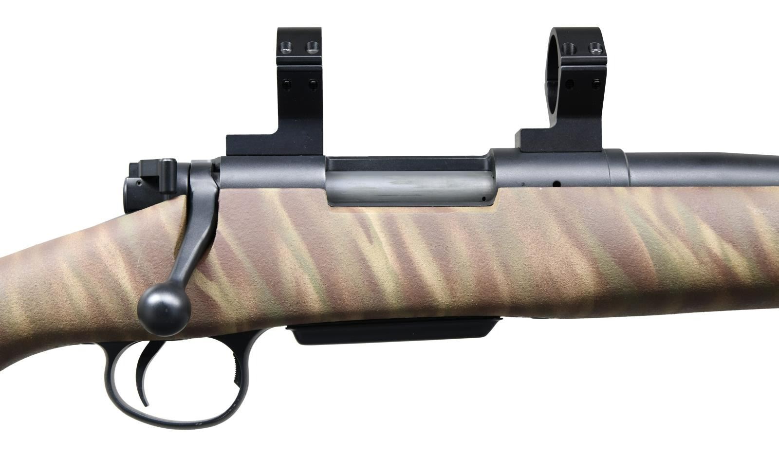 Cal. 22-250. S# 6164. Bbl. 26" fluted. Rifle is equipped w/ Talley scope rings. Matte black finish. Bolt is matching numbered to receiver. Camoflauge stock w/ bottom mounted sling studs. Factory recoil pad. LOP: 13 1/2". CONDITION: all aspects near excellent. (23-4789/MJC). MODERN. $2000-2750.