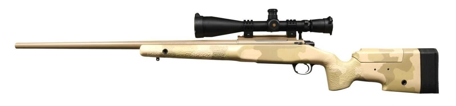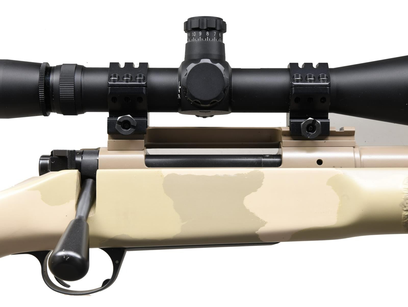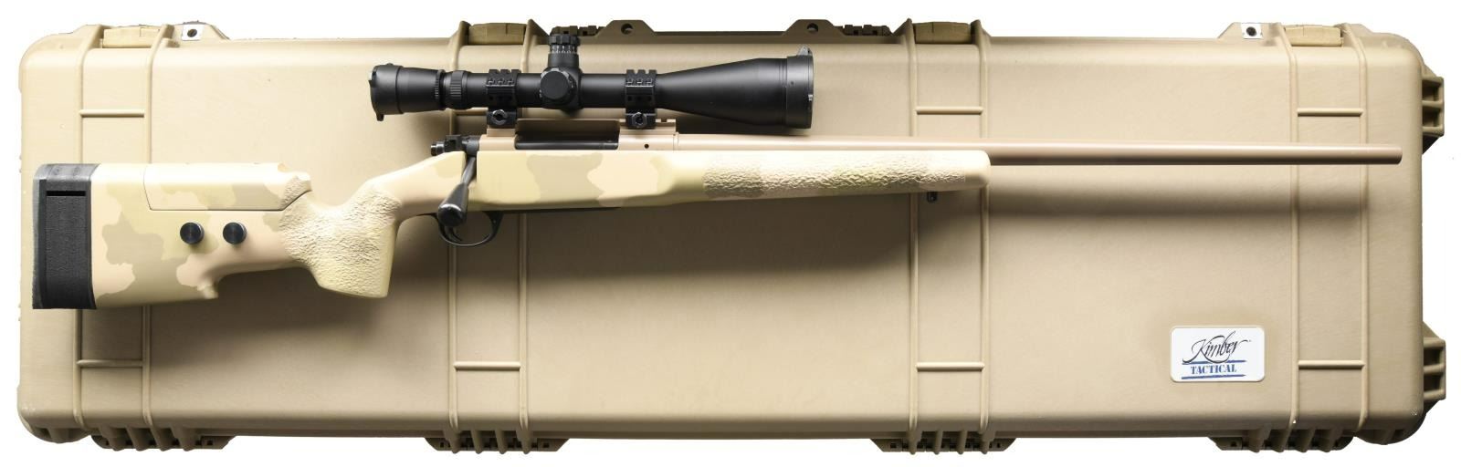 Cal. 300 Win. Mag. S# KW29124. Bbl. 26". Top of the tactical line bolt action rifle from Kimber featuring their 24-inch heavy barrel and a McMillan A-5 stock. Two-lug bolt w/ enlarged tactical bolt handle. Mauser-style non-rotating claw extractor & mechanical blade ejector. Pivoting left-side bolt release and a recessed recoil lug between the receiver and barrel. The Advanced Tactical Rifle utilizes Kimber's bottom metal and feeds from a non-detachable 5-round steel box magazine. Kimber's gunsmith-adjustable trigger currently breaking at around 3#. McMillan A-5 model stock, desert tan, fitted with an adjustable comb and length-of-pull spacers. Tan finish on exposed metal surfaces. Harris USA SLM folding, collapsible bipod. Currently sporting Leupold 8.5x25 scope w/ MOA Scale reticle. UNATTACHED ACCESSORIES: Harris bipod, Tan Kimber branded foam fitted hard case. Partial box (12 rds.) Remington 150Gr. Core-Lokt ammo. CONDITION: All aspects indicate little use. Some gentle finish thinning in areas of mechanical intervention. Glass is clear w/ sharp reticle. Bright bore w/ strong rifling. (23-2494/JZ). MODERN $2500-3,750.