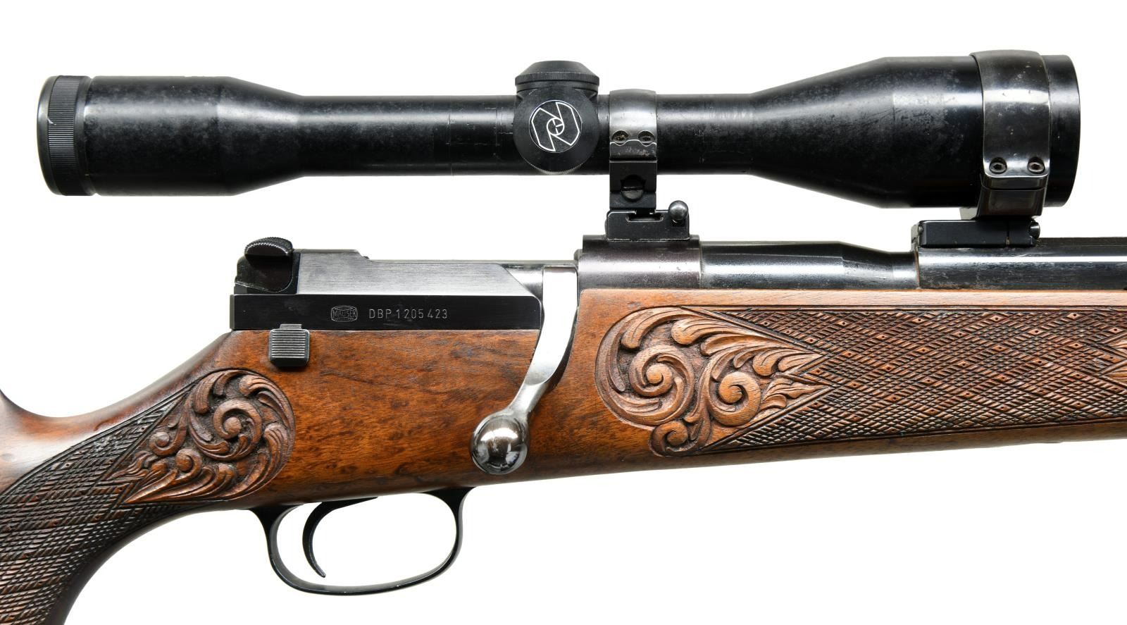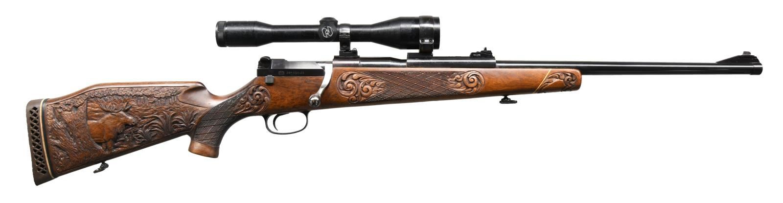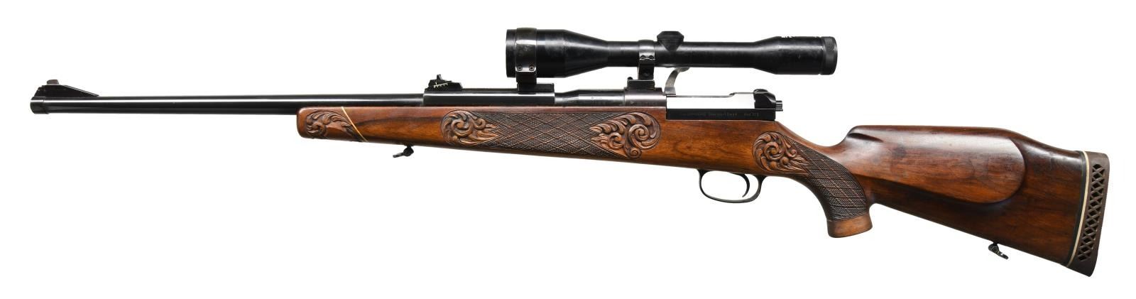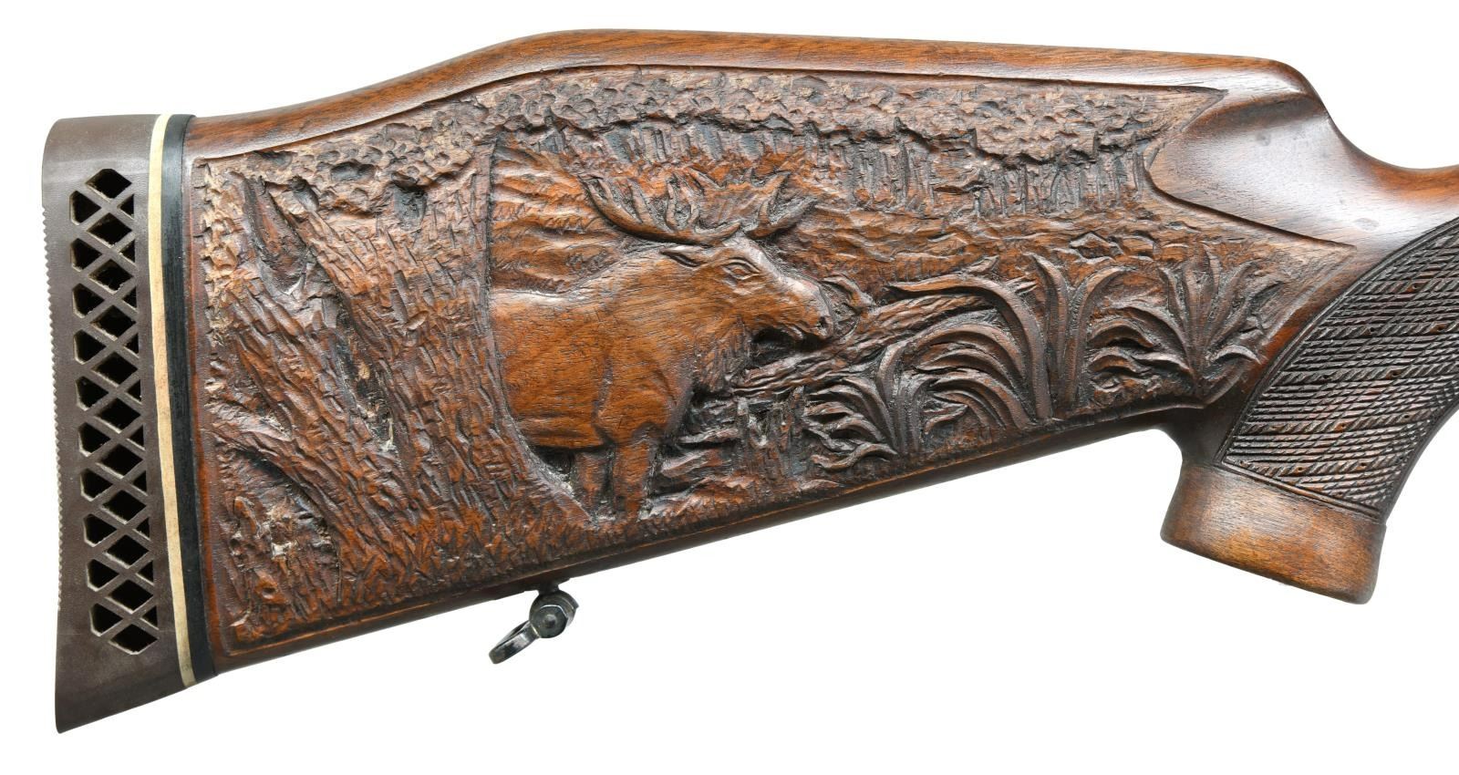 CARVED STOCK & ZEISS SCOPE. Cal. 308 WIN. S# SG47264. Bbl 24". Model 66S manufactured by Mauser in 1979. Barrel shank is stamped with the Original Mauser logo over the top, with the left side exhibiting a Eagle/N commercial nitro proof, "HK" (79) date code, and an Ulm Proof House antler stamp above ".308 WIN". Left side of bolt shroud is stamped with Mauser's manufacturer information, followed by the model designation. Trigger guard exhibits a "TGGI MOBILE AL" import stamp. Metal components exhibit a lustrous blue finish, with some areas of what appears to be a protective lacquer or varnish overspray. 1 piece Monte Carlo pattern wood stock features checkered panels terminating in relief carved scrollwork, with the right side of the buttstock exhibiting a full coverage relief carved scene of a moose in the forest. Ramped blade front sight with Williams adjustable rear sight. Receiver is mounted with a Carl Zeiss Diatal-ZA 6x42 T& scope. CONDITION: excellent, with metal components retaining bountiful amounts of their original factory blue finish, exhibiting few superficial handling marks, and areas of the aforementioned lacquer. Bolt handle has been cleaned and exhibits some scattered spots of oxidation. Brilliant mirror bore, exhibiting well defined rifling throughout. Stock shows a few marks from handling and storage, but otherwise is very good overall. Exterior of scope exhibit mild oxidation. Scope retains a sharp and clear image. (23-2187/MLW). MODERN. $2,000-3,000.