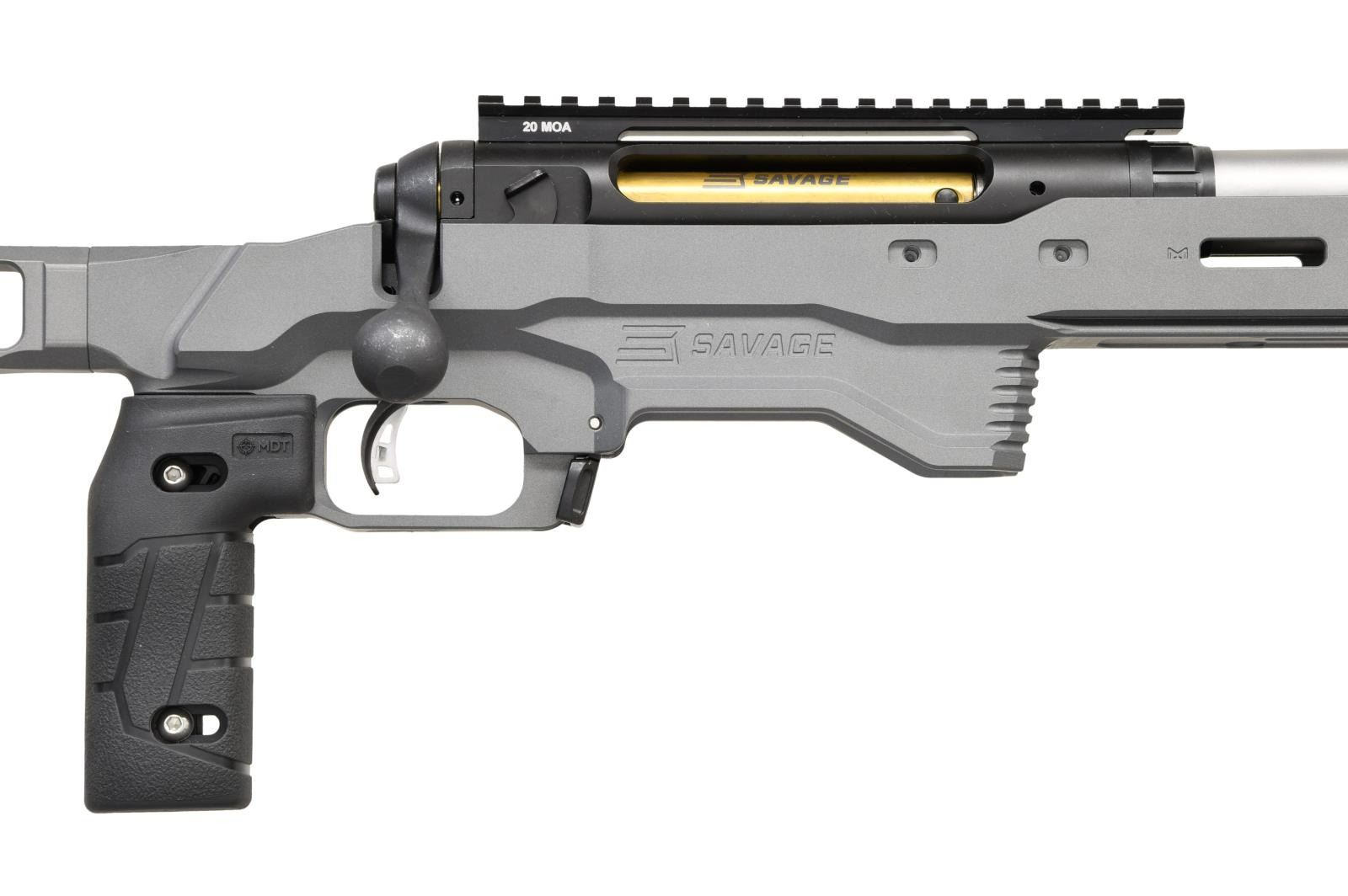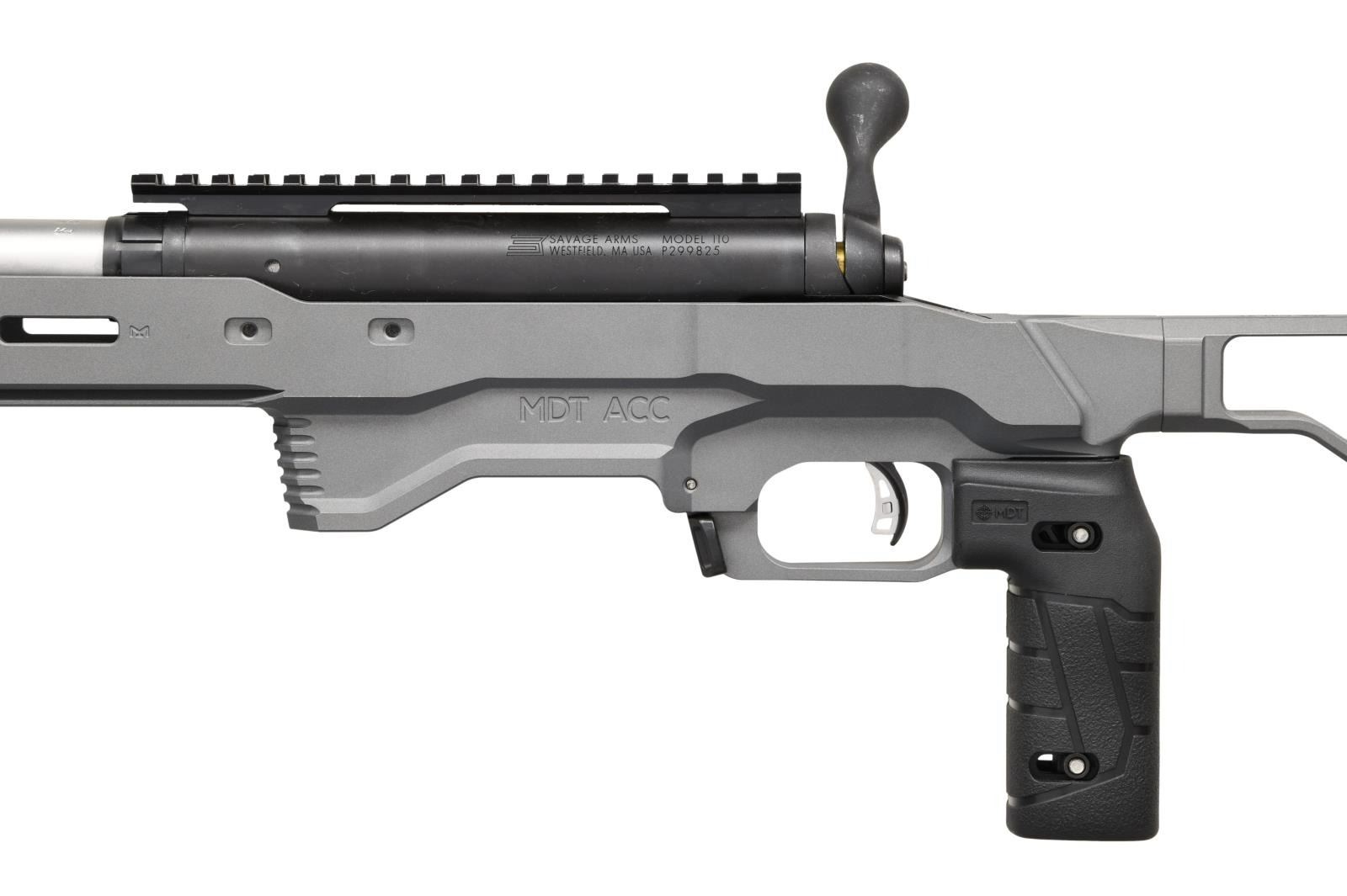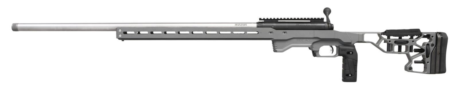 338 LAPUA MAGNUM RIFLE. Cal. 338 Lapua. S# P299825. Bbl. 30". Magazine fed bolt action precision rifle. Matte stainless steel barrel. Adjustable Core Competition chassis from Modular Driven Technologies. Pistol grip w/ fully adjustable stock. 7.5" picatinny rail above action for optics mounting. 1.5 - 4 lb user adjustable AccuTrigger. Titanium Nitride bolt body. MAGS: 1 Steel MDT 5 rd. UNATTACHED ACCESSORIES: Factory box & paperwork. CONDITION: All aspects indicate as new in box. Never sold retail. No visible blemishing. Bright bore w/ strong rifling. PROVENANCE: The Collection of Gun Sport Ltd. owned by Jon R. Thomas. (23-3460/JZ). MODERN. $1,600-2,200.
