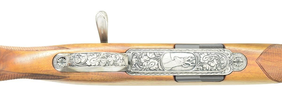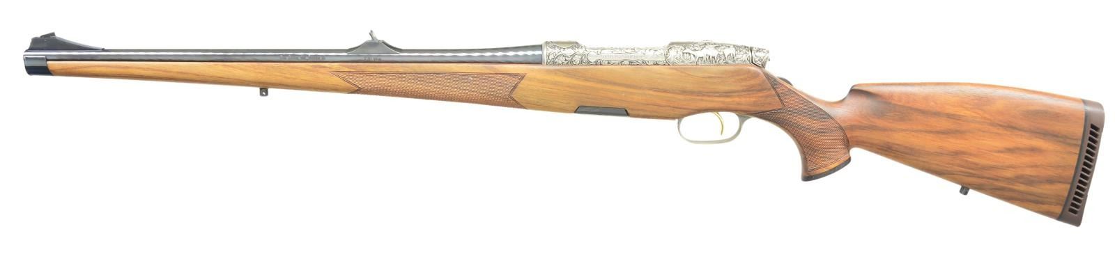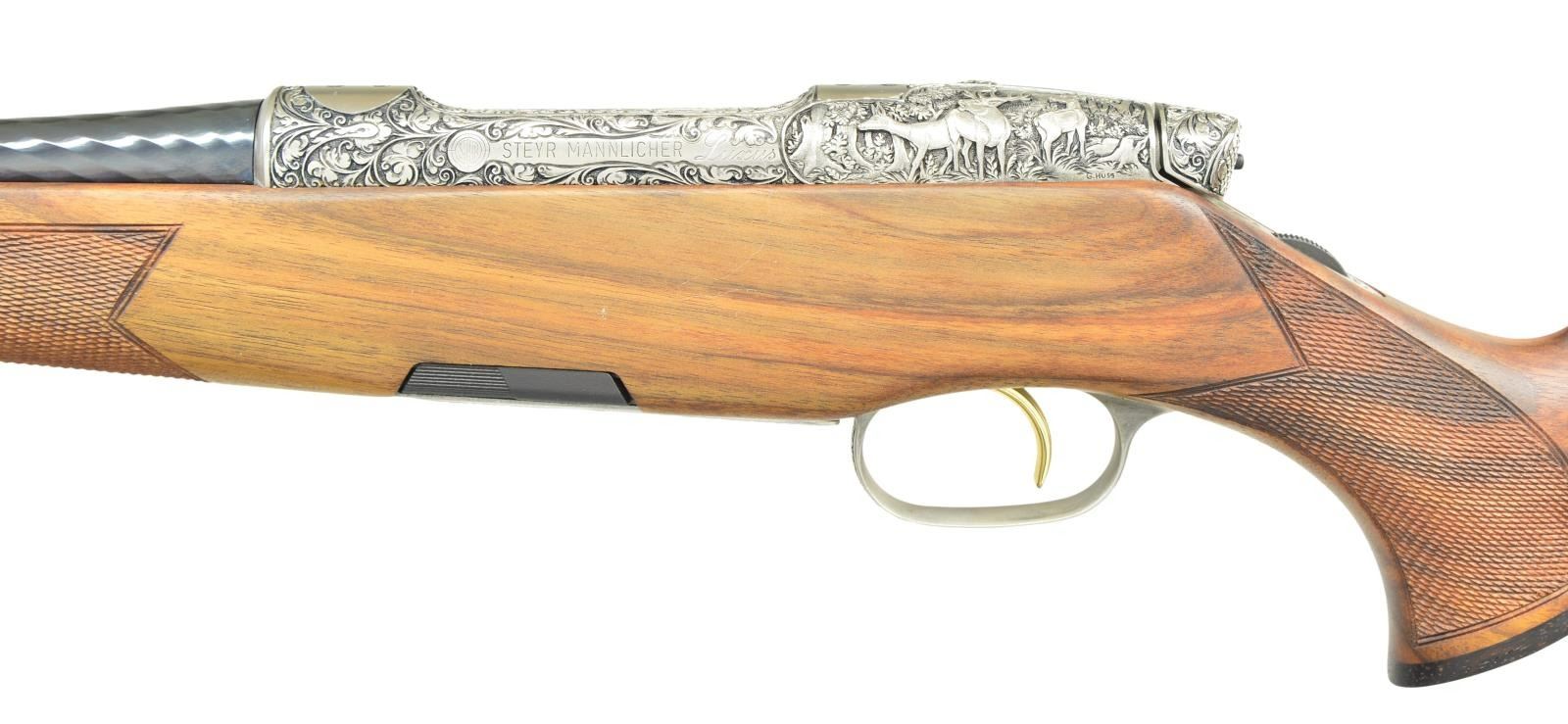 RIFLE OF PRINCE FAISAL COLLECTION. Cal. 270 Win. S# 209829. Bbl. 20" hammer forged w/ ramped elevation adjustable front sight plus rear base having express style jib locked windage adjustable rear. Barrel is Mannox coated for durability and resistance to corrosion; makings consist of proofs, caliber and distributor (Gun South Inc. of Trussville, AL). Mfg. March 1989 (1980-1996) with coin finished receiver, butterknife bolt handle, magazine base and floorplate having scroll engraving plus deep relief Roe deer scene on left rear of receiver (1 buck & 2 does). Company promoted features of 7.7 pounds, sub MOA performance and 1 in 8.6 inches barrel twist rate. Consignor states this ornate rifle was part of the Prince Faisal Collection; no further info as to which one or which country of reign. Finely checkered (2 line borders) full length (Stutzen) left handed European walnut stock with matte finish having Bavarian style double flame cheekpiece, sling studs, factory brown ventilated recoil pad, LH palm swell (Bundsweir pistol grip), wrap around forend checkering, slant cut forend cap and rosewood grip cap having Steyr logo inlay. Receiver is factory drilled and tapped for scope mounts w/ plug screws in place. Safety is rotating wheel in line behind bolt shroud that has integral cocking indicator. Very fine single stage gold plated trigger pull that also operates in single set mode for an even lighter pull; LOP is Steyr standard at 13 7/8". Smooth operating bolt having rear locking lugs is jeweled with Sako style extractor. Trigger guard assembly has spring plunger magazine ejector feature and indexed screws. MAGS: 1 steel single column 3 round w/ continuation of action engraving to include vignette of buck head and shoulders. CONDITION: all aspects near excellent including bore; new unfired appearance. (23-446/NW). MODERN. $6,500-8,500.