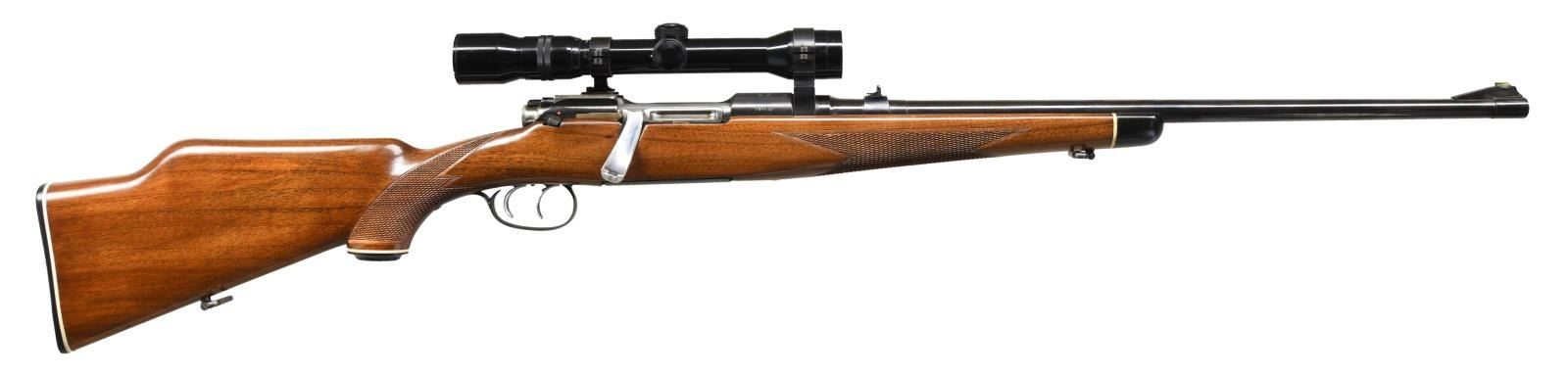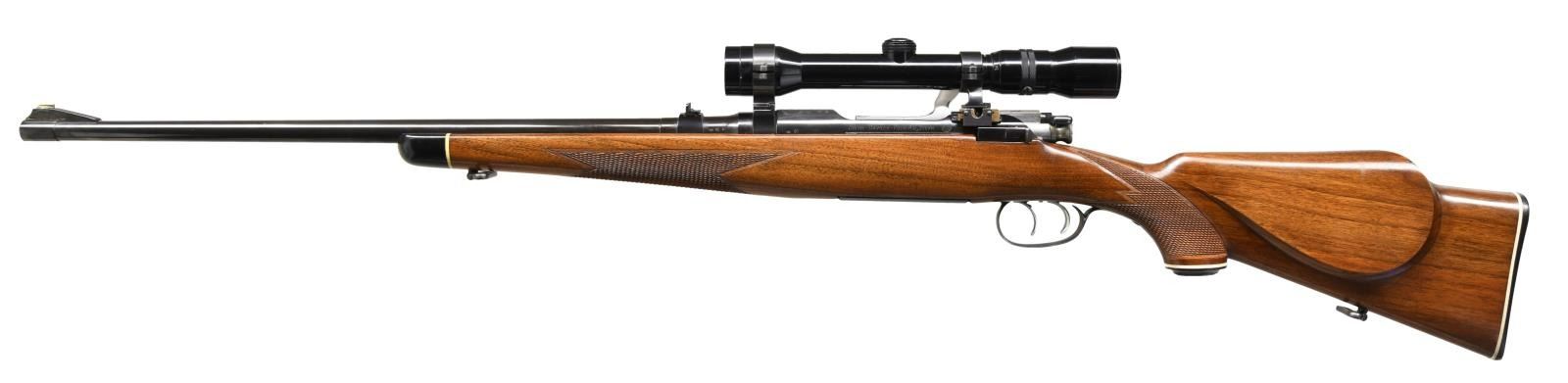 Cal. 280 Rem. S# 31870. Bbl. 22". Ramped brass blade front sight. Dual leaf folding rear sight. Receiver mounted Kahles 2.3-7x power scope w/ fine crosshair reticle & good optics. Left side of receiver & bbl. have 1961 date proofs. Top of receiver has Mannlicher Schoenauer, MC & 280 markings. Left side of receiver has Steyr markings. Floorplate has Steyr logo & Stoger marking. Butter knife handle bolt numbered "8185". Wing safety on bolt & thumb safety on right rear of receiver. Double set triggers. Checkered pistol grip walnut stock w/ raised left side cheekpiece, ebony tip, bottom mounted sling swivels & grooved factory buttplate. LOP: 14". CONDITION: stock shows scattered light dings & handling wear. Metal retains 95% original blue. Very good bright bore. PROVENANCE: The Collection of Gun Sport Ltd. owned by Jon R. Thomas. (23-3411/MJC). CURIO. $2,000-3,000.