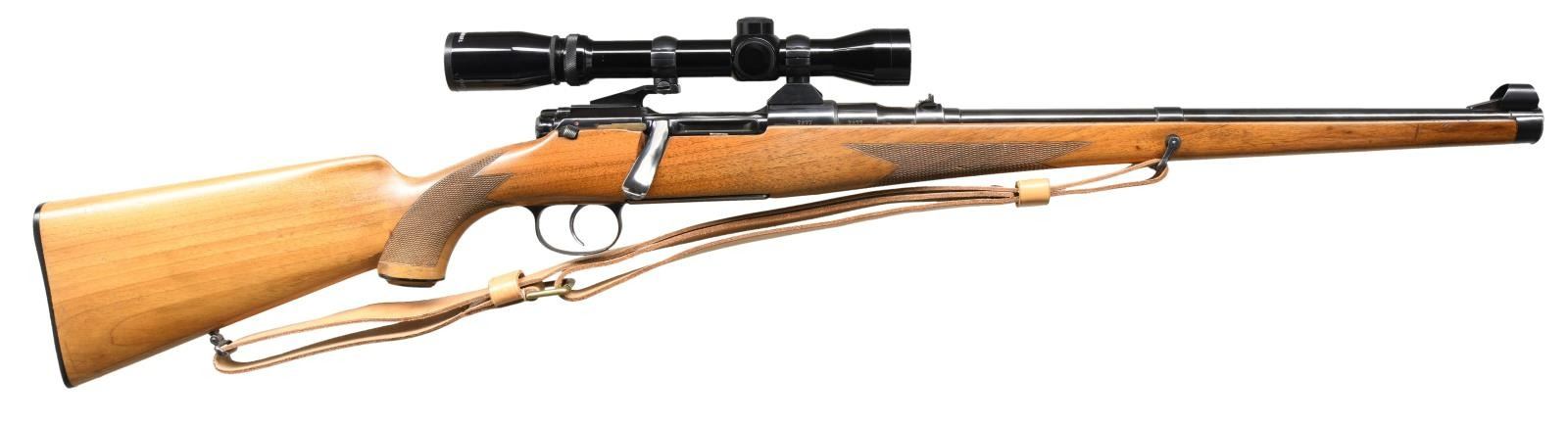CARBINE. Cal. 257 Roberts. S# 7277. Bbl. 20". Ramped brass blade front sight. Dual leaf rear sight. Receiver mounted Burris Signature 2-8x power scope w/ duplex crosshair reticle & very good optics. Left side of receiver & bbl. have 1952 dated proofs. Matching numbered swept handle butter knife bolt. Left side of receiver has Steyr markings. Floorplate has Stoeger markings w/ Steyr logo. Bolt mounted wing safety. Right side receiver safety that does not appear to be functioning properly. Single trigger. Checkered pistol grip Mannlicher stock w/ bottom mounted sling swivels, left side cheekpiece & grooved black plastic buttplate. LOP: 14". Leather sling present. CONDITION: stock shows some scattered dings & handling marks. Metal retains 90% blue w/ some staining on rear of receiver, scattered scratches & handling wear. Very good bright bore. PROVENANCE: The Collection of Gun Sport Ltd. owned by Jon R. Thomas. (23-3693/MJC). CURIO. $1,500-2,000.