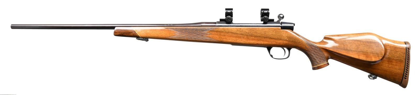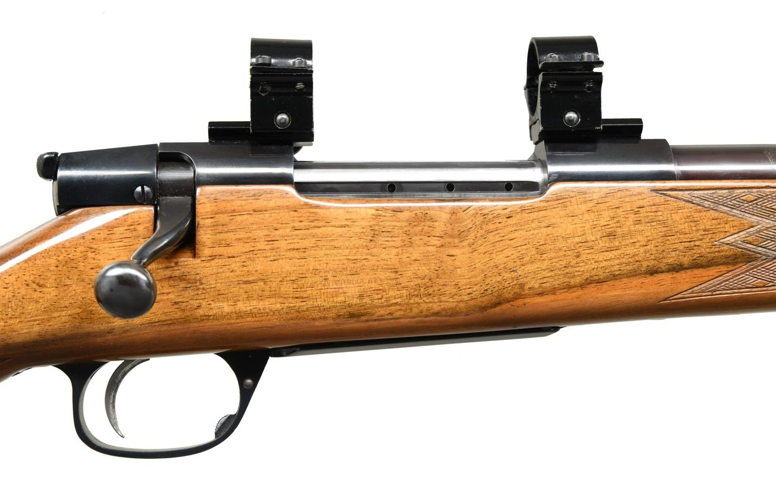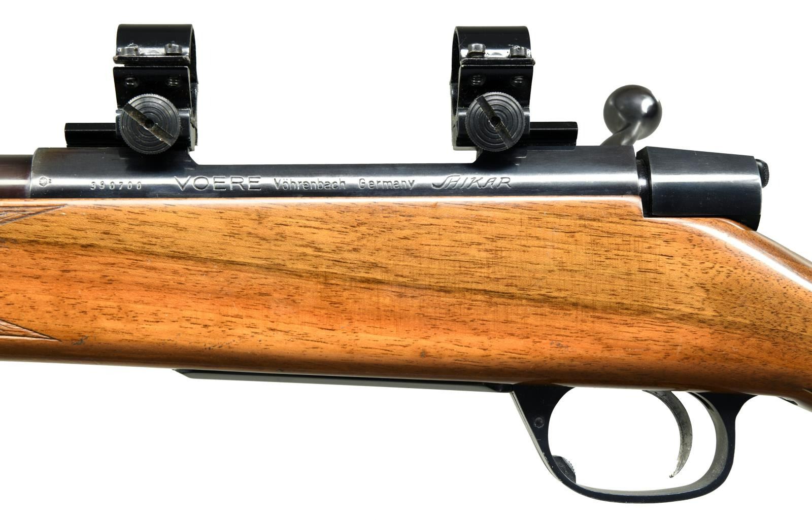 Cal. 30-06. S# 390700. Bbl 24". Shikar bolt action rifle manufactured by Voere of Germany. The left side of the barrel is stamped with the caliber designation "CAL 30-06", with an extremely faint "RH.SPEZIAL" mark over the top. Receiver is stamped with an Eagle/N commercial nitro proof, followed by the serial number, "VOERE Vohrenbach Germany" and "SHIKAR". Blued finish with a 1 piece checkered Monte Carlo pattern buttstock. CONDITION: metal components retain the majority of their original factory blue finish, exhibiting mild wear overall, with thinning on the barrel showing through to a pleasant brown patina. Mirror bore, exhibiting sharp and well defined rifling throughout. Stock shows scattered marks from handling and storage, but is otherwise very good overall. (23-4822/MLW). MODERN. $700-1,000.