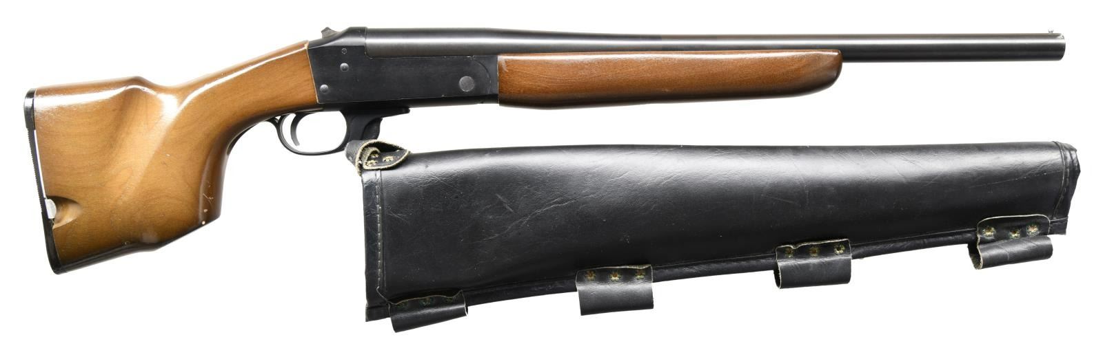 Cal. 20 Ga 2 3/4". S# D257910. Bbl. 18 1/2" choked cyl. Mfg. 1979-1981. Compact camping shotgun not meant to be fired from shoulder. Bead front sight. Hammer tip is broken but hammer is still functional. Overall length 27". Blued bbl. Anodized receiver. Hardwood pistol grip stock & forend. Grooved black buttplate w/ two storage compartments in stock. UNATTACHED ACCESSORIES: black leather scabbard. CONDITION: stock set has added varnish w/ scattered dings, scratches & handling wear. Metal retains 95% original finish w/ some edge & handling wear. Very good bright bore. (23-2551/MJC). MODERN. $300-500/