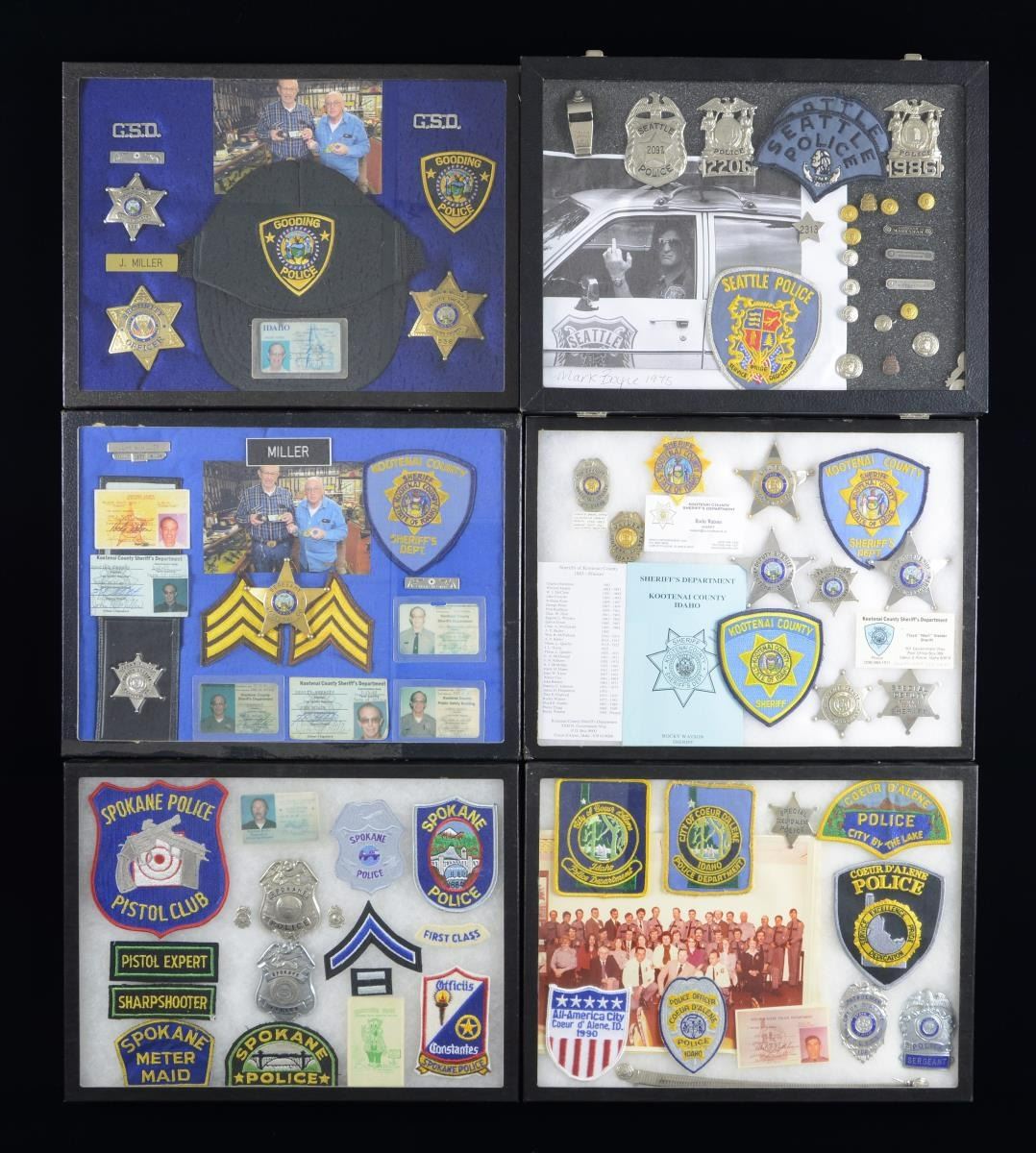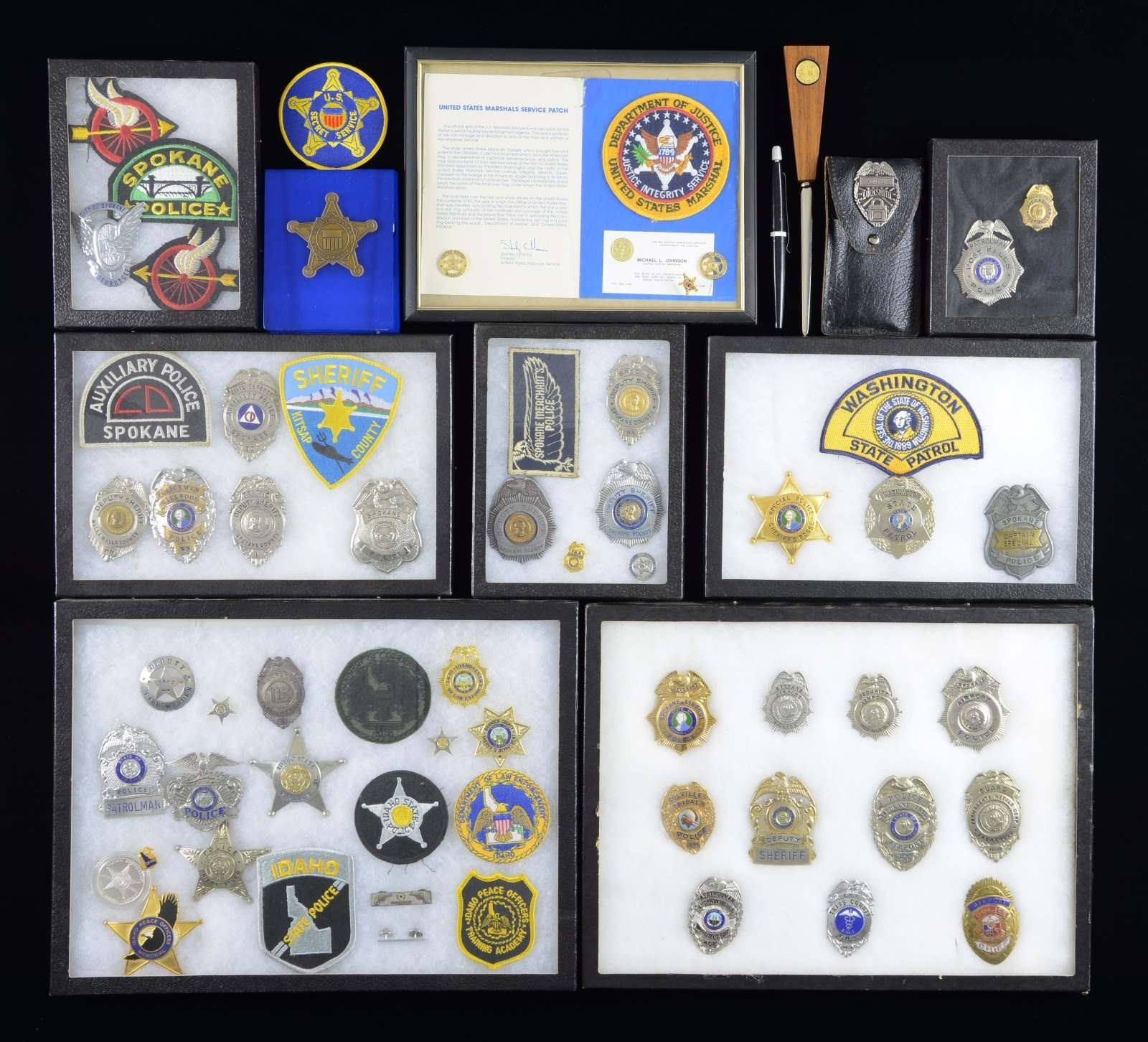 This very large & assorted group of law enforcement related items includes 59 badges of various sizes, departments, and entities. Most badges appear to date to the second half of the 20th century, but there are a few that may be earlier. There are at least 41 patches from various departments, along with a large variety of related material including uniform items, photographs, qualification badges, 2 hats, buttons, and much more. CONDITION: most items show light wear, others appear to be unissued. PROVENANCE: From the Lifelong Collection of Glen E. Mattox. (02-18723-1/BF). $1,300-1,800.