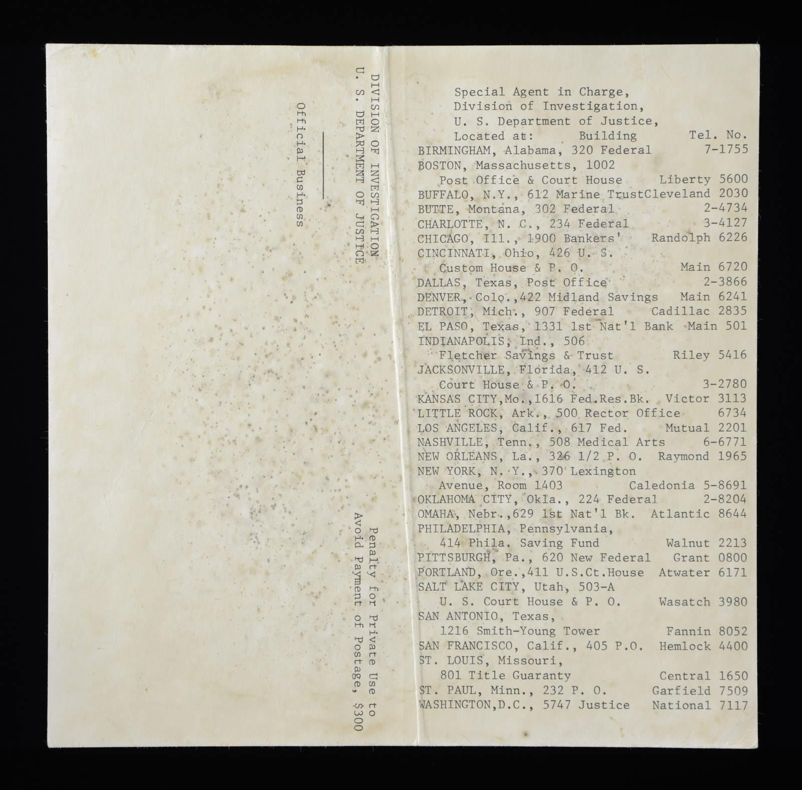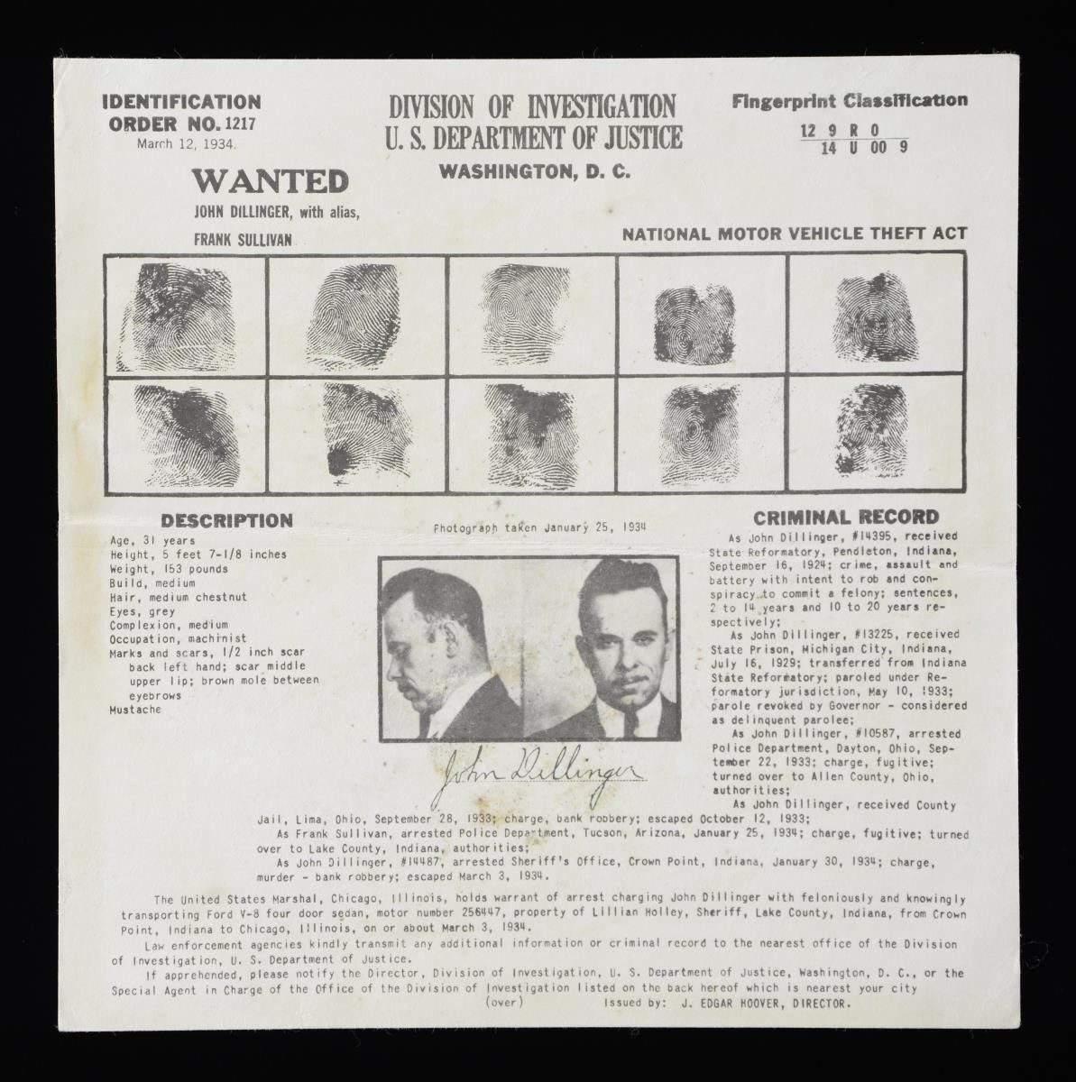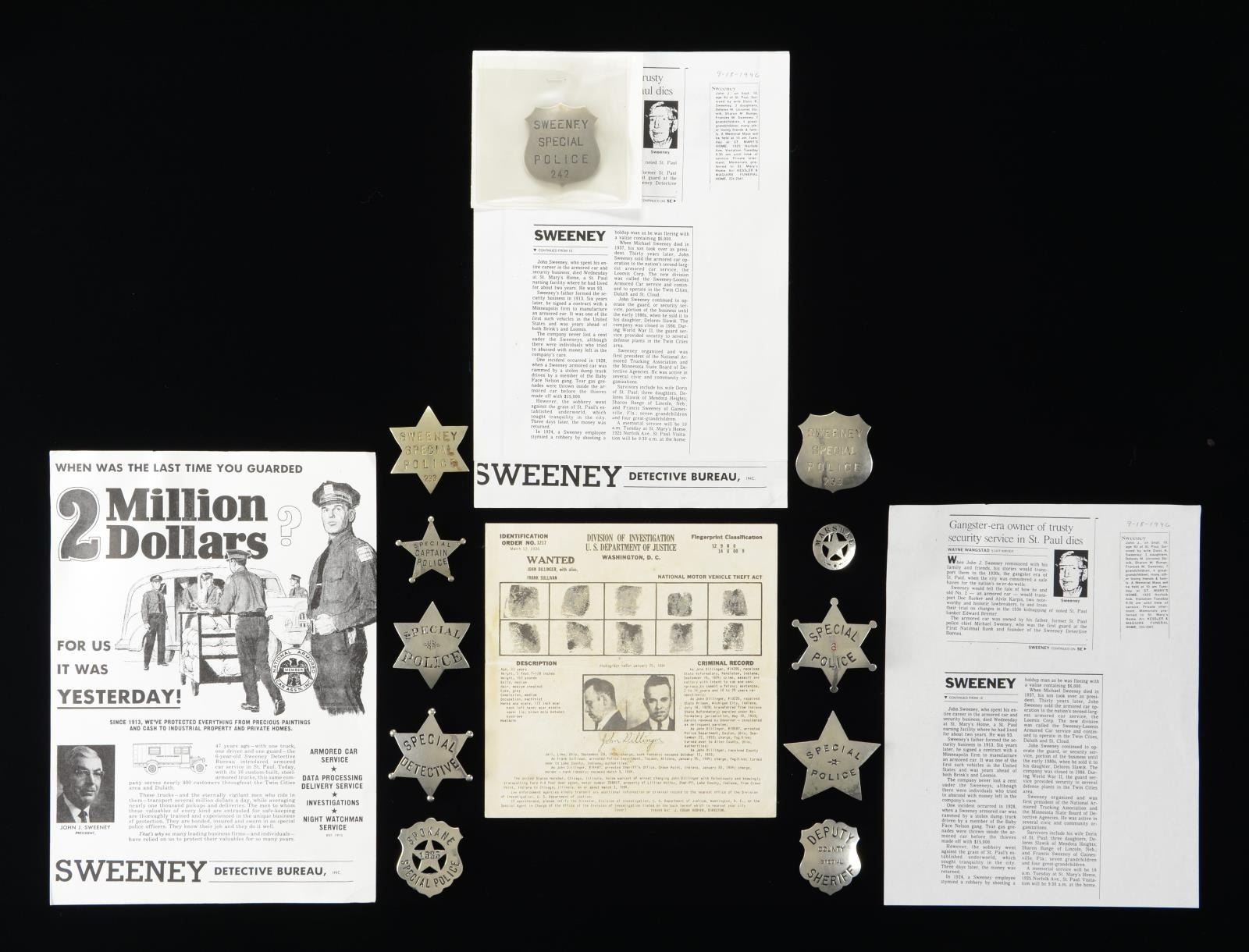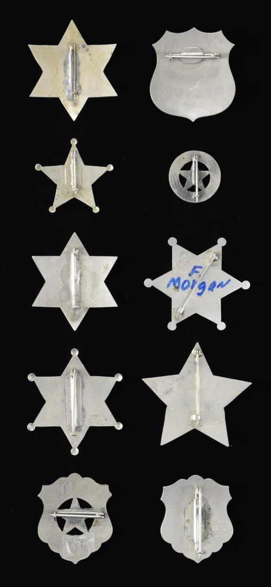 This interesting lot of badges consists of 1 badge of the 6-pointed star style by Art Burnside that reads "SPECIAL 6 POLICE" on the front. / 1 Badge of the 5-pointed star style by G.D. Reese that reads "SPECIAL (star) POLICE". / 1 Badge of the 5-pointed star style that reads "SPECIAL CAPTAIN POLICE". / 1 Badge of the 6-pointed star style by Rubber Stamp Co. that reads "SPECIAL DETECTIVE". / 1 Badge of the star-within-a-shield style that reads "SPOKANE 1535 SPECIAL POLICE". / 1 Badge of the shield style by Art Burnside that reads "DEPUTY COUNTY SPECIAL POLICE". / 1 Badge of the 6-pointed star style, missing its pin, that reads "SPECIAL (scrollwork) POLICE". / 1 Badge of the circle-around-star style by Northwestern Stamp Works that reads "MARSHALL". / 1 Badge of the shield style by American Stamp Works that reads "SWEENEY SPECIAL POLICE 233". / 1 Badge of the 6-pointed star style with an unmarked reverse that reads "SWEENEY SPECIAL POLICE 233". / 1 Badge of the shield style marked "AMERICAN STAMP WORKS" that reads "SWEENEY SPECIAL POLICE 242". / 1 Wanted poster with fingerprints & photo for John Dillinger. Poster measures 8" square and was designed to be mailed by the US Department of Justice. CONDITION: all badges show light wear except as noted. Poster has been folded for mailing purposes. PROVENANCE: From the Lifelong Collection of Glen E. Mattox. (02-18723-2/BF). $1,200-1,500.