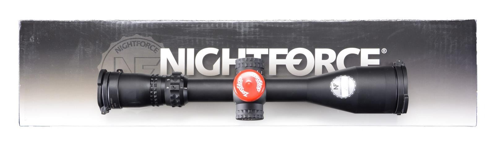 WITH FACTORY BOX. NX8 4-42x50mm scope manufactured by Nightforce. Black anodized aluminum construction with illuminated optic and MOAR reticule. ZeroStop elevation adjustment. Exterior retains its factory inspection sticker. UNATTACHED ACCESSORIES: original factory box containing factory paperwork. CONDITION: near new, exhibiting few minute superficial marks from handling and storage. Scope retains a clear and sharp optic. Box shows some mild exterior wear, but otherwise remains sturdy and serviceable. PROVENANCE: The Collection of Gun Sport Ltd. owned by Jon R. Thomas. (02-20636/MLW). $1,500-2,250.