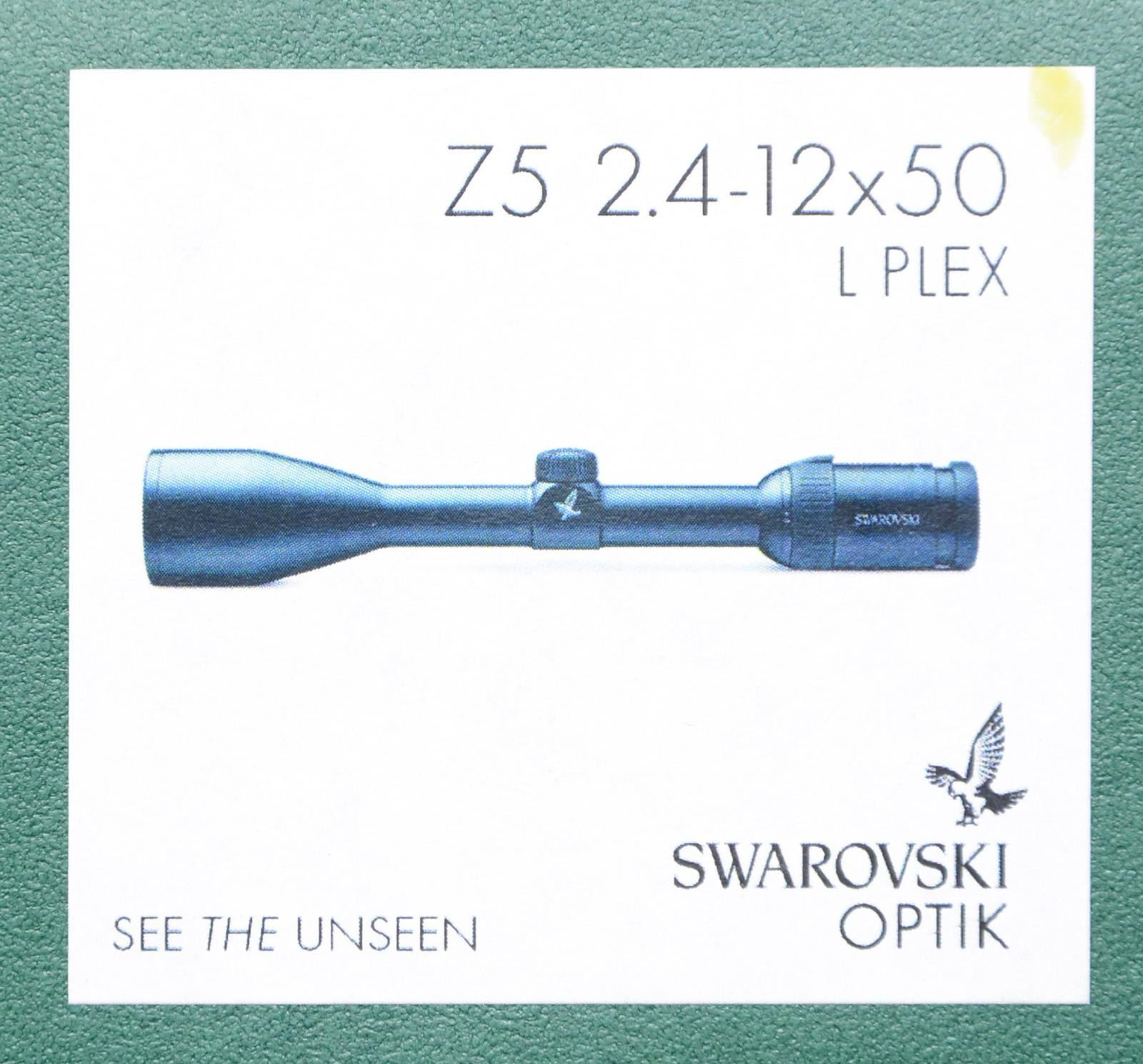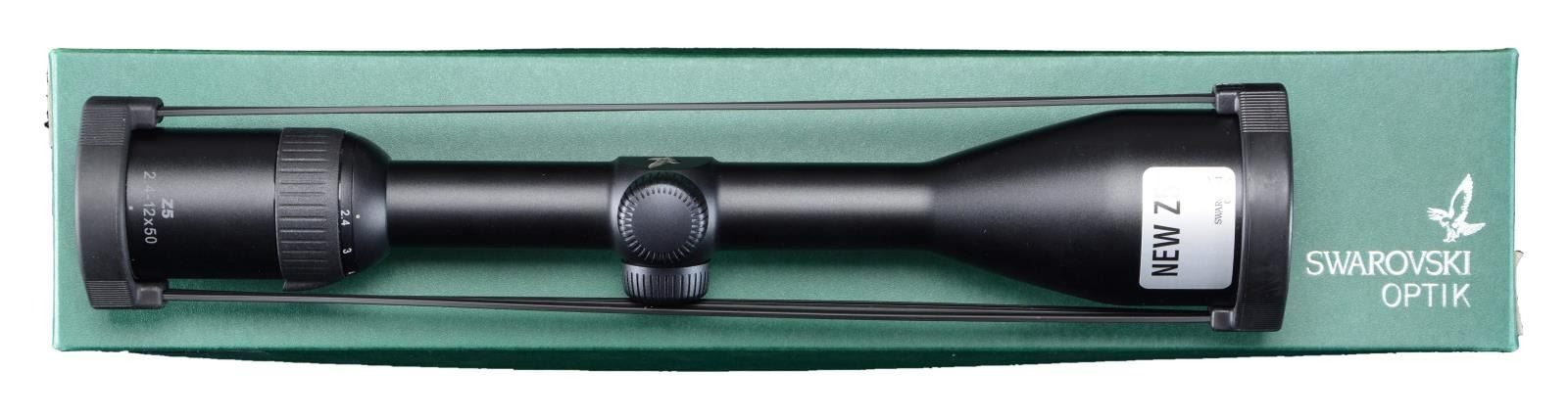 MATCHING FACTORY BOX. Z5 2.4-12x50mm scope manufactured by Swarovski. Ring mount compatibility with L Plex reticule. Scope still retains its "NEW Z5" sticker. Lens covers are present. UNATTACHED ACCESSORIES: matching factory box containing factory paperwork. CONDITION: near new, with the exterior exhibiting few minute superficial marks from handling and storage. Scope retains a clear and sharp optic. Box shows some mild exterior wear, but otherwise remains sturdy and serviceable. PROVENANCE: The Collection of Gun Sport Ltd. owned by Jon R. Thomas. (02-20656/MLW). $900-1,300.