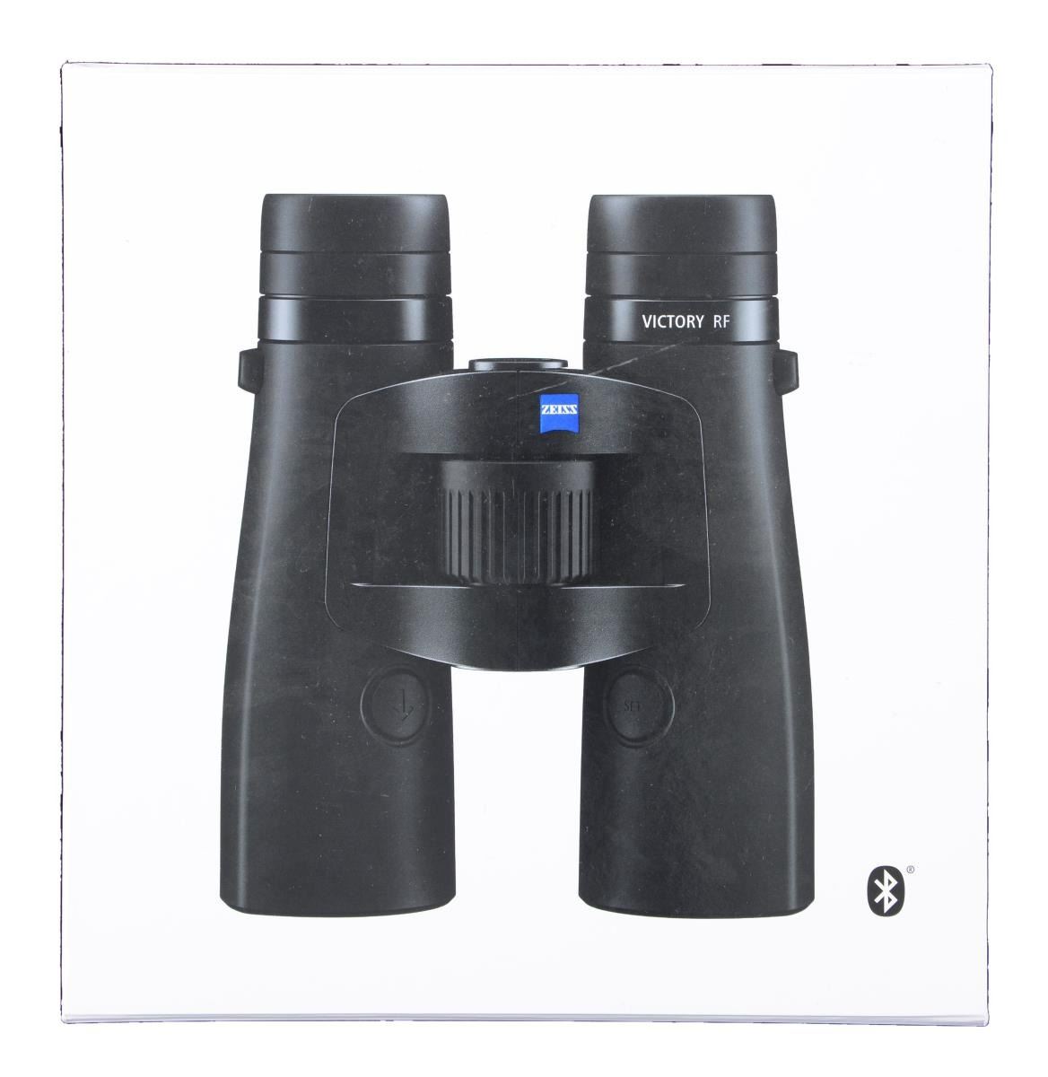 BINOCULARS. Victory RF 10x42 bluetooth rangefinder binoculars manufactured by Zeiss. Precision target distance measuring of up to 2,300 meters, bluetooth synchronization with Zeiss Hunting app, transer of personal ballistic data, LotuTec lens coating, and Zeiss T* lens coating. CONDITION: sealed in box. Exterior of box exhibits some marks from handling and storage, but otherwise remains sturdy and serviceable. PROVENANCE: The Collection of Gun Sport Ltd. owned by Jon R. Thomas. (02-20688/MLW). $2,500-3,250.