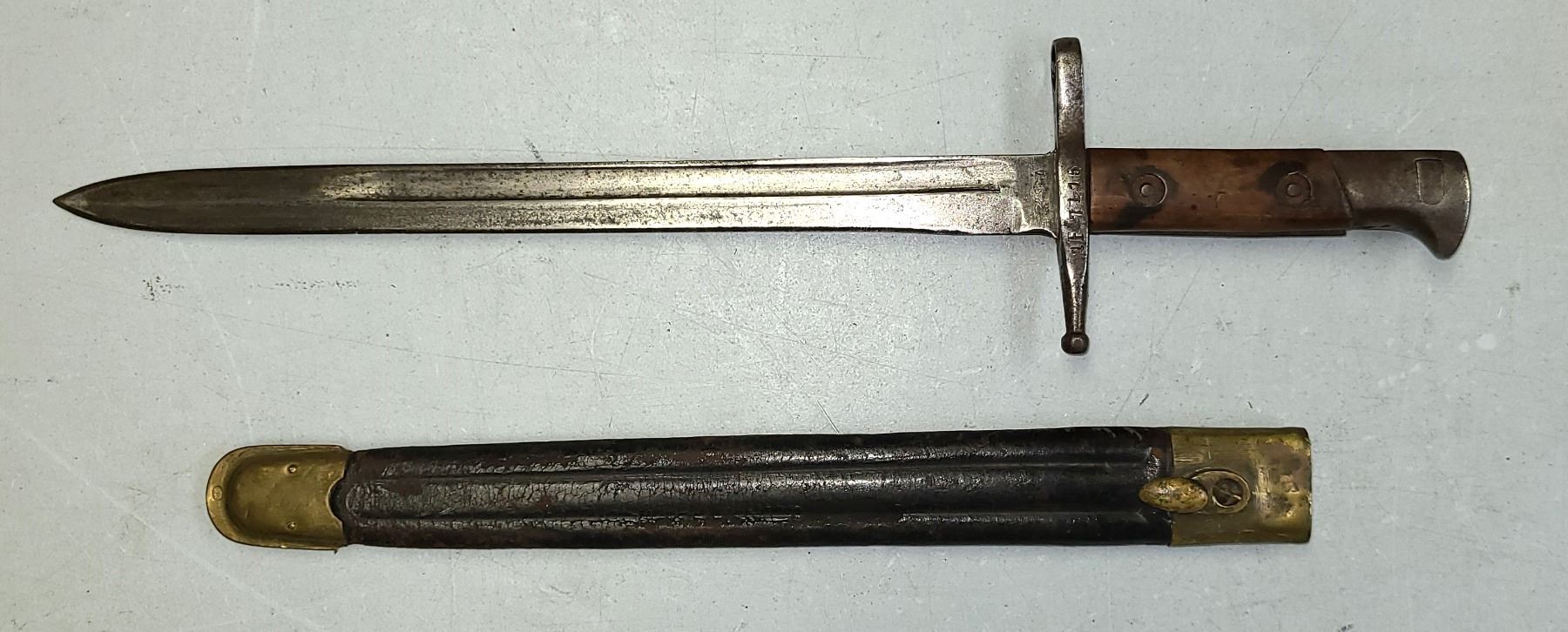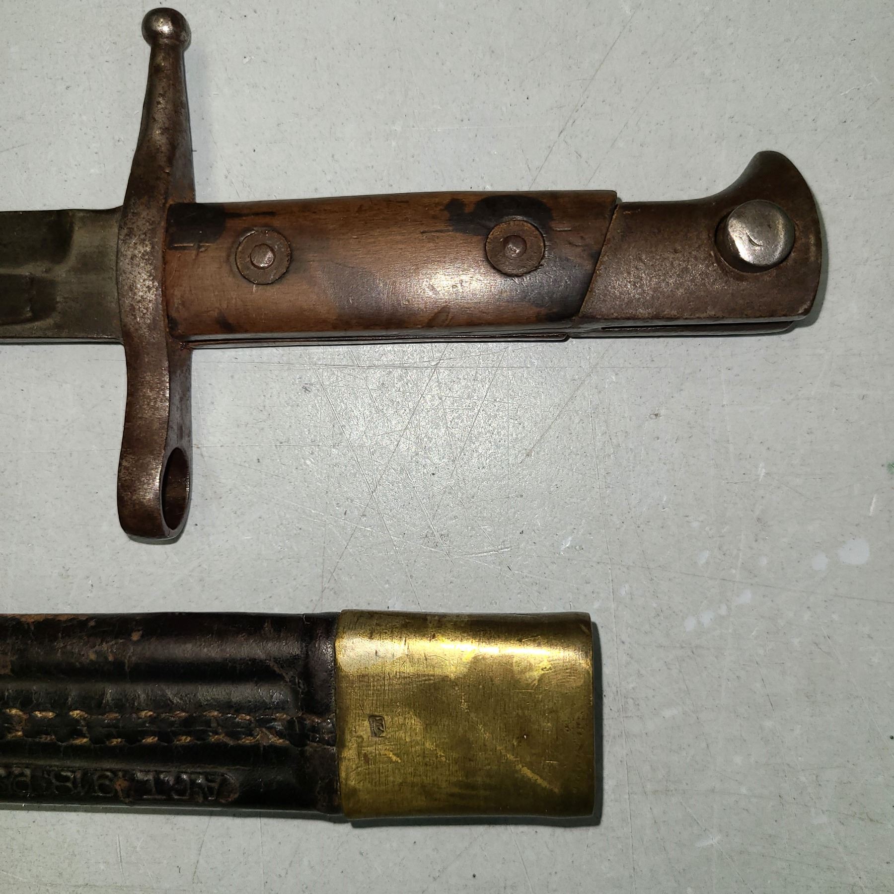 The scabbard is in fair condition with sonme surface loss to the leather.. - There are some dents to the brass top but bayonet fits very snug.