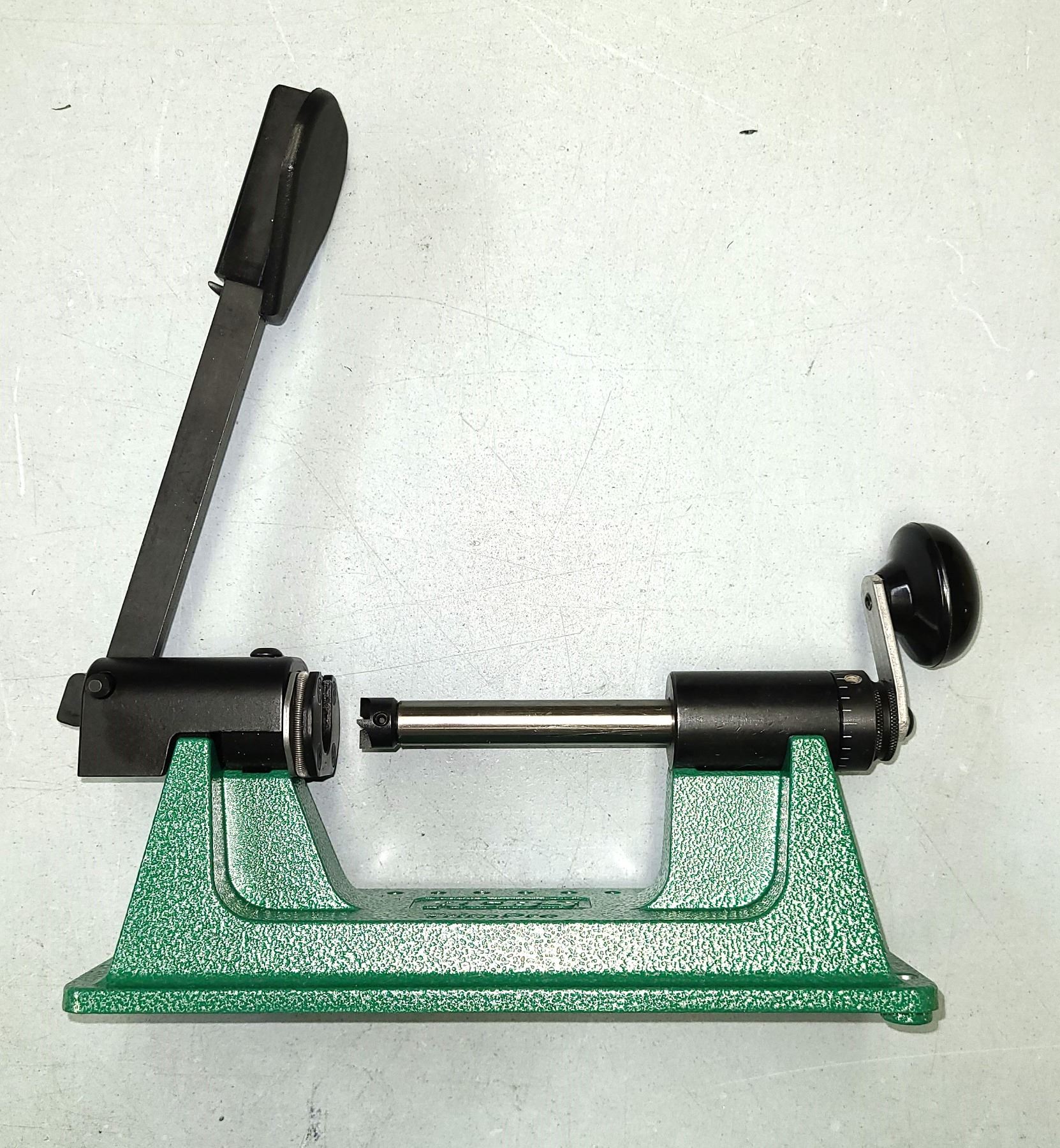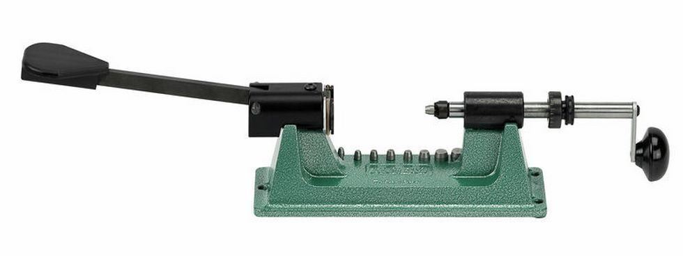 The spring-loaded shell holder securely locks the case in alignment with the cutter.