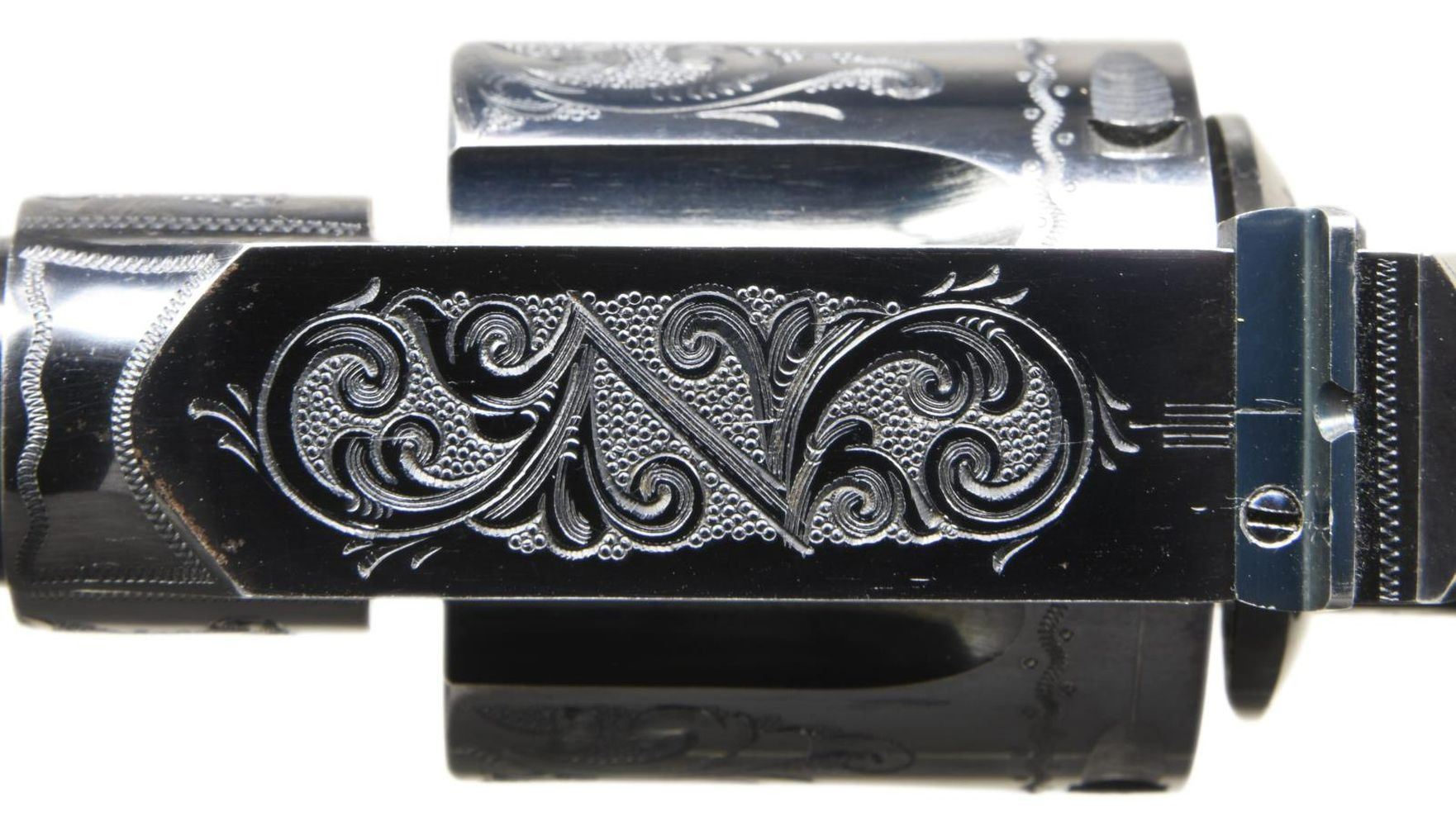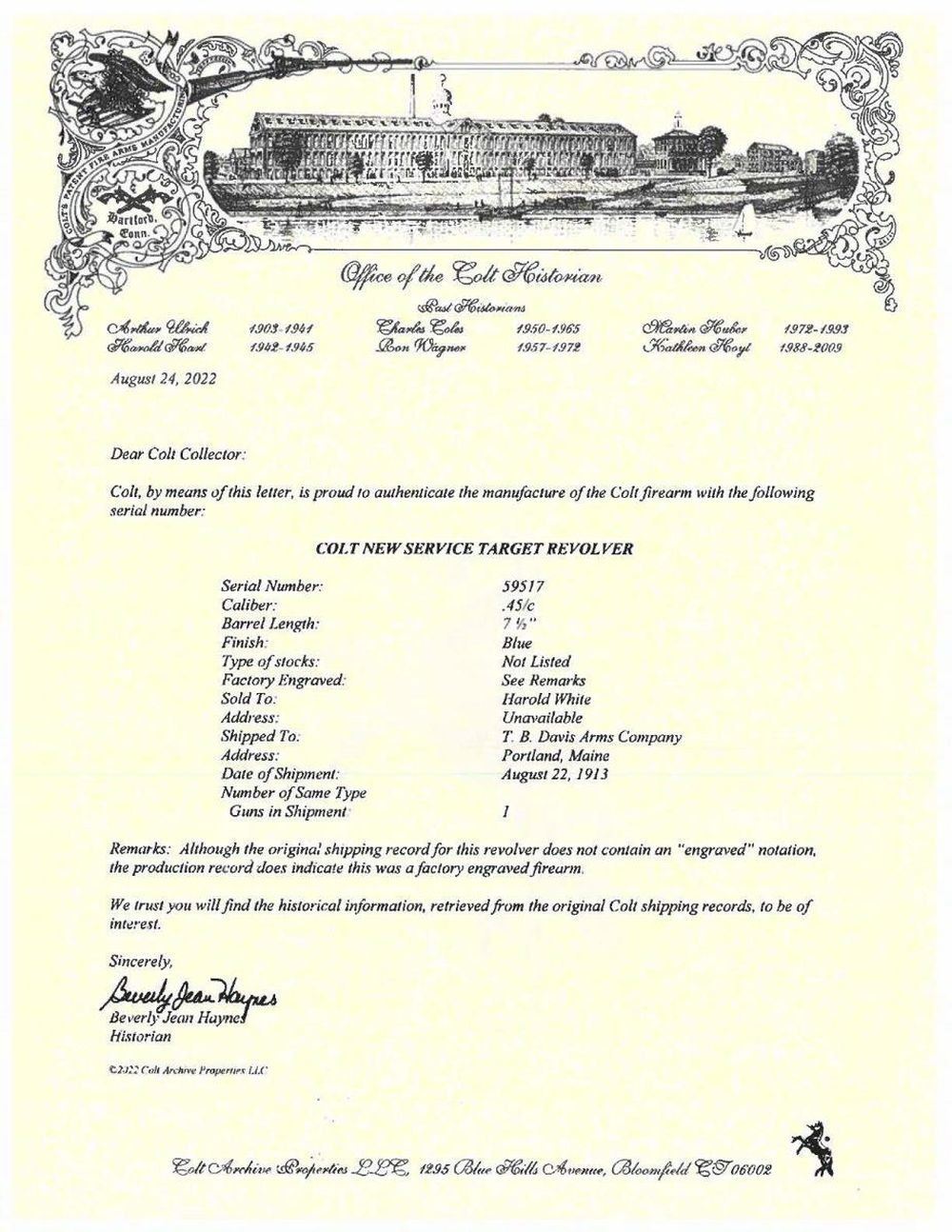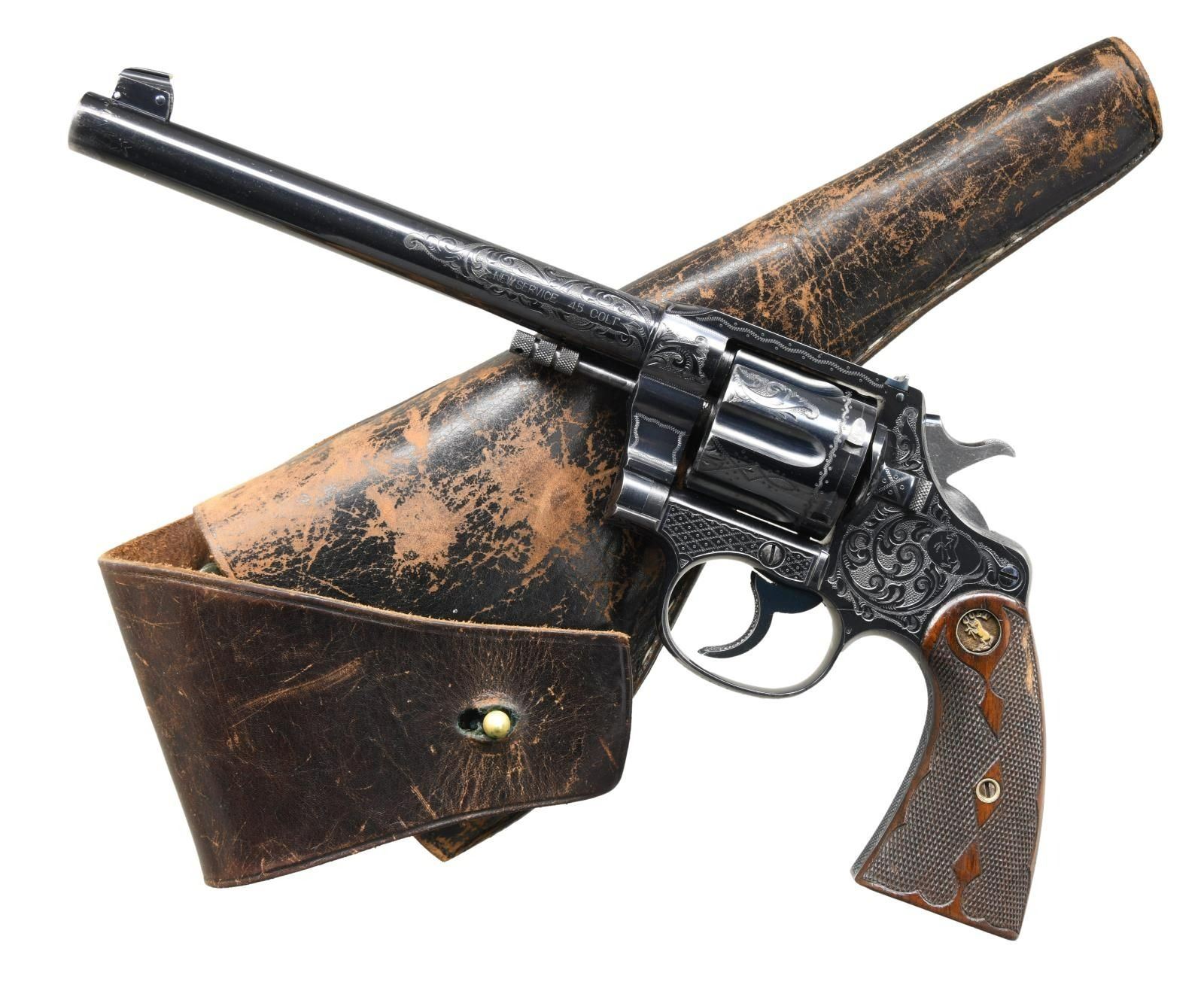 Cal. 45 Colt, S#. 58517. Outstanding flat top target revolver originally sold in Portland, Maine to the consignors great-grandfather is fresh to the market. Factory style "C" coverage engraving. Engraving consists of scroll with punch dot backgrounds on fame sides, top, cyl. and breech end of bbl. Complementing highlights adorn the trigger guard and butt as well as front & rear frame areas. Bbl. 7 1/2" with elevation adjustable bead front and windage adjustable U-notch target rear sights. Blue finish with fire blue trigger and fire blue hammer having polished sides. Hammer and grip straps are checkered. Checkered walnut 2 piece grips with rampant colt medallions. UNATTACHED ACCESORIES: Colt letter signed by Beverly Jean Haynes, historian listing the following: "Serial Number ; 59517, Caliber: 45/c, Barrel Length: 7 1/2", Finish: Blue, Type of stocks: Not Listed, Factory Engraved: See Remarks, Sold To; Harold White, Address: Unavailable, Shipped To: T. B. Davis Arms Company, Address: Portland, Maine, Date of Shipment: August 22, 1913, Guns in Shipment: 1, Remarks: Although the original shipping record for this revolver does not contain an "engraved" notation, the production record does indicate this was a factory engraved firearm." A notarized letter traces the family ownership from the original owner to the consignee. The holster is factory made of flap style marked "708" on the back. The lightly marked name on the back appears to be that of "Harold White". The original owner, Harold Sewall White Sr. (1889-1958) was the brother of Wallace Humphrey White Jr. (1877-1952) who was a US Senator and Senate Minority Leader for 18 years. CONDITION: fine, retaining over 95% original metal finish showing slight edge and muzzle wear with a light cyl. drag line. Grips show moderate finish and checkering wear with small dents, scratches & marks at butt. Tight sound action. The bore is bright with near excellent rifling. (23-5422/DS). CURIO. $20,000-30,000.