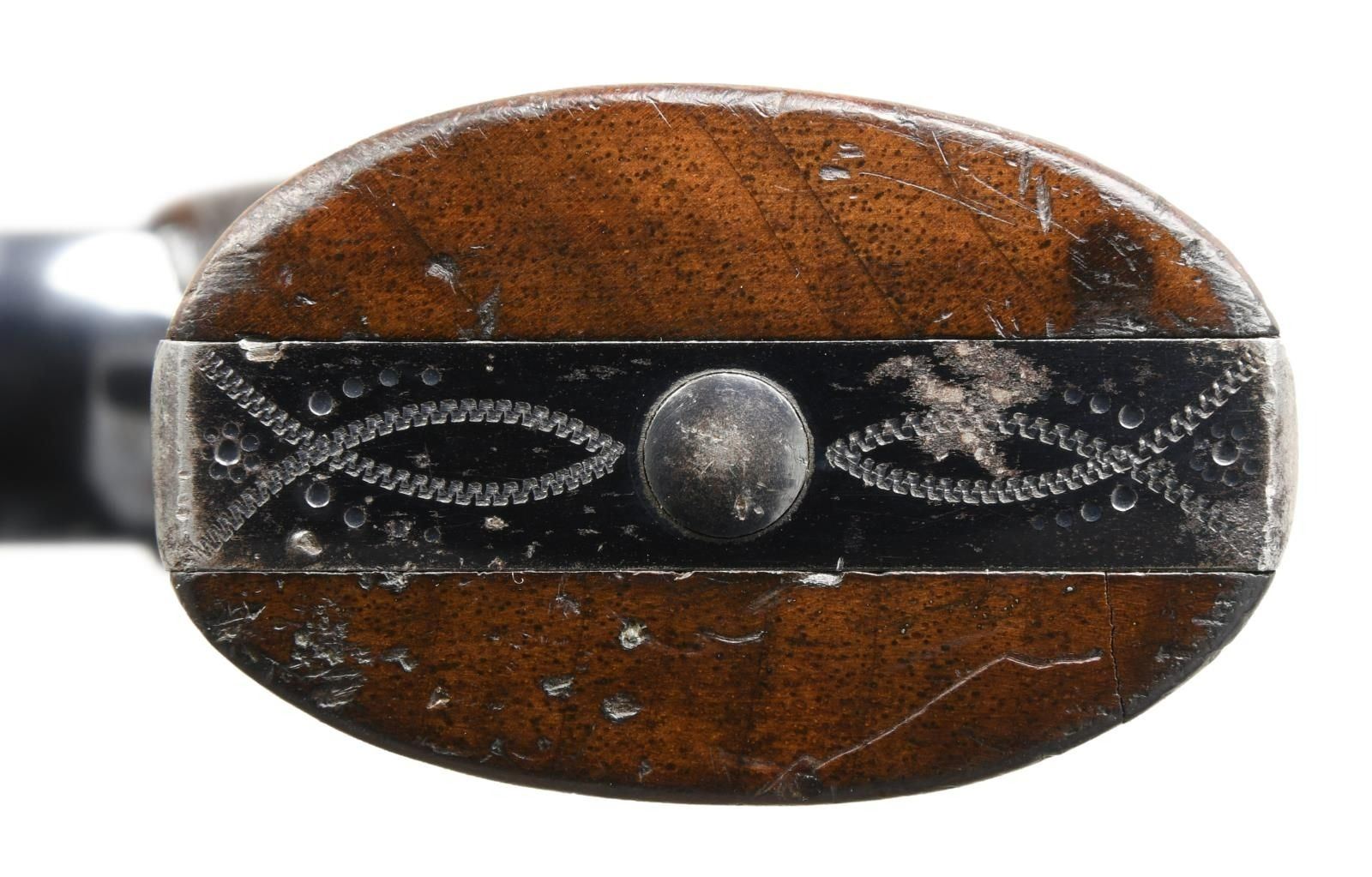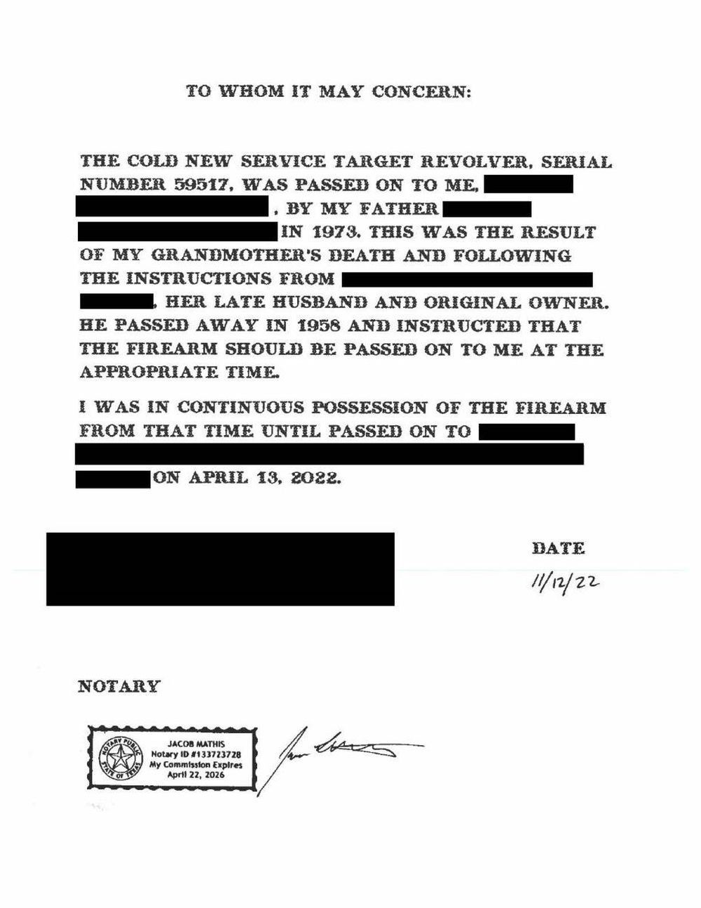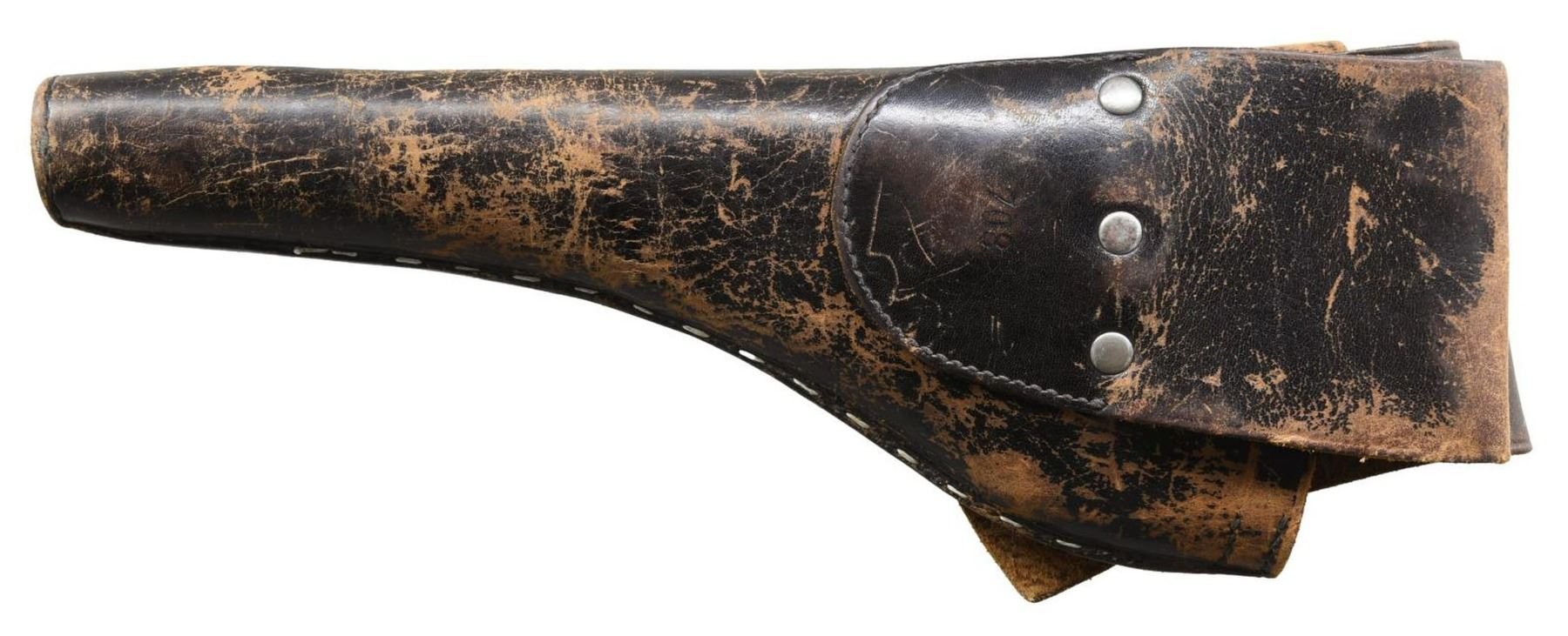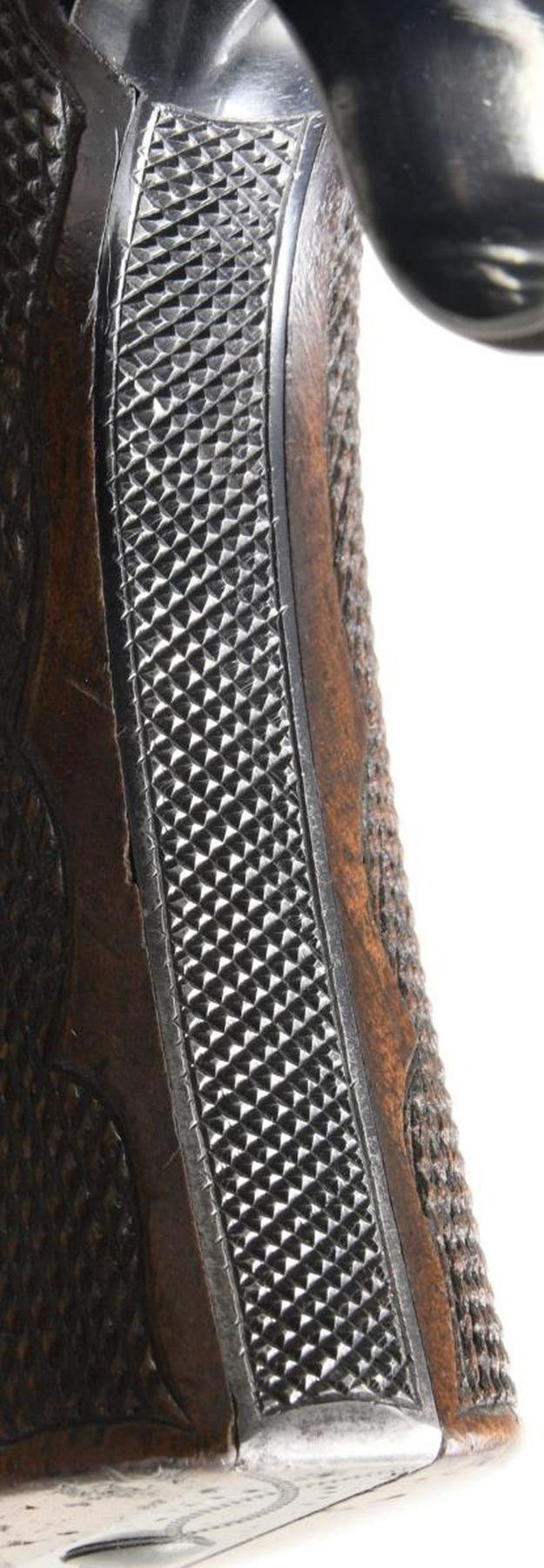 Cal. 45 Colt, S#. 58517. Outstanding flat top target revolver originally sold in Portland, Maine to the consignors great-grandfather is fresh to the market. Factory style "C" coverage engraving. Engraving consists of scroll with punch dot backgrounds on fame sides, top, cyl. and breech end of bbl. Complementing highlights adorn the trigger guard and butt as well as front & rear frame areas. Bbl. 7 1/2" with elevation adjustable bead front and windage adjustable U-notch target rear sights. Blue finish with fire blue trigger and fire blue hammer having polished sides. Hammer and grip straps are checkered. Checkered walnut 2 piece grips with rampant colt medallions. UNATTACHED ACCESORIES: Colt letter signed by Beverly Jean Haynes, historian listing the following: "Serial Number ; 59517, Caliber: 45/c, Barrel Length: 7 1/2", Finish: Blue, Type of stocks: Not Listed, Factory Engraved: See Remarks, Sold To; Harold White, Address: Unavailable, Shipped To: T. B. Davis Arms Company, Address: Portland, Maine, Date of Shipment: August 22, 1913, Guns in Shipment: 1, Remarks: Although the original shipping record for this revolver does not contain an "engraved" notation, the production record does indicate this was a factory engraved firearm." A notarized letter traces the family ownership from the original owner to the consignee. The holster is factory made of flap style marked "708" on the back. The lightly marked name on the back appears to be that of "Harold White". The original owner, Harold Sewall White Sr. (1889-1958) was the brother of Wallace Humphrey White Jr. (1877-1952) who was a US Senator and Senate Minority Leader for 18 years. CONDITION: fine, retaining over 95% original metal finish showing slight edge and muzzle wear with a light cyl. drag line. Grips show moderate finish and checkering wear with small dents, scratches & marks at butt. Tight sound action. The bore is bright with near excellent rifling. (23-5422/DS). CURIO. $20,000-30,000.