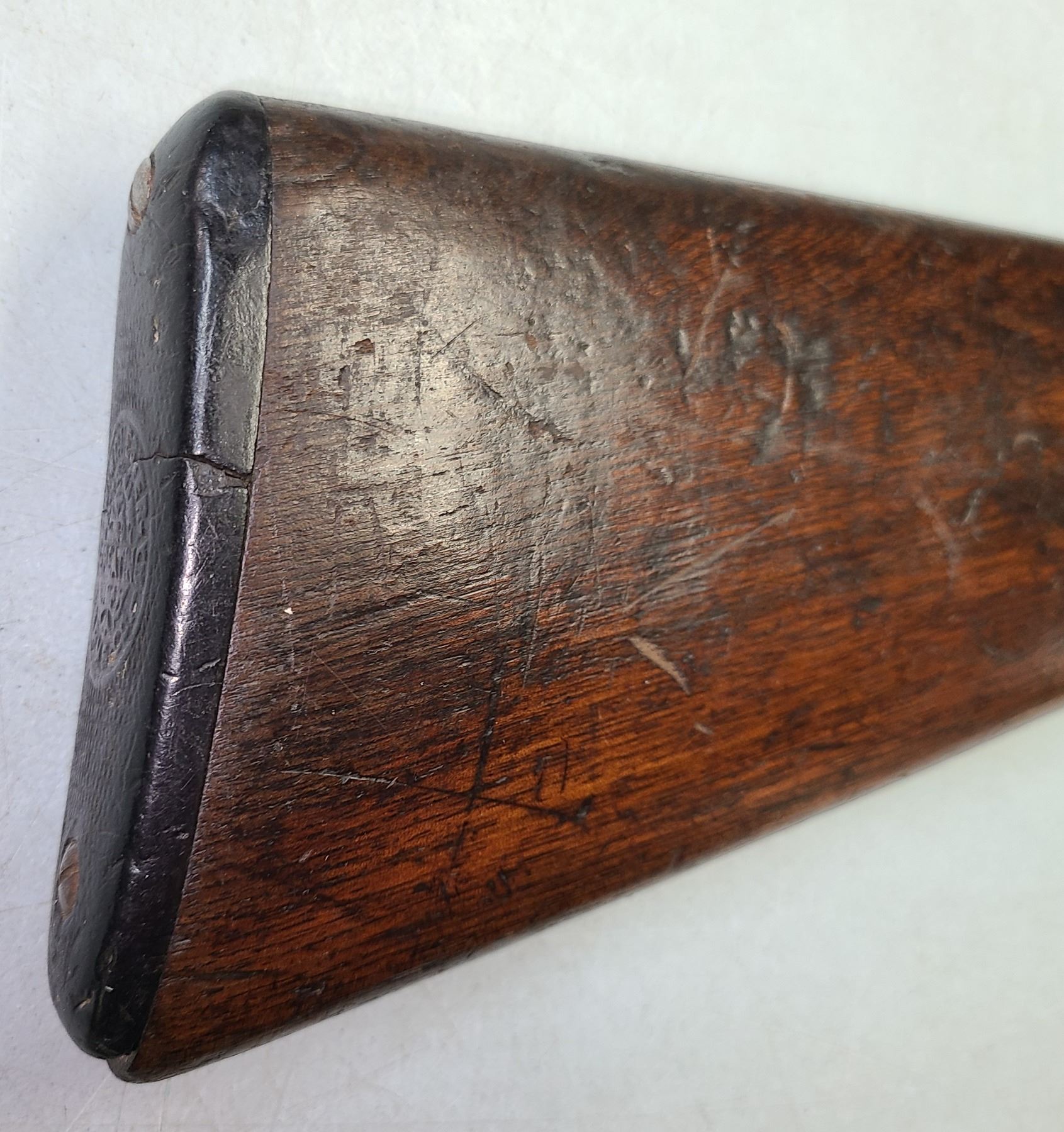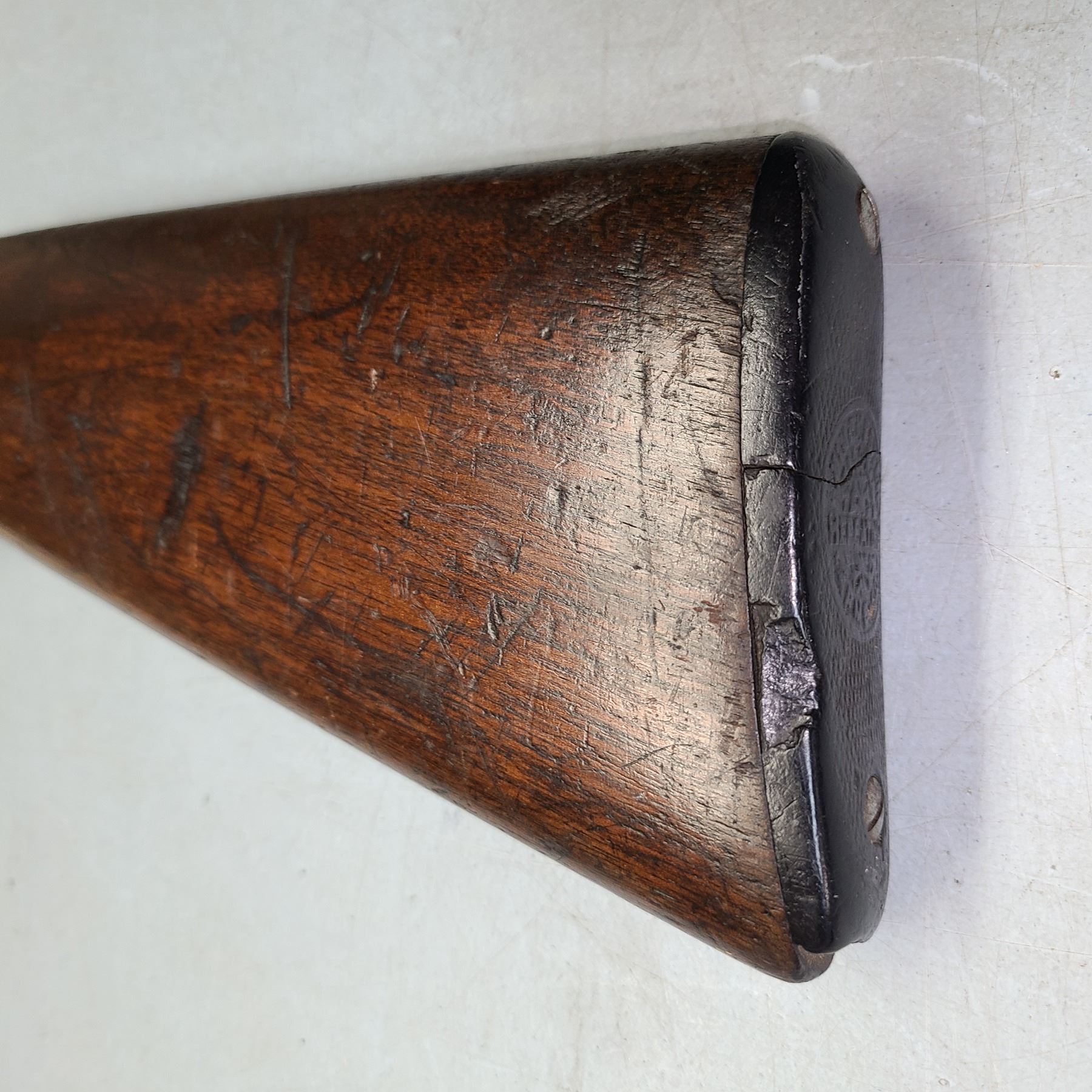 Original butt pad is cracked and chipped but still sits tight to the wood stock.