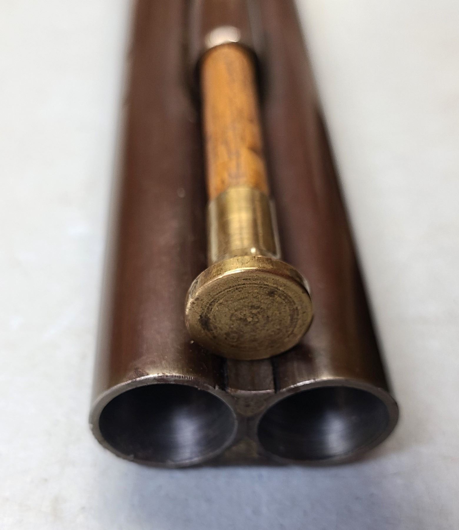 Twin side by side barrels measure 28" long with slight fading of the bluing at carry position..