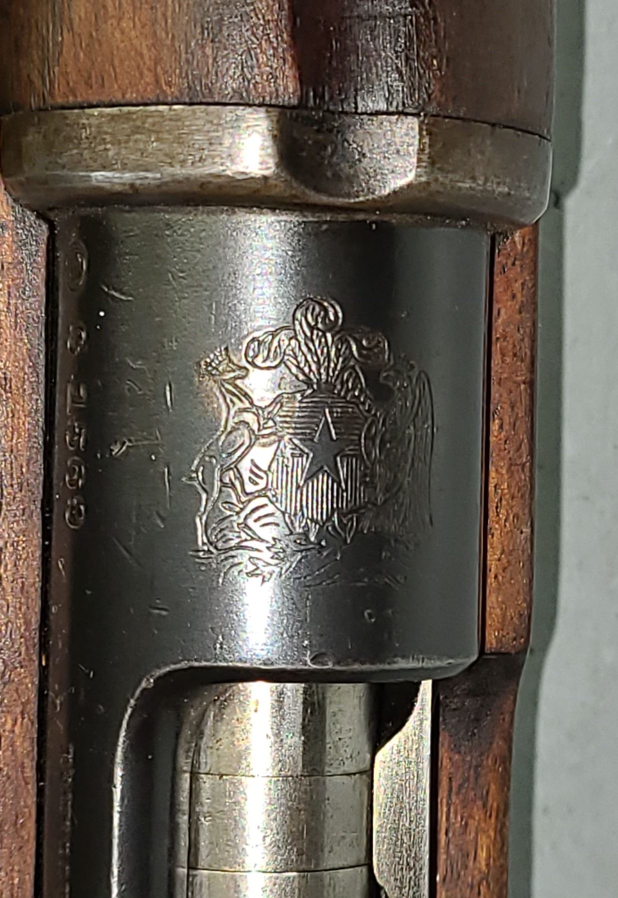 Has the Chilean Coat of Arms stamped into top of receiver. On side is stamped