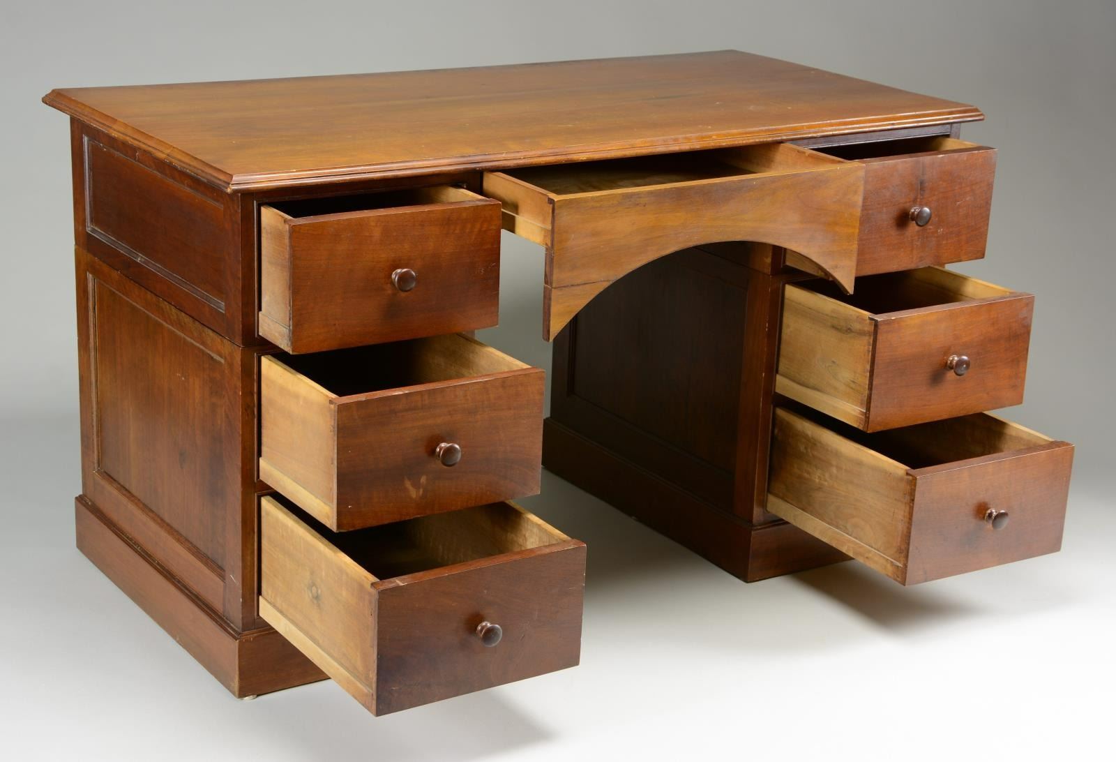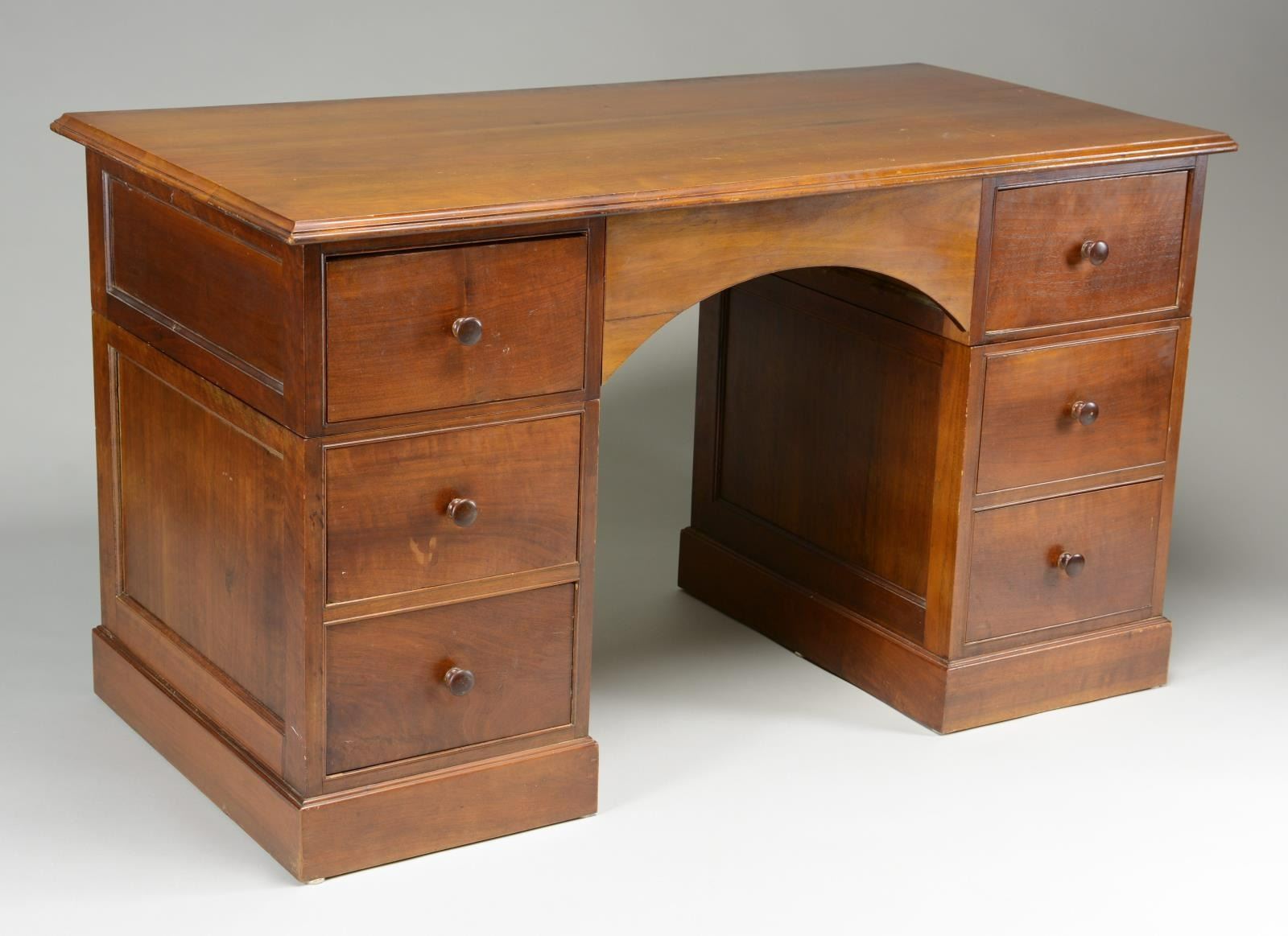52x28x30” beautiful take-down solid hardwood desk of this type sometimes seen in Spanish American, WW1 & WW2 era images of officers in tents. Always wondered how they got this kind of furniture in the field. This desk breaks down into three pieces, and fits tightly with no screws or fasteners needed. The two 2-drawer sections hold the 9” top with arch cut for knees with a long thin narrow drawer. This desk was used by both general officers Fred Sladen & Fred Sladen, Jr. CONDITION: very good overall. (02-21076/JS). $200-300.