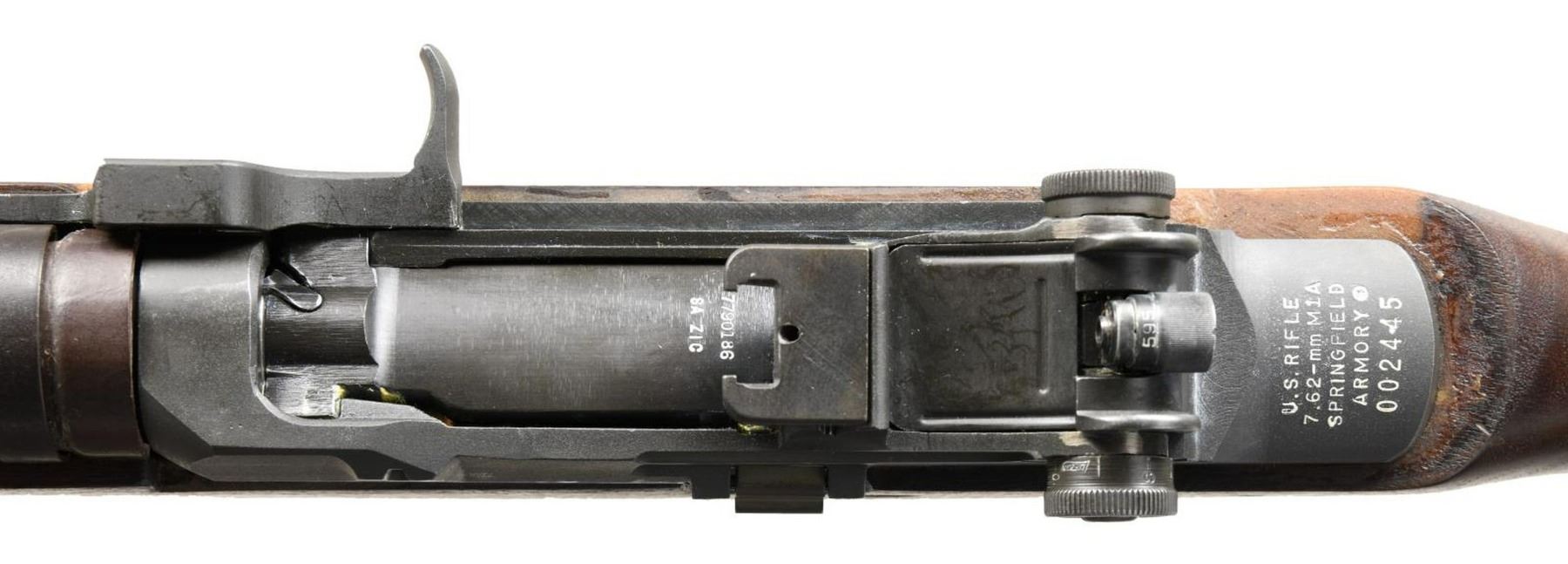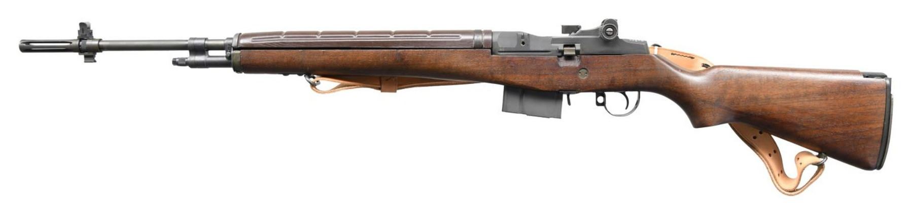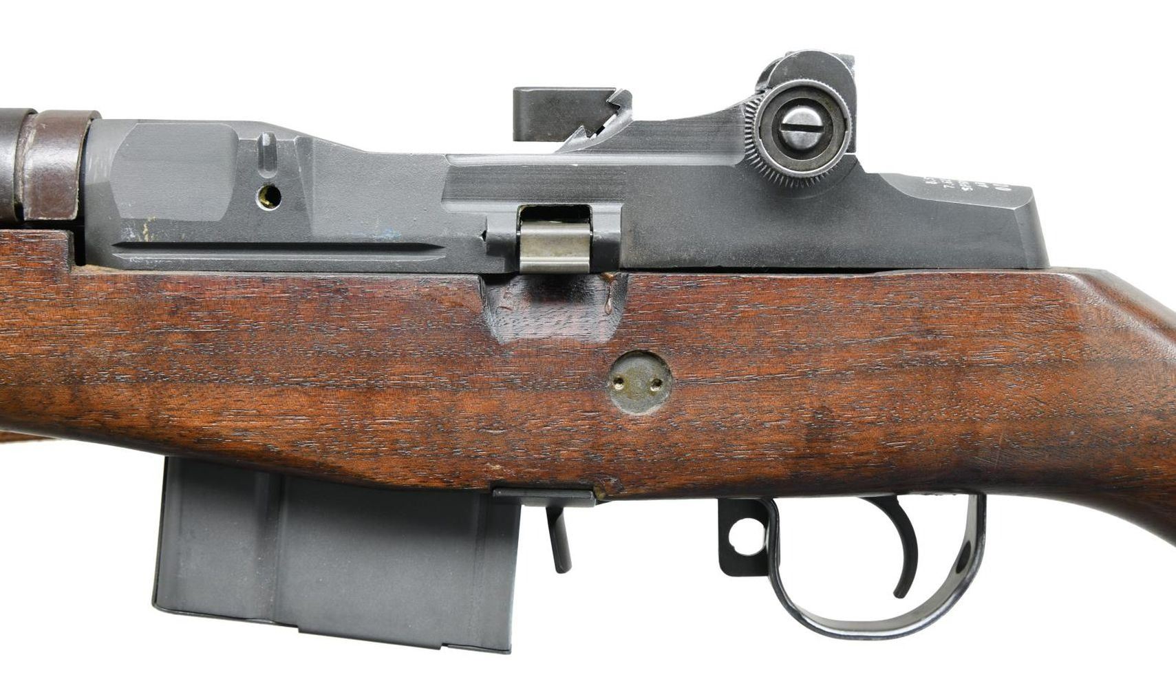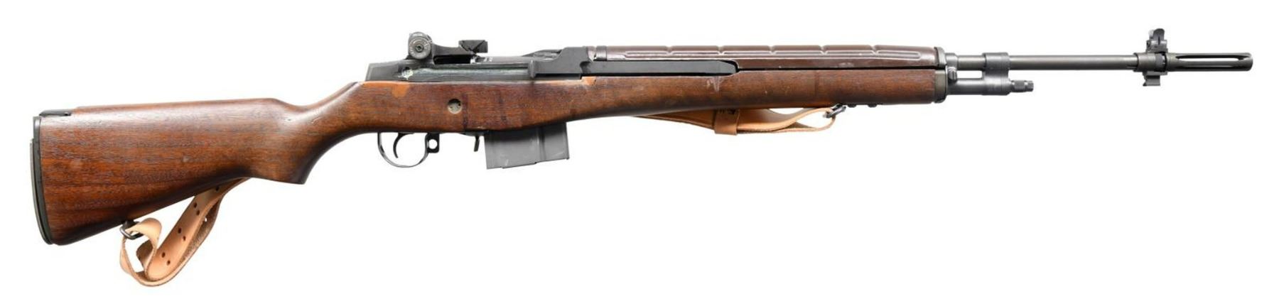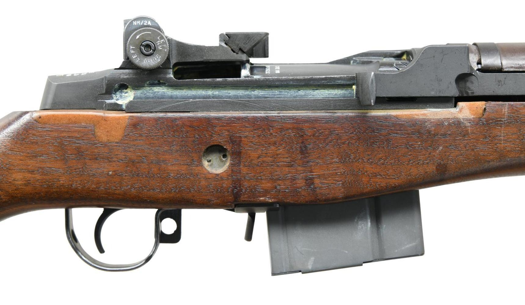 Cal. 7.62mm. S# 002445. Bbl. 25" over flash hider with bayonet lug. Consignor supplied information estimates production in October 1974. Early Springfield Armory M1A rifle, built in Devine, Texas by Springfield Armory as owned by Elmer Balance, prior to being sold to Bob Reese & relocating to Geneseo, Illinois. Receiver marked; "U.S. RIFLE / 7.62-MM M1A / SPRINGFIELD / ARMORY" above serial number 002445. Barrel marked "NM" on top, 2.5" rear of flash hider & "CA7791362 6 67 C8549 MP" on side. Protected, tapered blade front sight marked "NM062". Rear sight marked "NM / 2A" w/ peep marked "595". Bolt marked "7790186 / Z1C", & stenciled "002445". Trigger housing marked "7267030 66118". Hammer marked "C46008-2 SA". USGI M14 stock, bedded. Marked serial number "002445" in barrel channel. Tan leather Springfield sling. MAGS: 1 steel Check-Mate 10rd. UNATTACHED ACCESSORIES: Black plastic foam lined case, photo of Data Sheet for rifle matching all visible markings, illustrating build date October 1974 in Devine, Texas. CONDITION: Finish complete & consistent w/ some light thinning in areas of mechanical intervention & around scope mount. Action lightly coated w/ grease. All markings filled white for easy reading. Stock in nice condition w/ a few typical impressions as well as a few heavier impressions on right side, forward of action. Bright bore w/ strong rifling. Fire control mechanism appears to function correctly when cycled by hand. (23-5439/JZ). MODERN. $3,000-5,000.