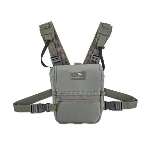 Bino Chest pack, padded mesh, complete containment design to protect from outside elements, secures open & closed w/ magnets on the bottom & top of the pack, durable fleece liner for silent operation, stretch side pockets, rear cell phone pocket, stretch front zippered pocket, MOLLE attachment on bottom of pack, includes padded mesh harness w/ removable safety tethers