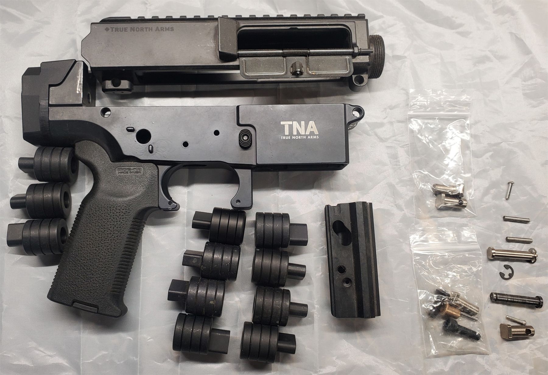 Includes an assortment of Wk parts including pins, charging handles, brass bushing, carrier, a prototype TNA enhanced upper and a Gen 1 lower. Intended as a spare parts kit for gunsmiths.
